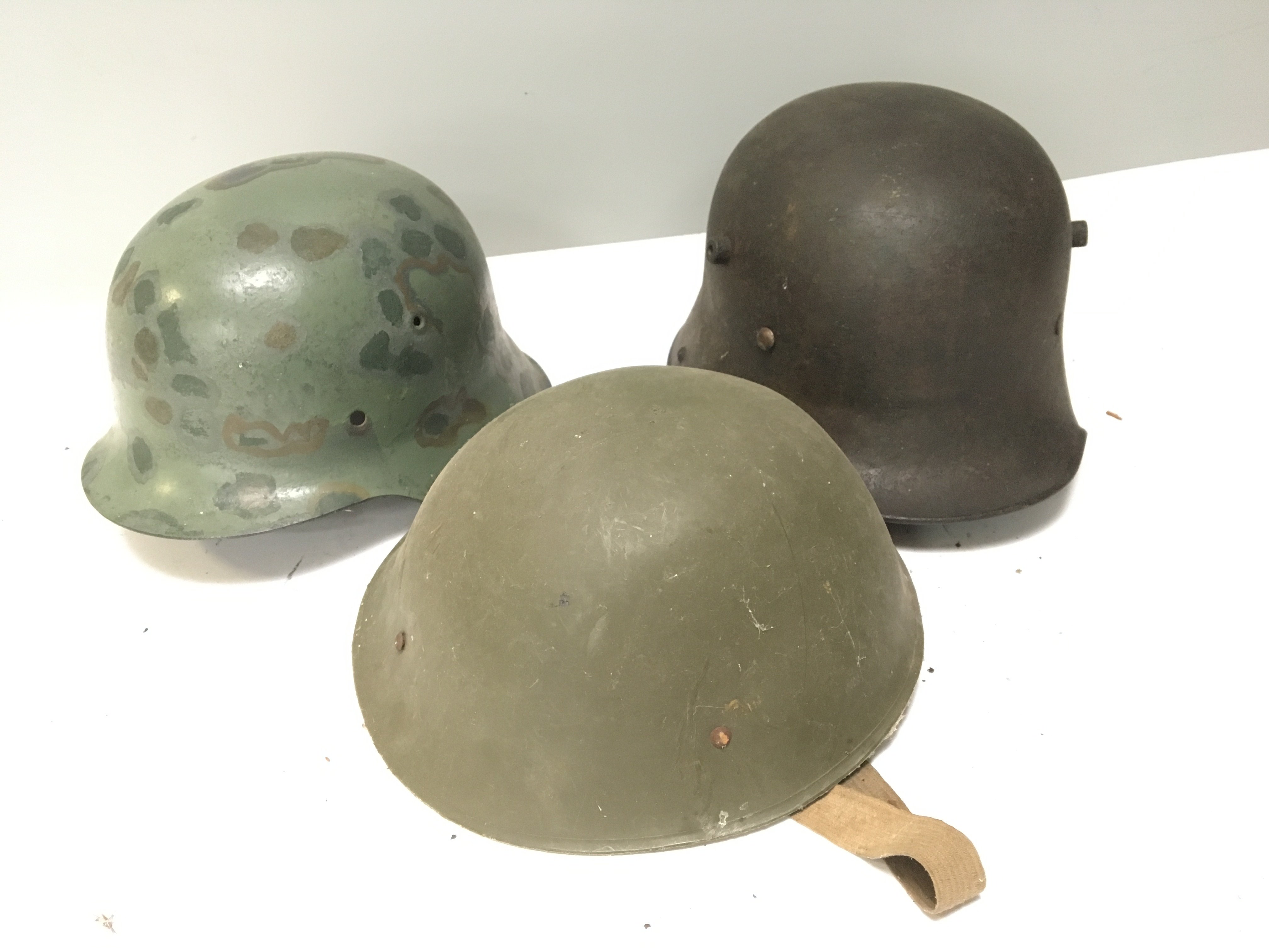 A German I world war M16 helmet a German Third Reich M-42 helmet and an unusal British Military issue light weight Merit plastic helmet (3)