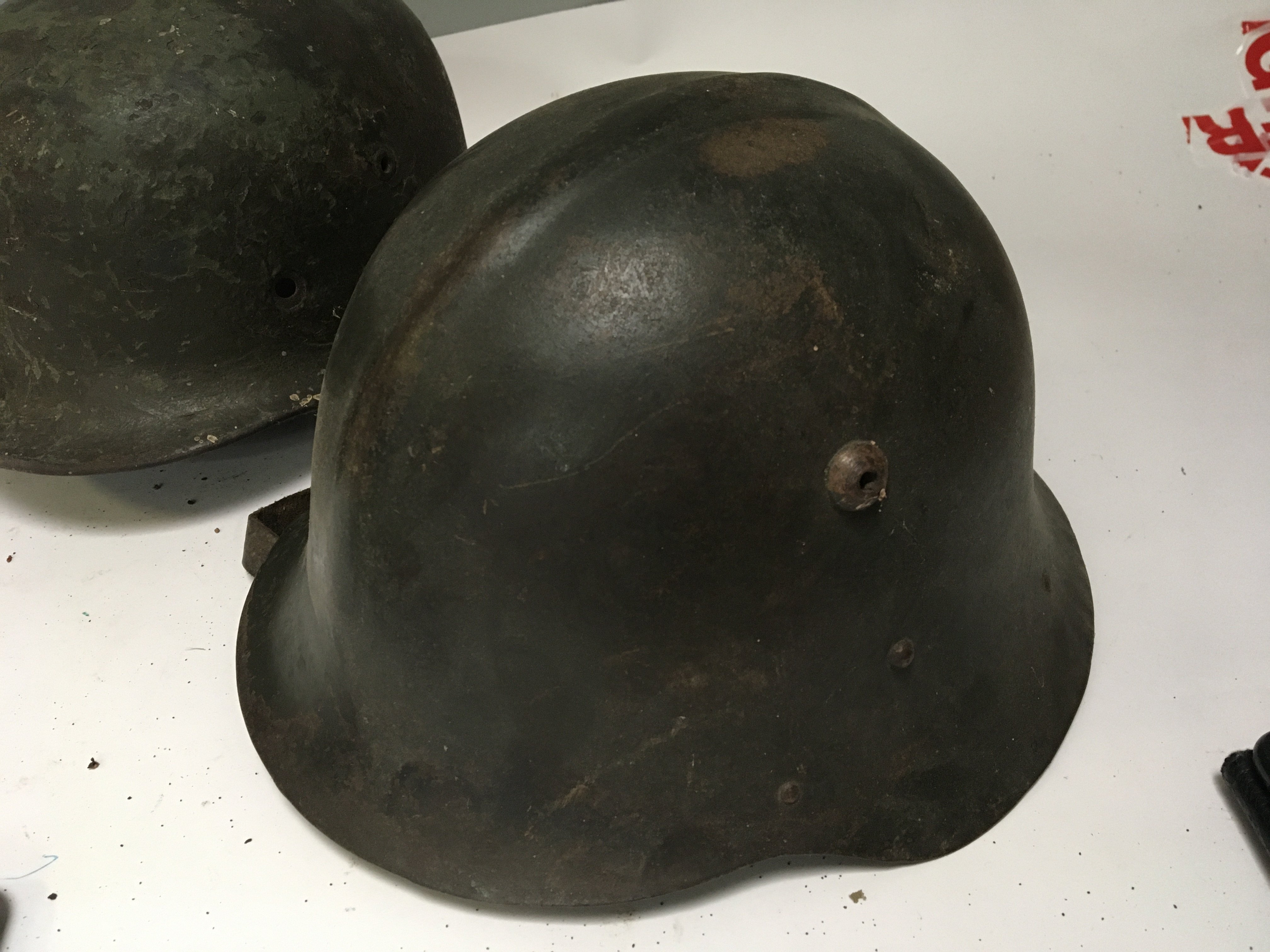 An interesting German steel combat helmet with worn single side decal and a ribbed top original leather lined and a rediscovered dig find Luftwaffe helmet distressed battle condition and one other M42 helmet (3)