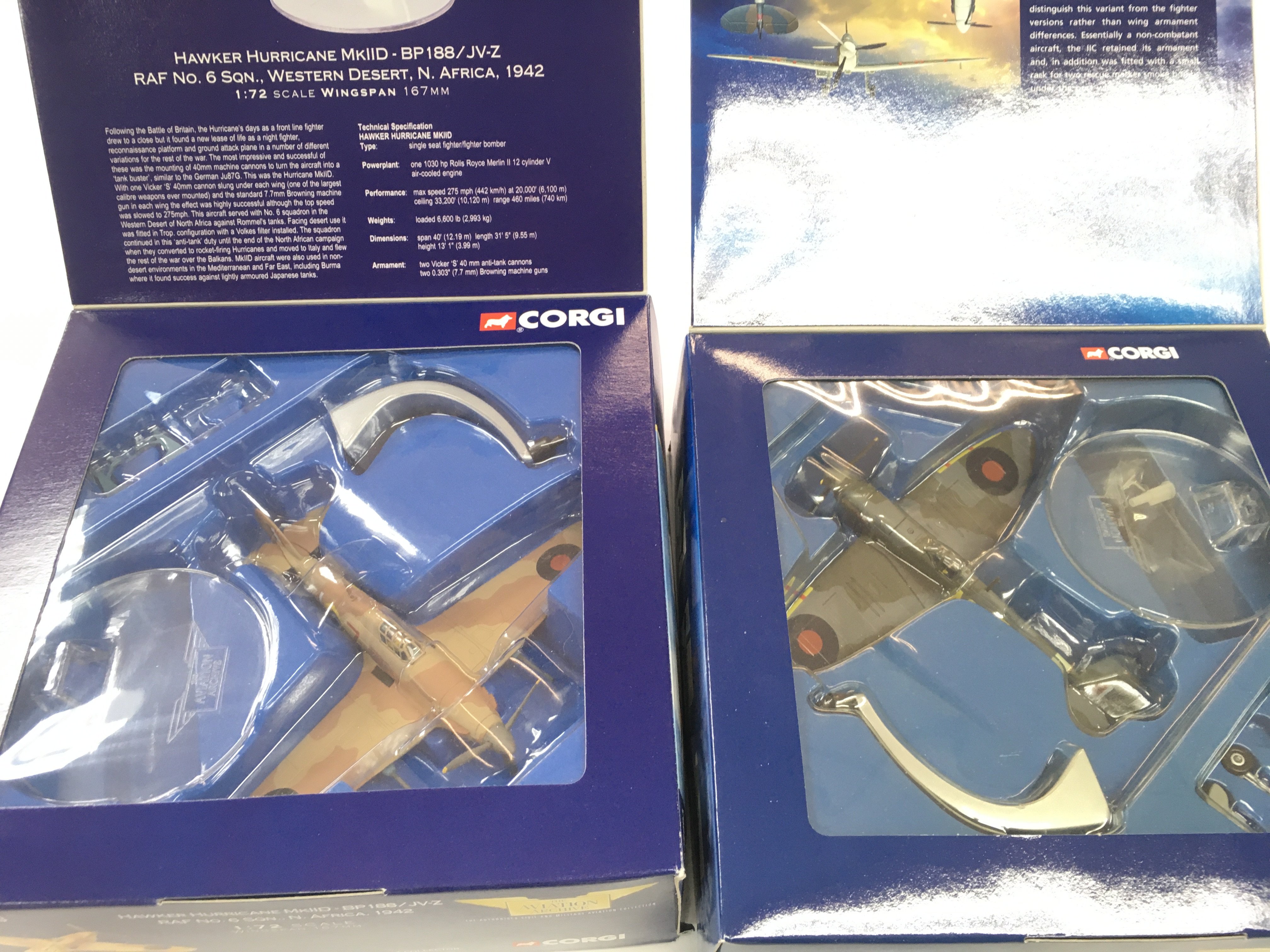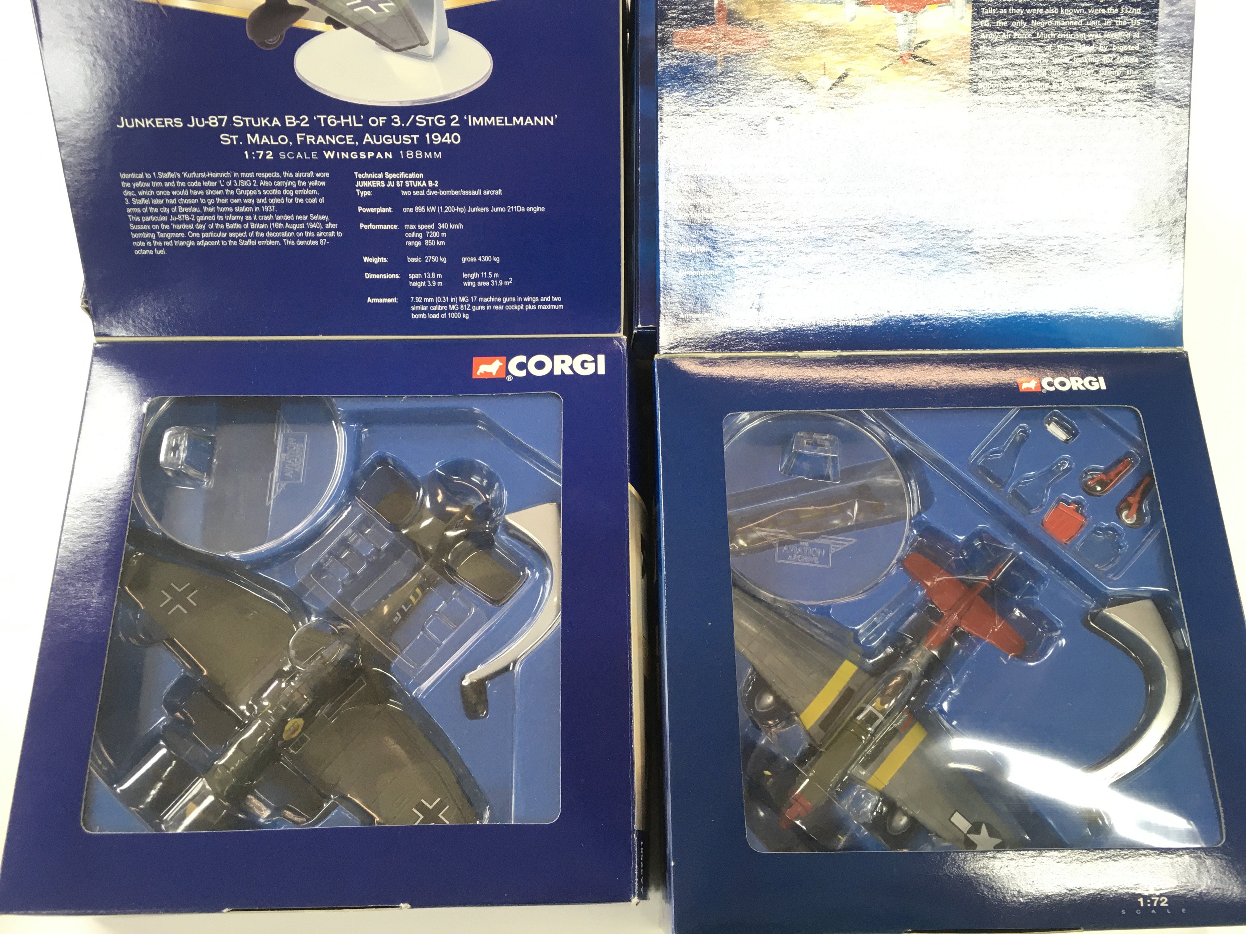 4 X Boxed Corgi Aviation Aircraft. A Junkers JU-87. A P51D Mustang. A Supermarine Spitfire And A Hawker Hurricane. 1/72 Scale No Reserve.