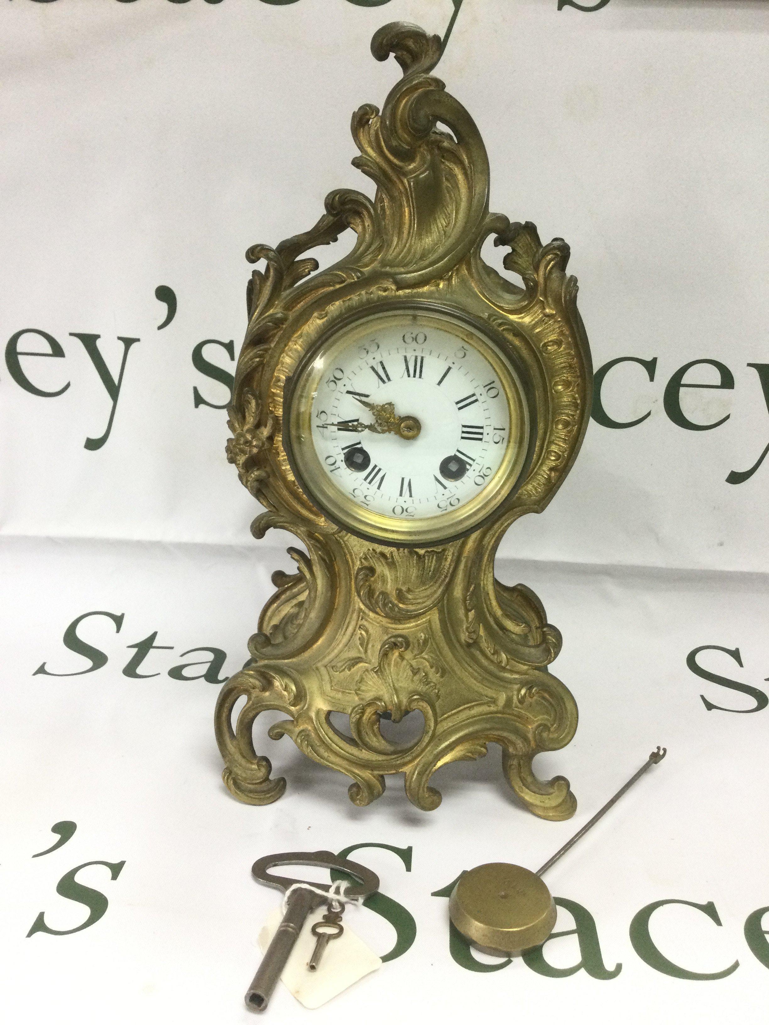 An eight day spelter mantle clock with pendulum and key, approx height 32cm. Shipping category D.
