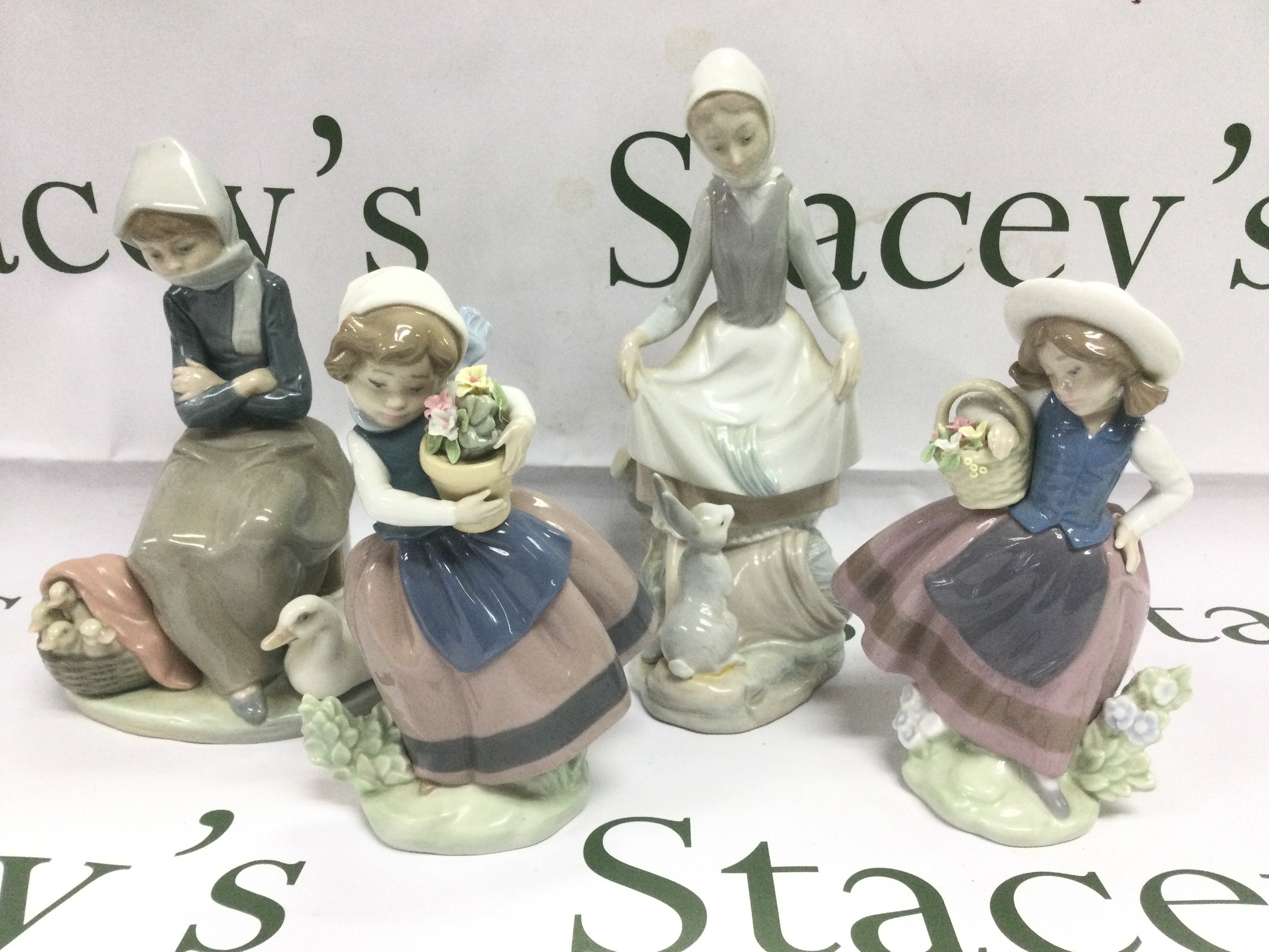 Four Lladro figures of girls and animals, tallest approx 23cm. Shipping category D.