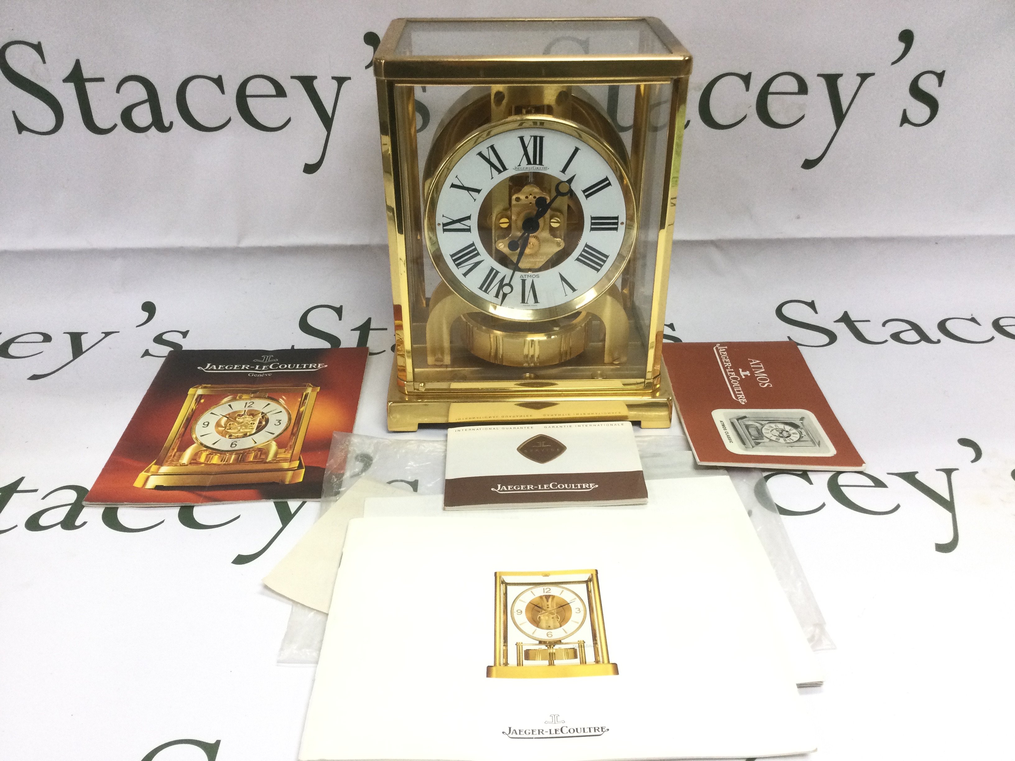 A boxed Jaeger Le Coultre atmos clock with Roman numeral dial and related paperwork. Shipping category D.
