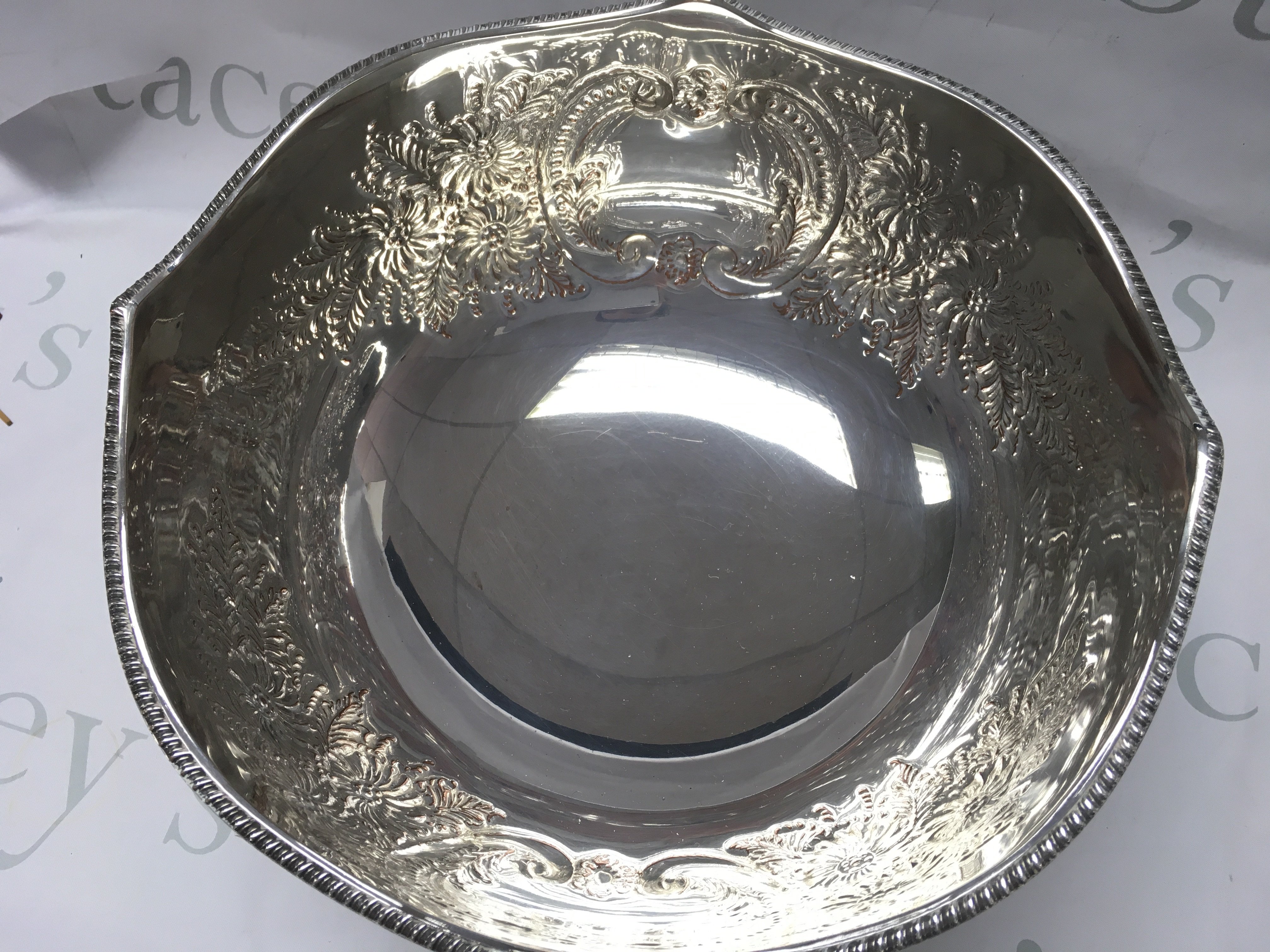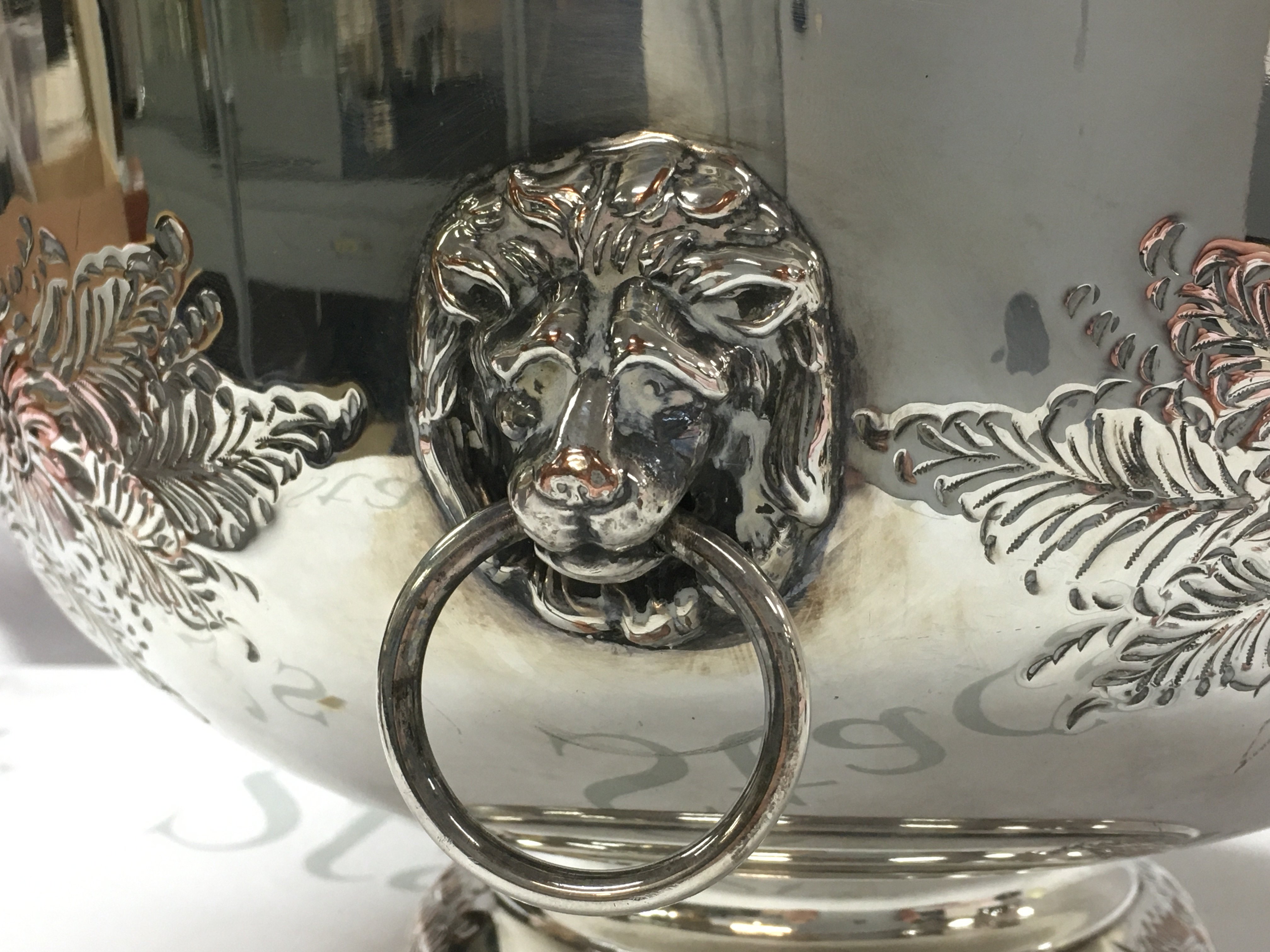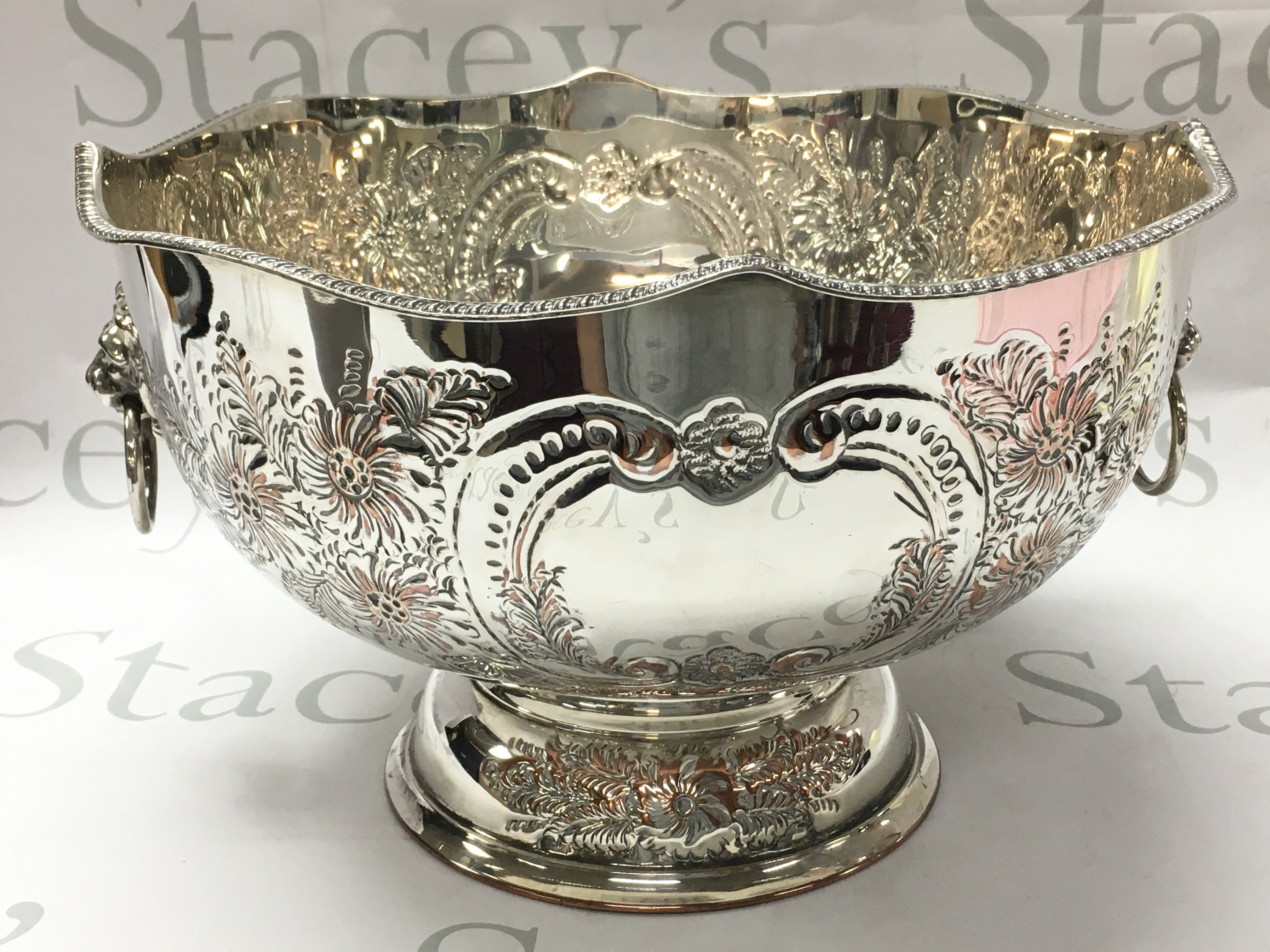 A silver plated punch bowl with floral decoration & lions head handles , 32cm wide 20cm tall