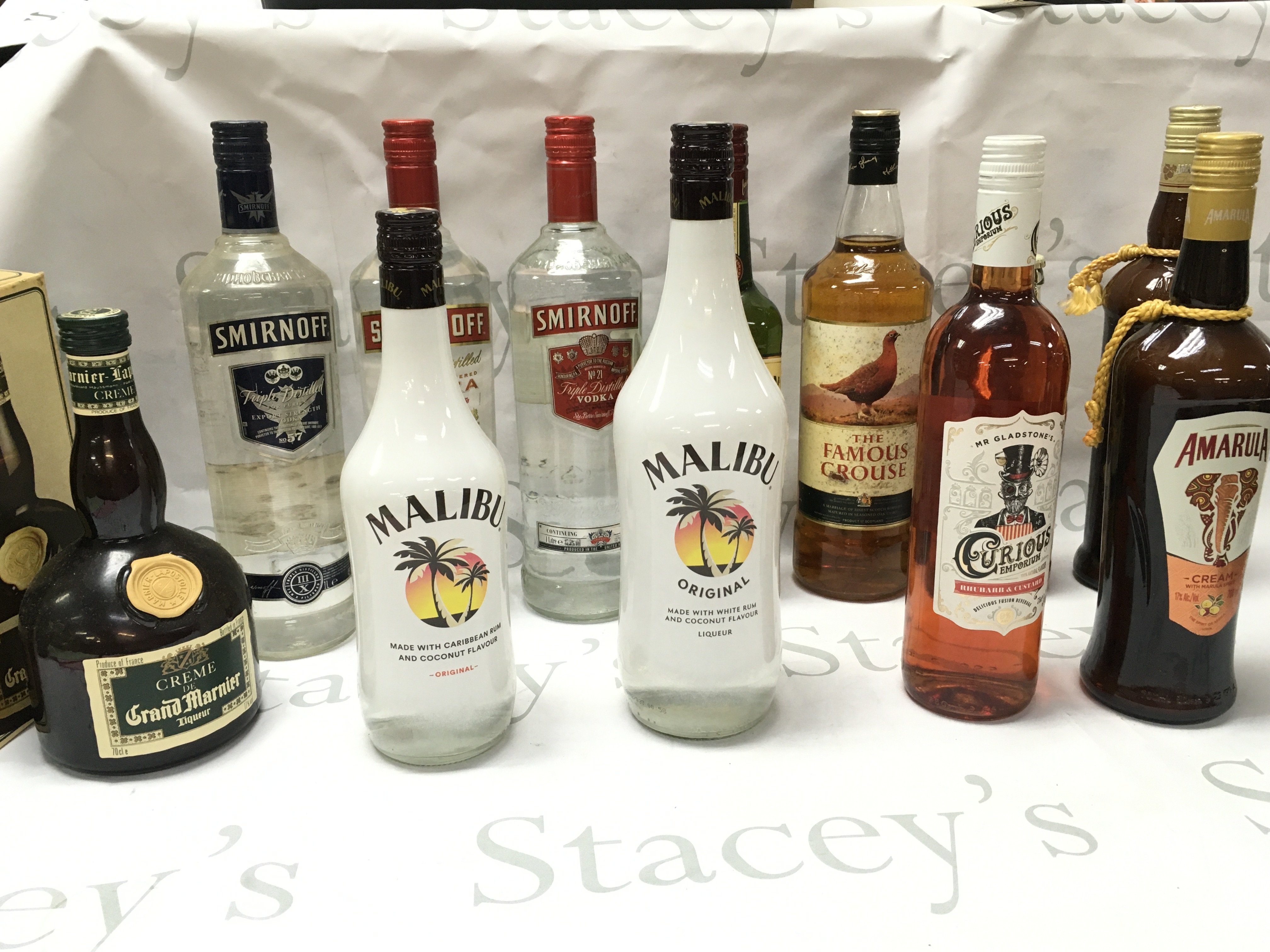 A collection of spirits including Smirnoff, Famous Grouse, Creme de Grand Marnier, Malibu , Jameson Irish Whiskey etc