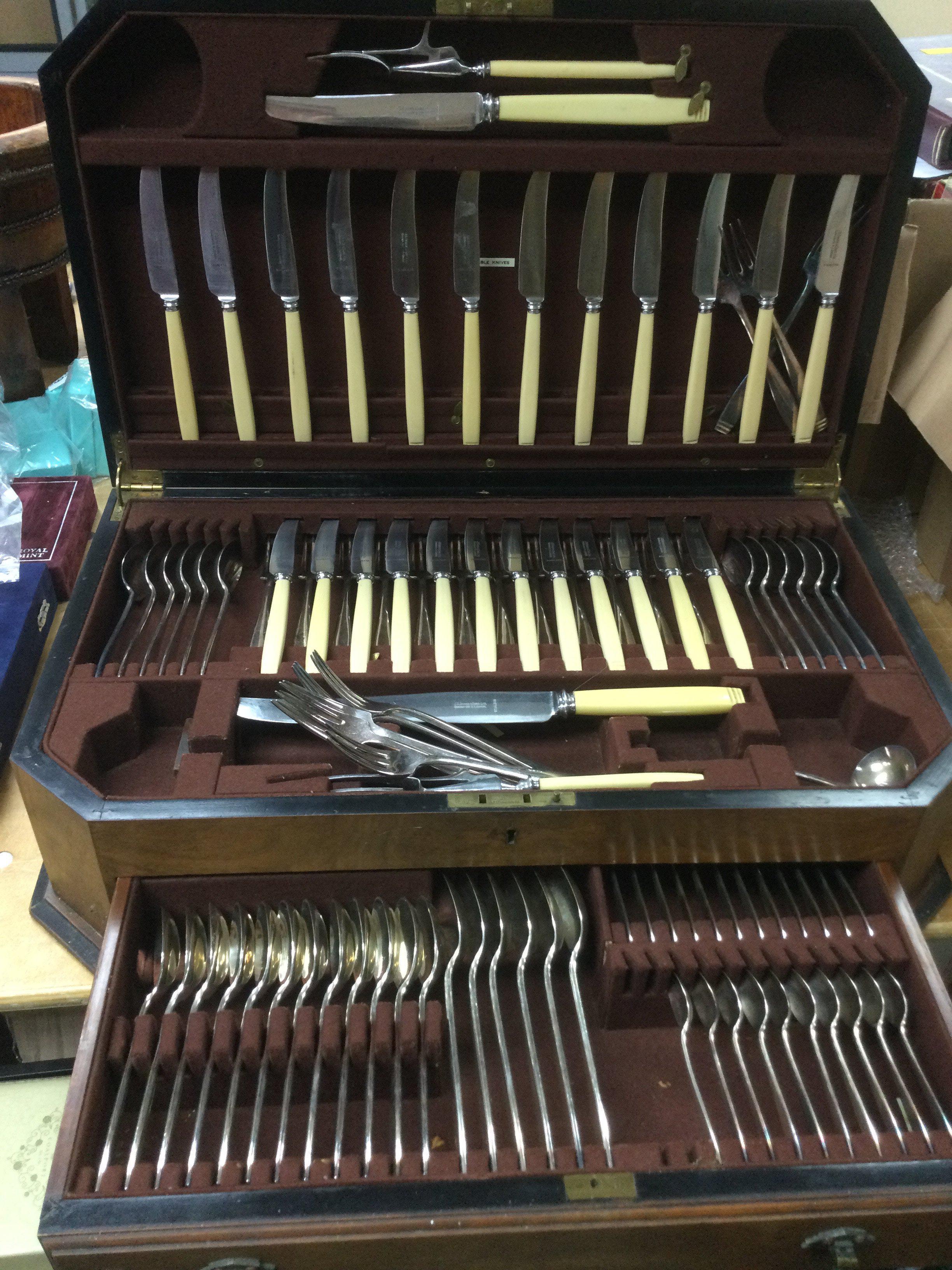 A cased canteen of cutlery comprising Elkington and JR Ogden & Sons examples. Shipping category D.