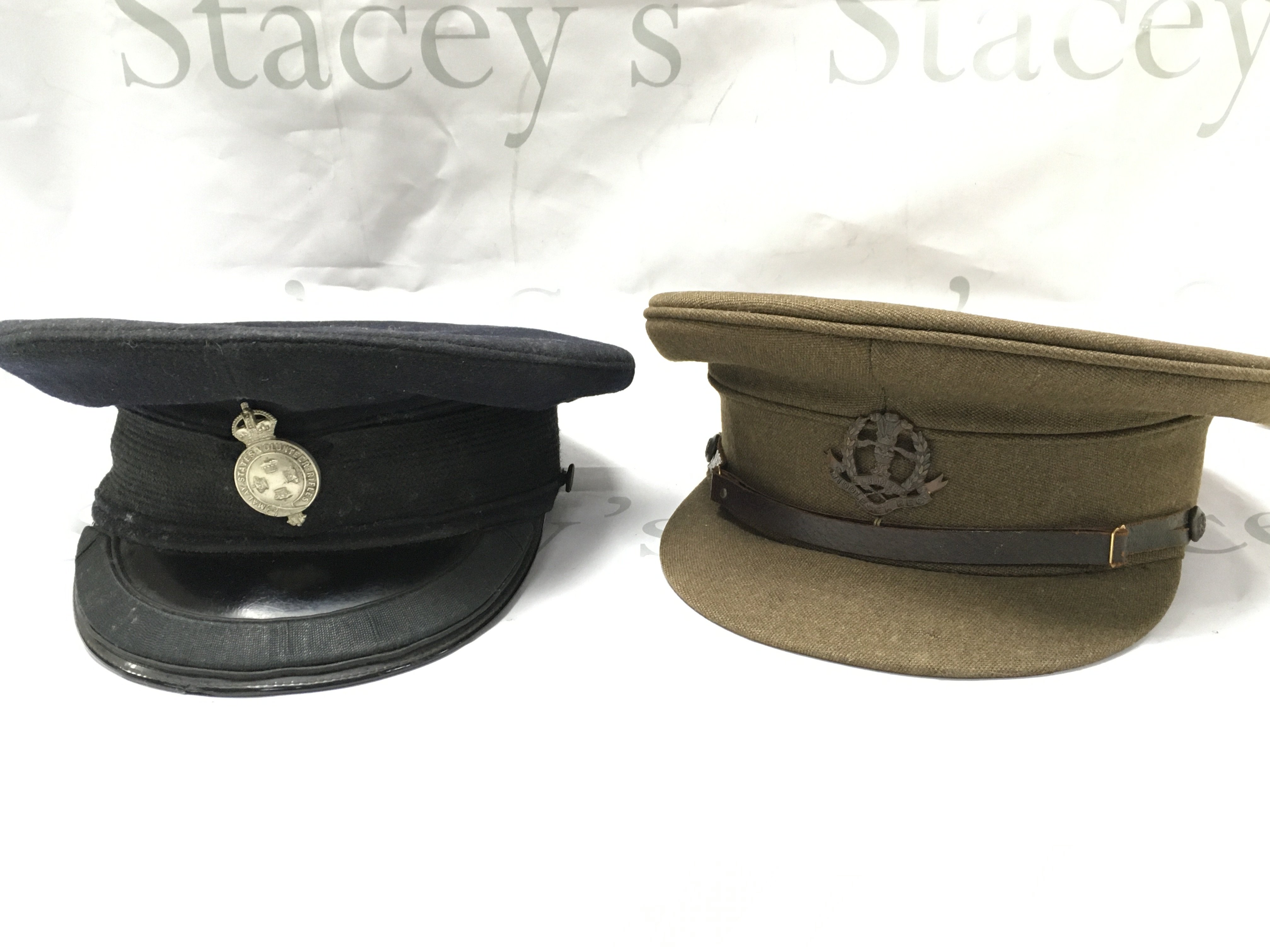 A collection of military hats including a Malay States Volunteer Rifles officers cap and a Middlesex Reg officers cap and leather leggings. This lot cannot be posted