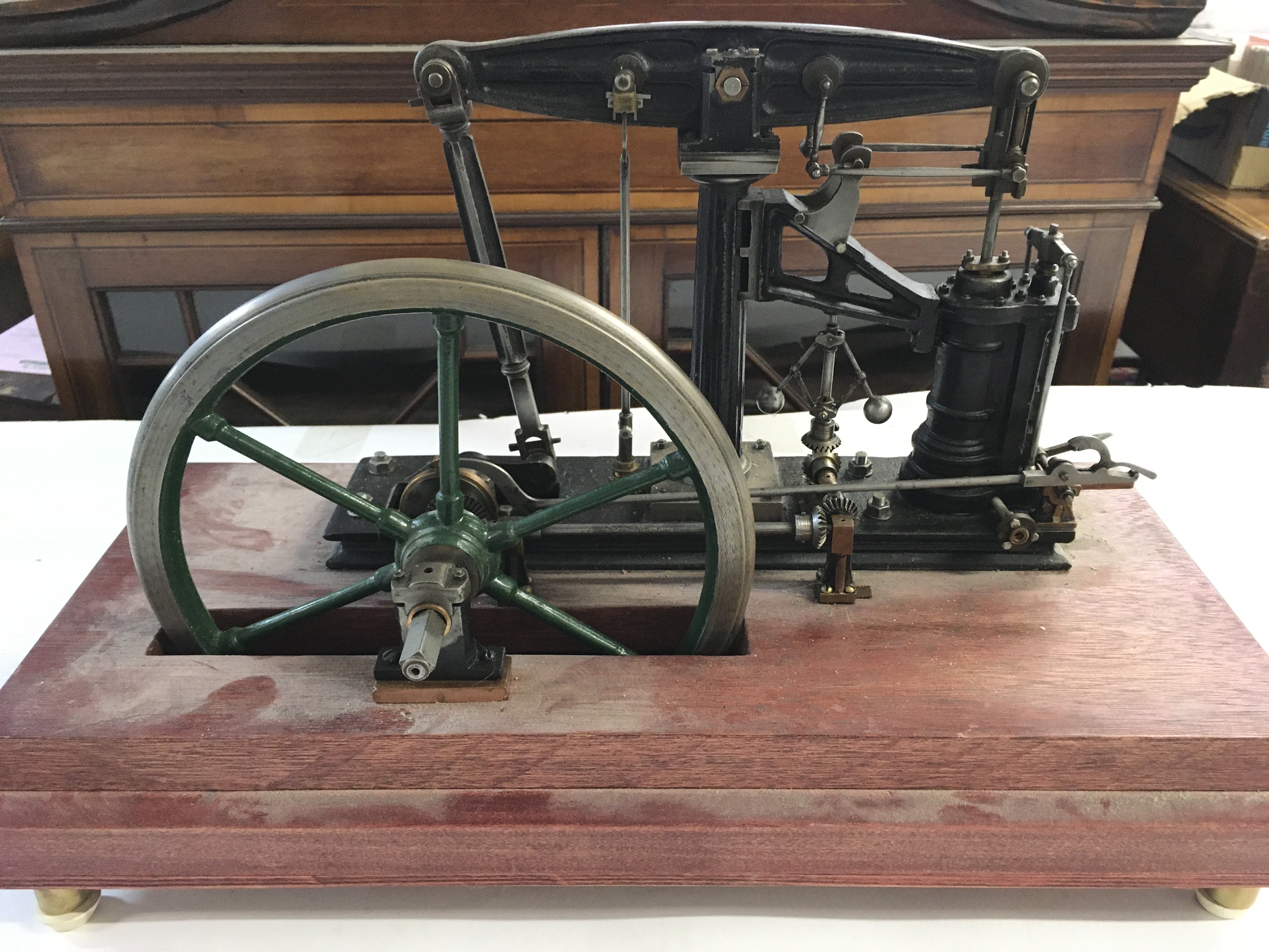 A Live Steam Beam Engine on Wooden Plinth With 9 inch Flywheel.