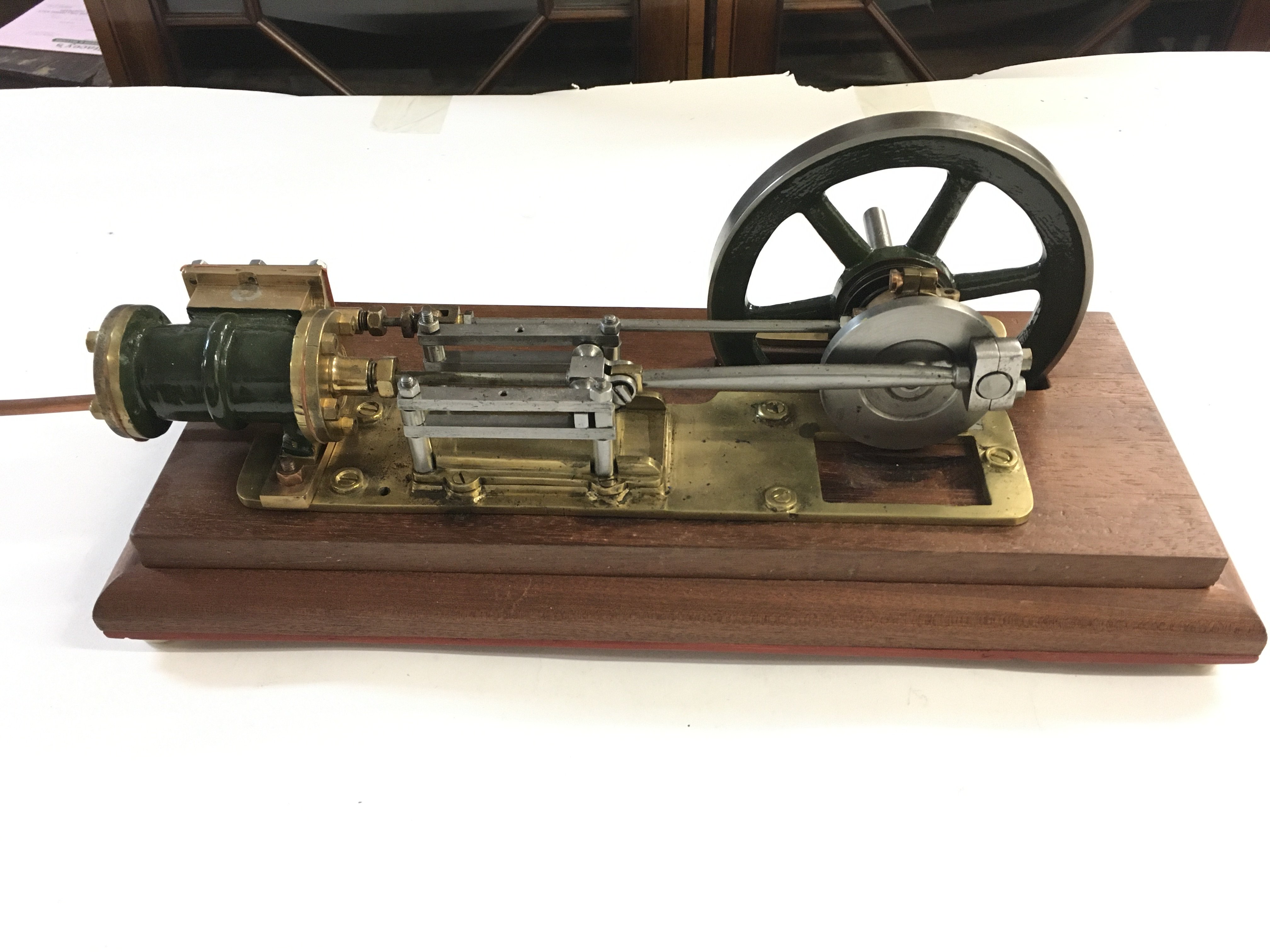 A Horizontal Steam Engine On A Wooden Plinth. Approx length 40Cm. Height 16Cm.