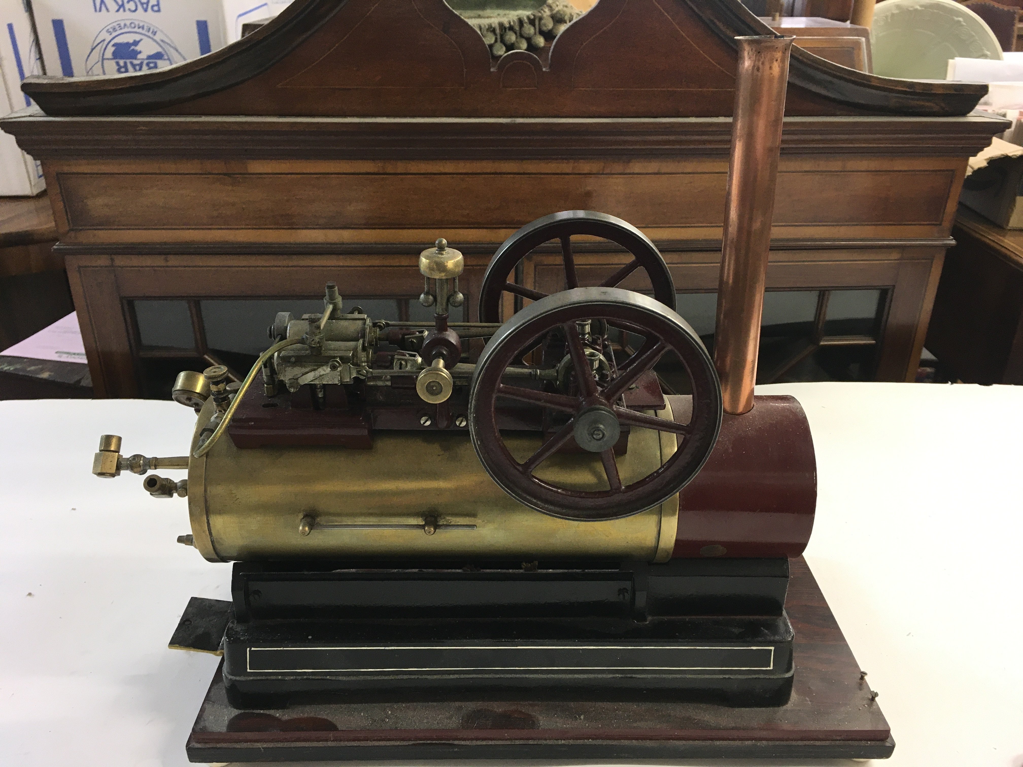 A Model Steam Boiler On Wooden Base. Approx Height 35Cm. Length 40Cm.