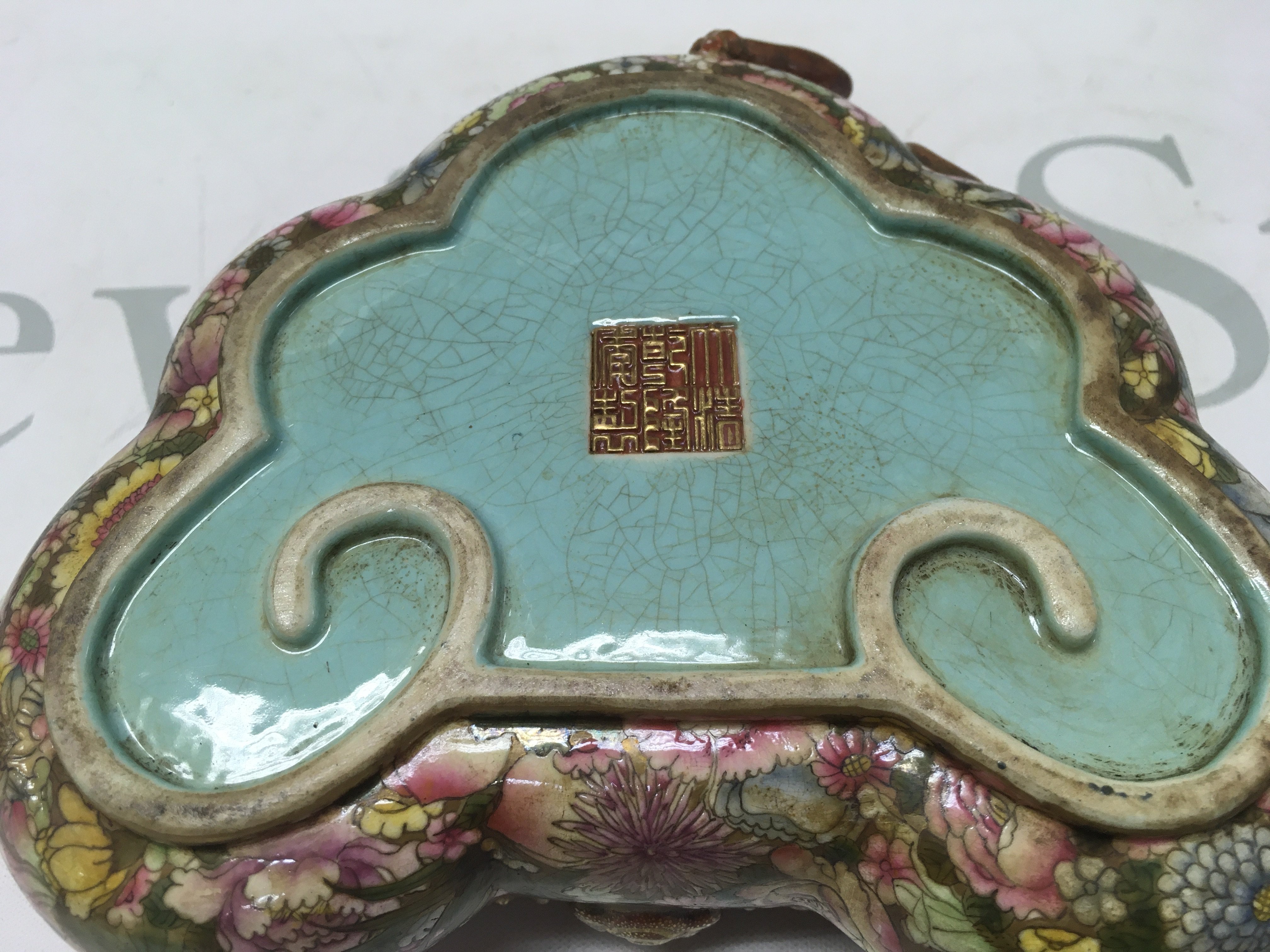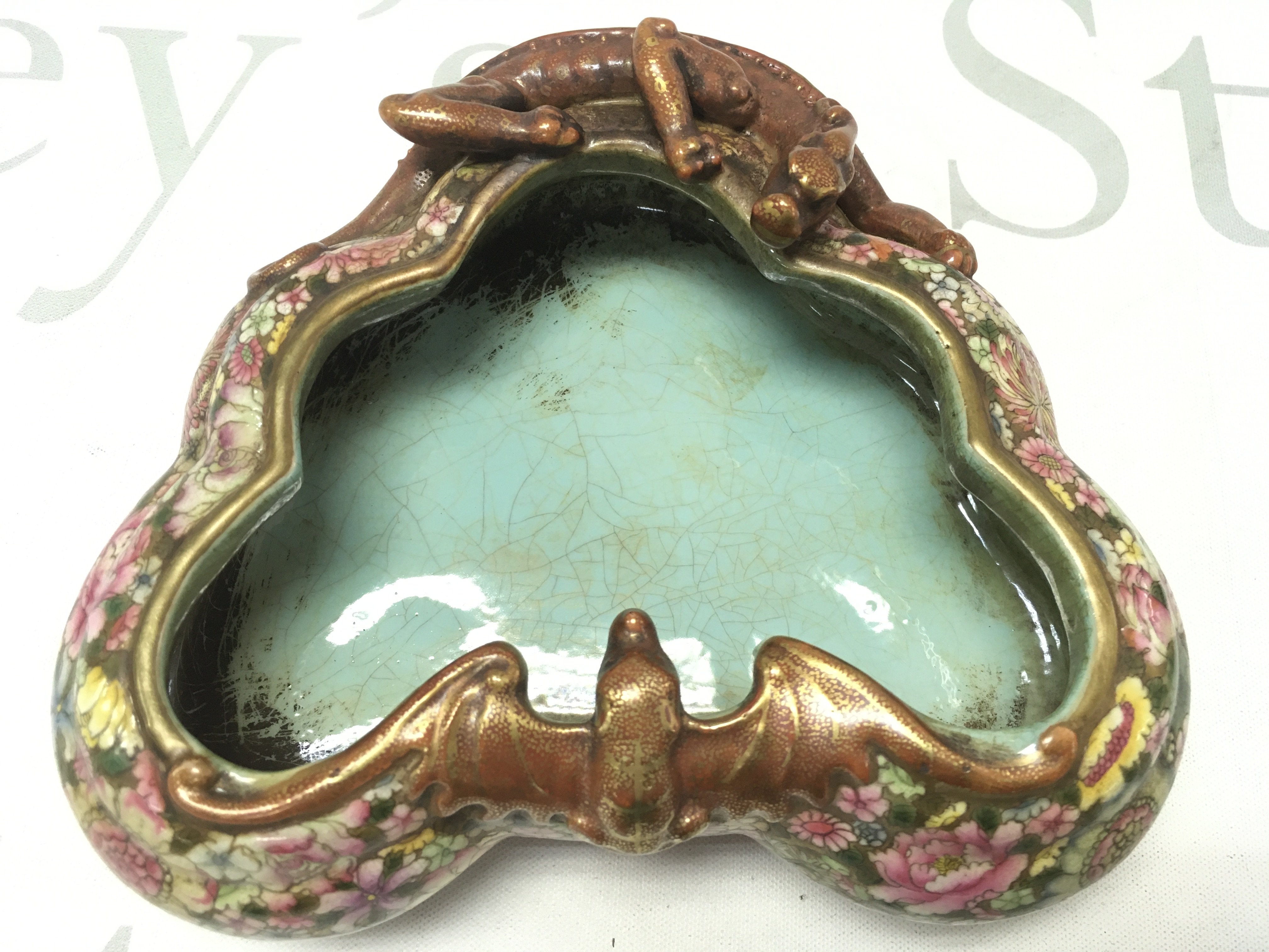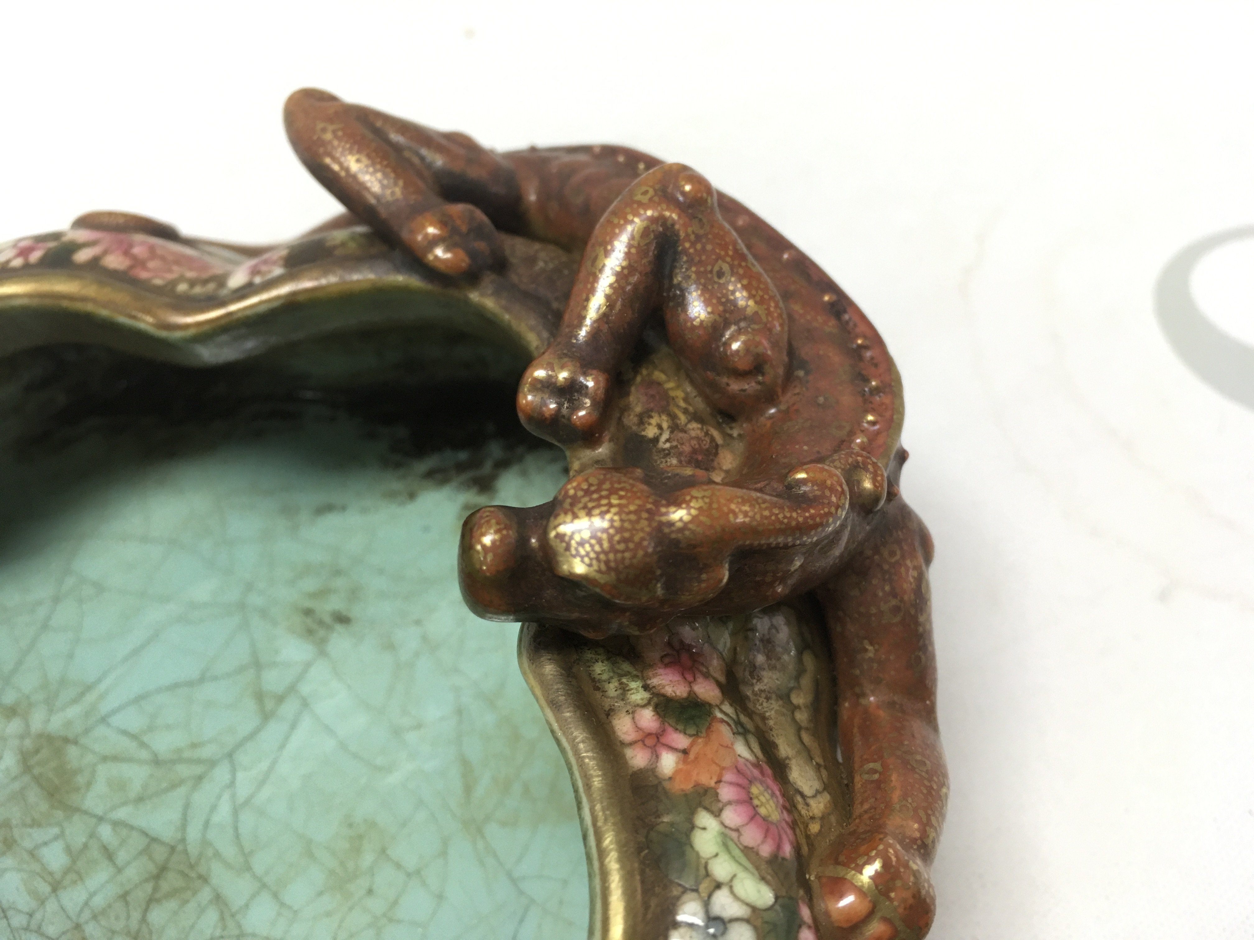 A Chinese Famille Rose Dragon dish, six figure iron red and gilt character marks to the base , with crazing and some small flaws but no obvious large damage or restoration. this lot cannot be posted.
