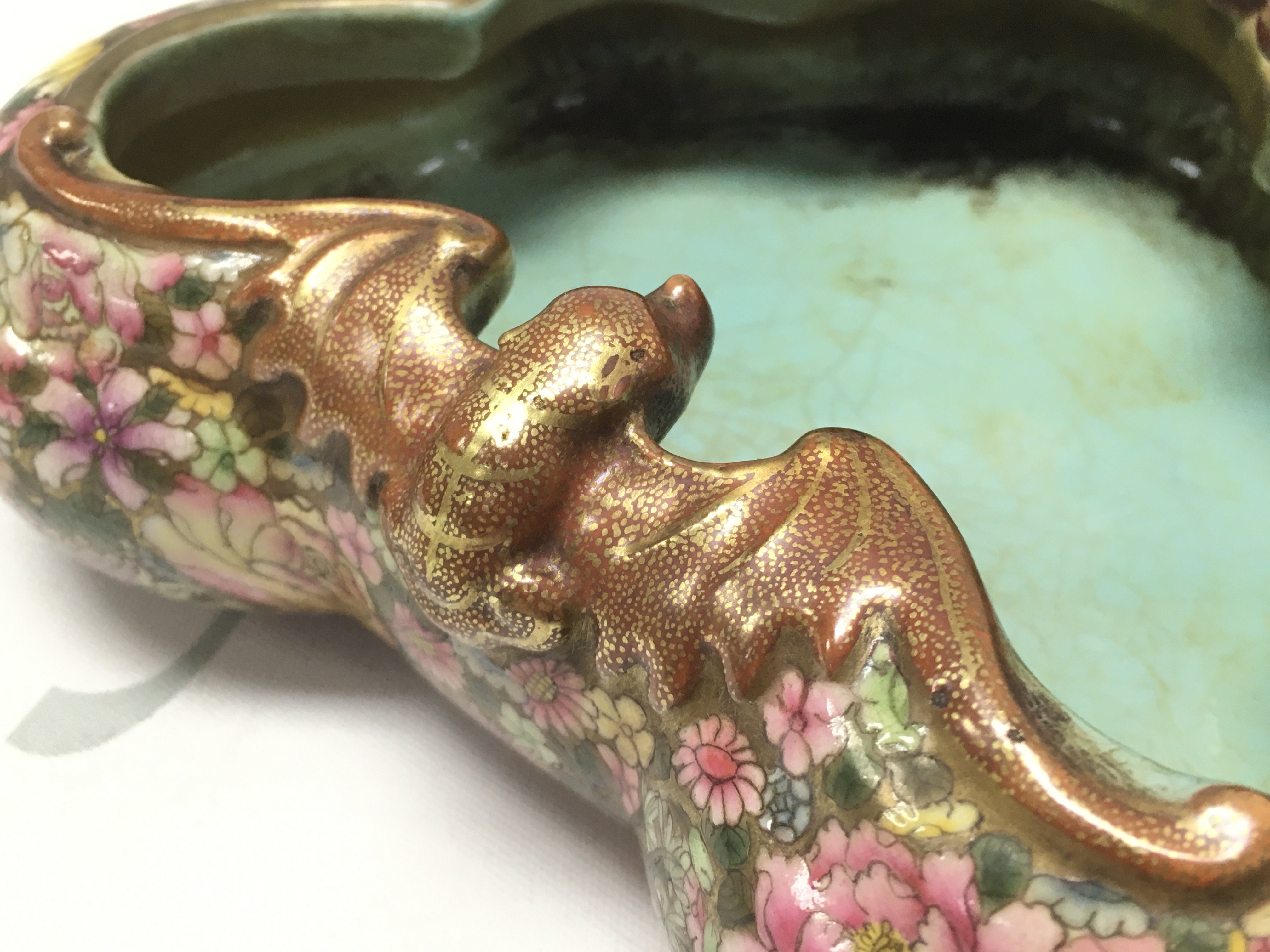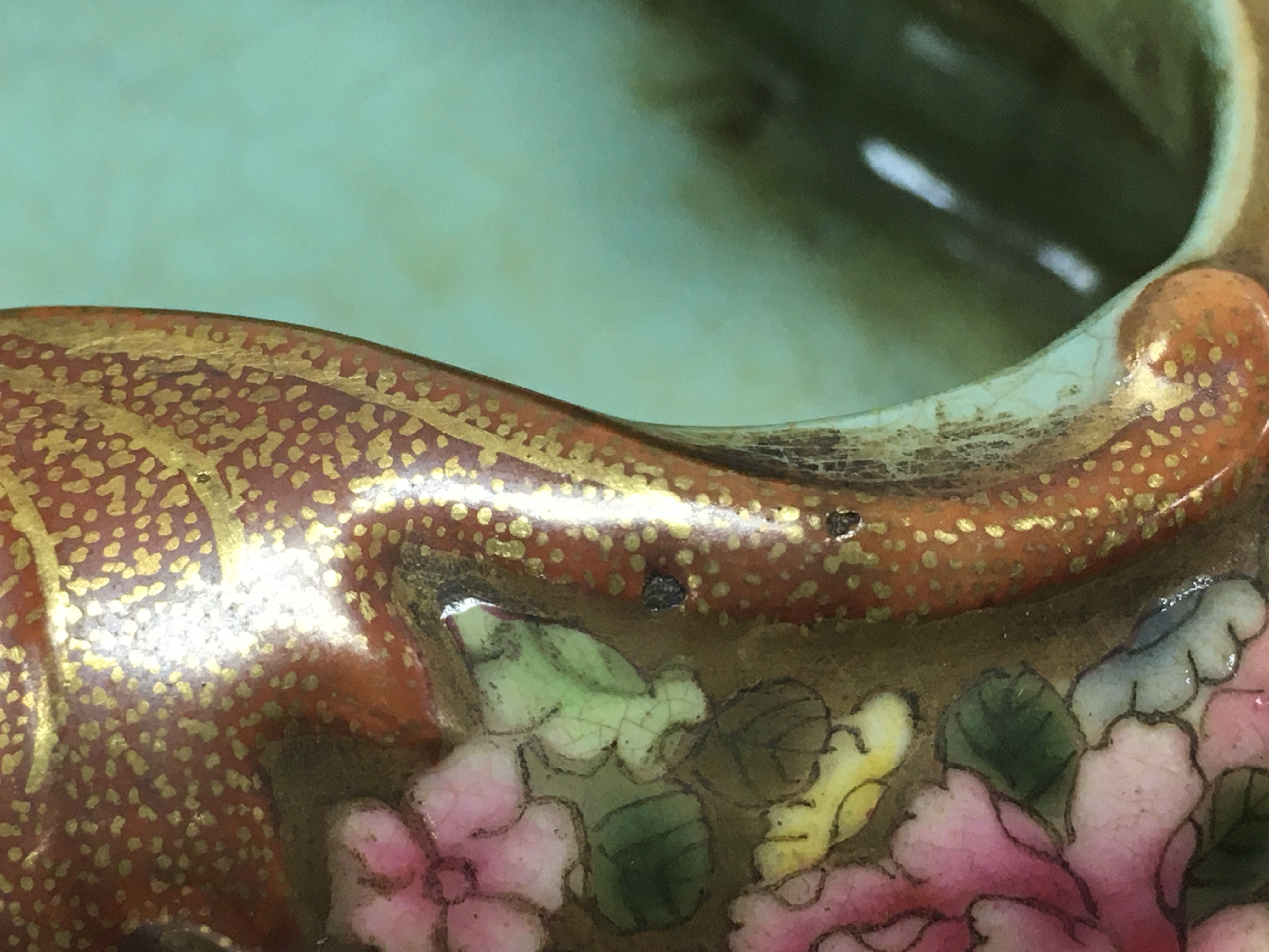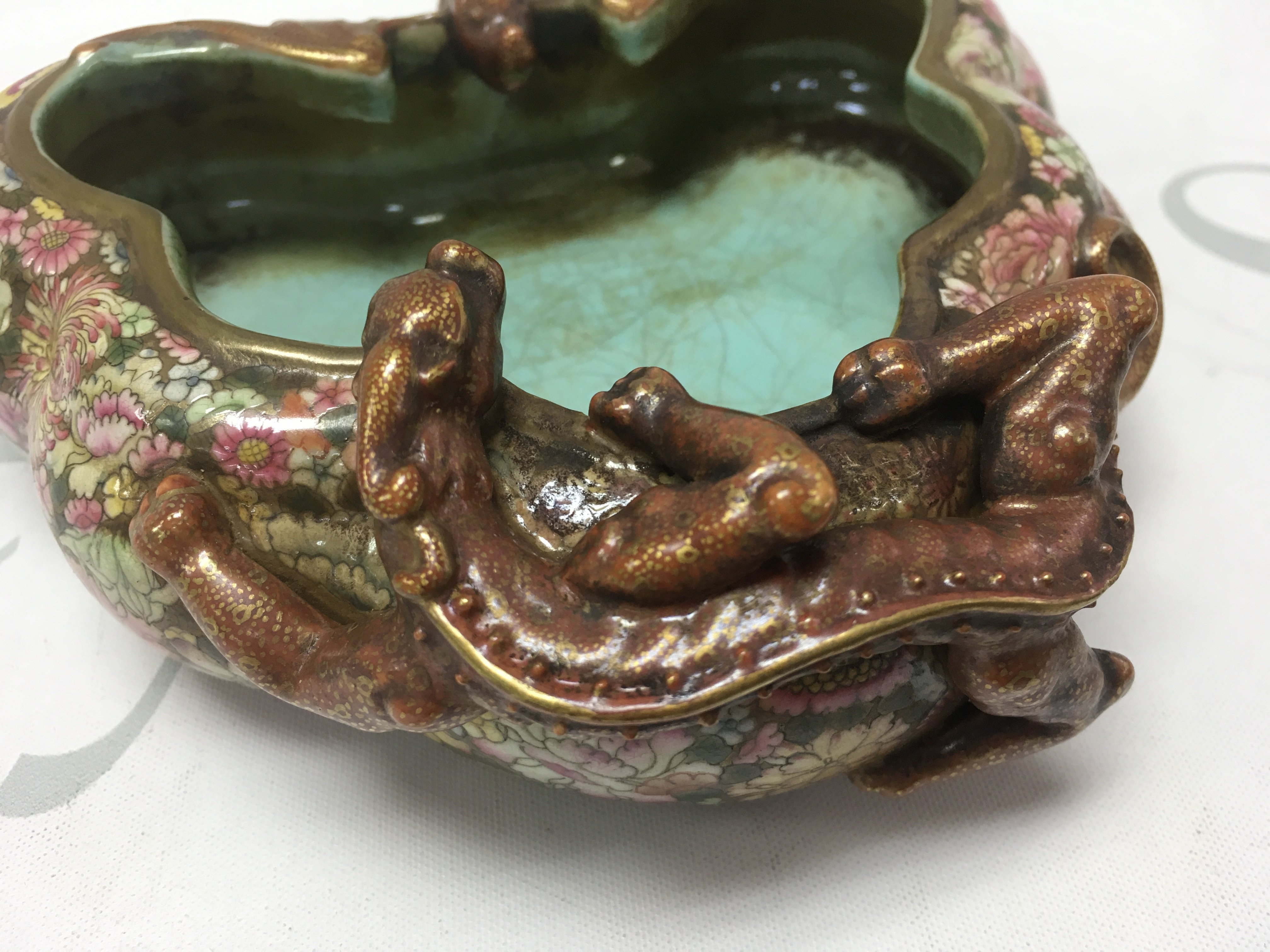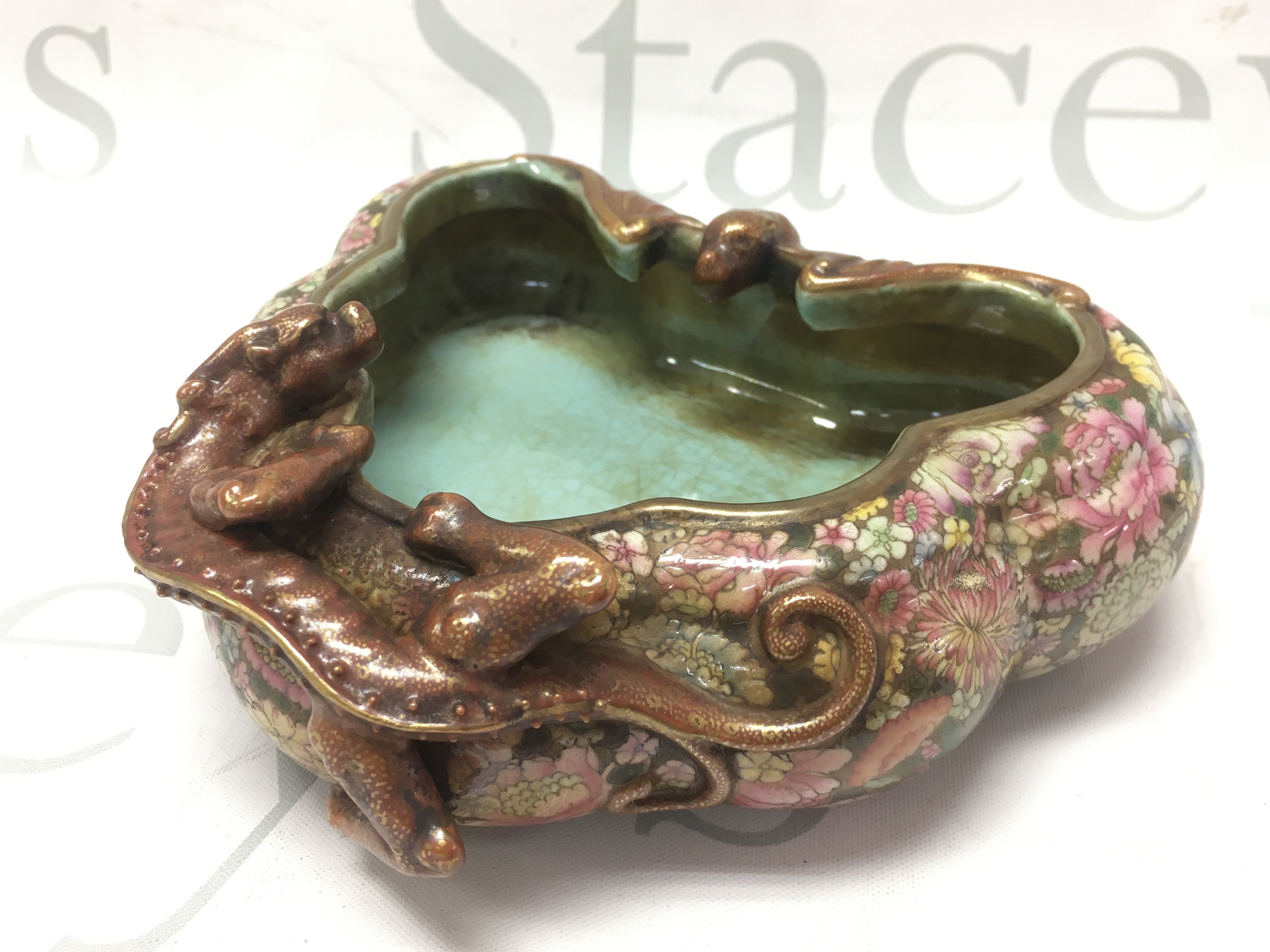 A Chinese Famille Rose Dragon dish, six figure iron red and gilt character marks to the base , with crazing and some small flaws but no obvious large damage or restoration. this lot cannot be posted.