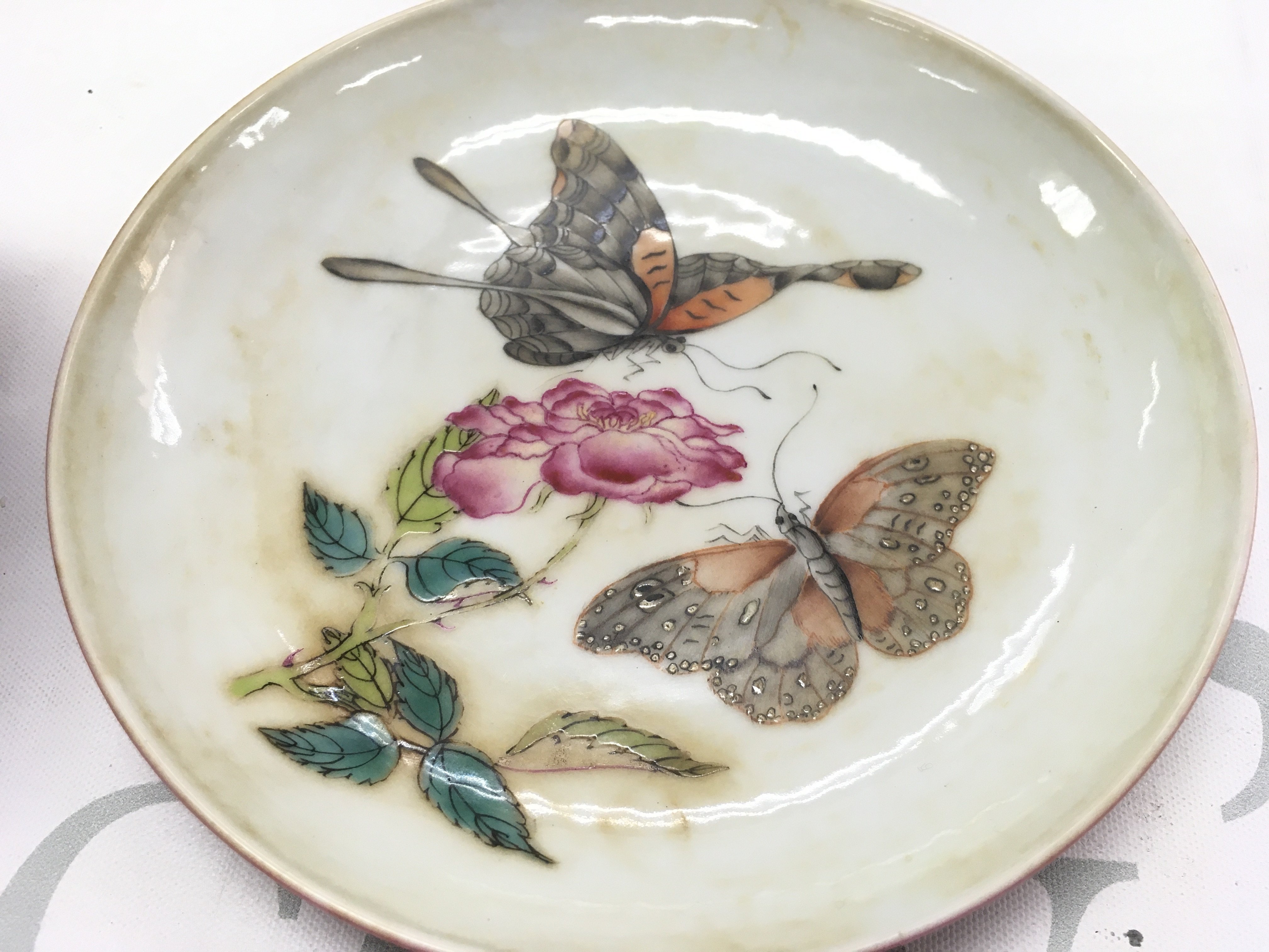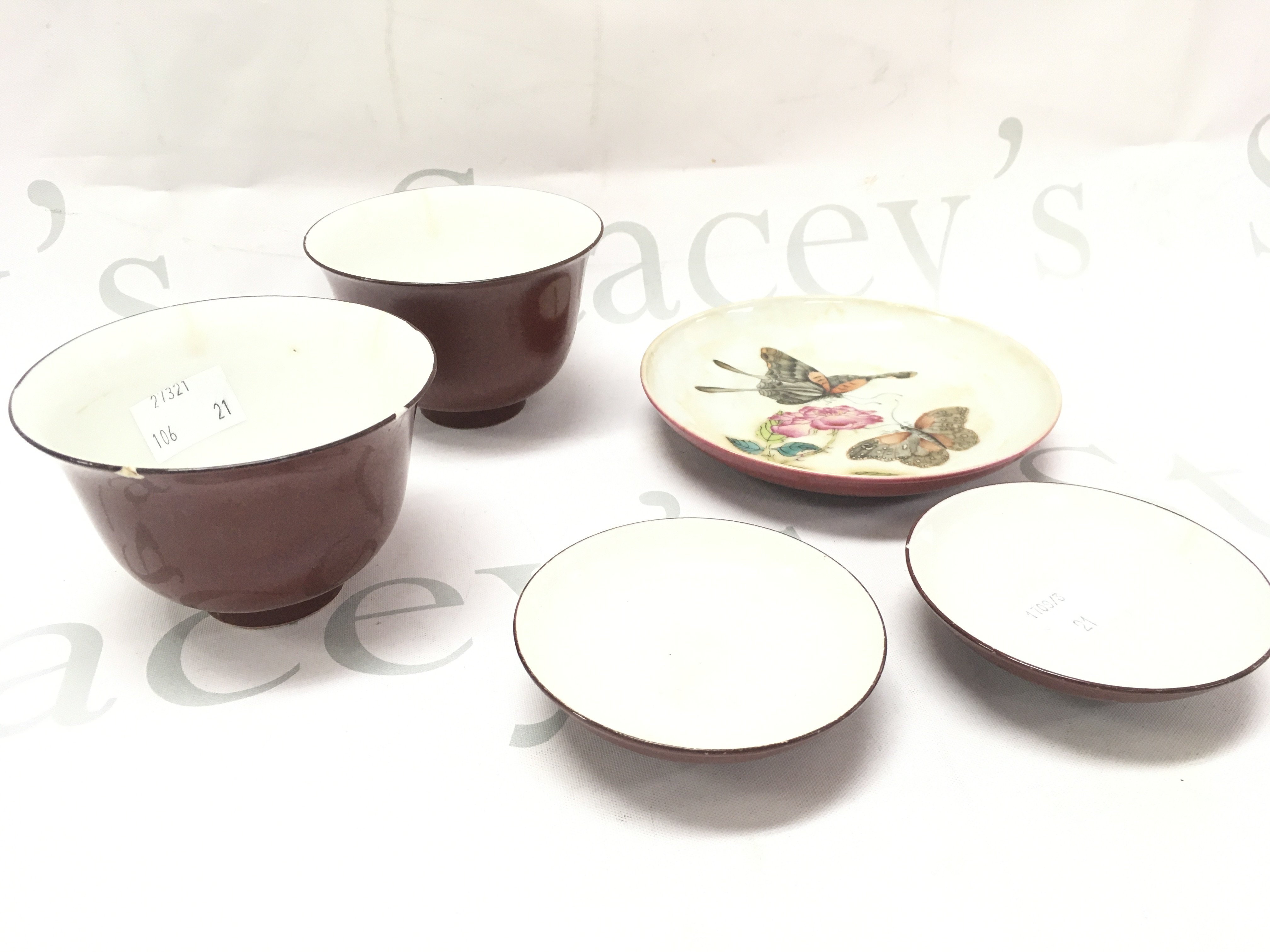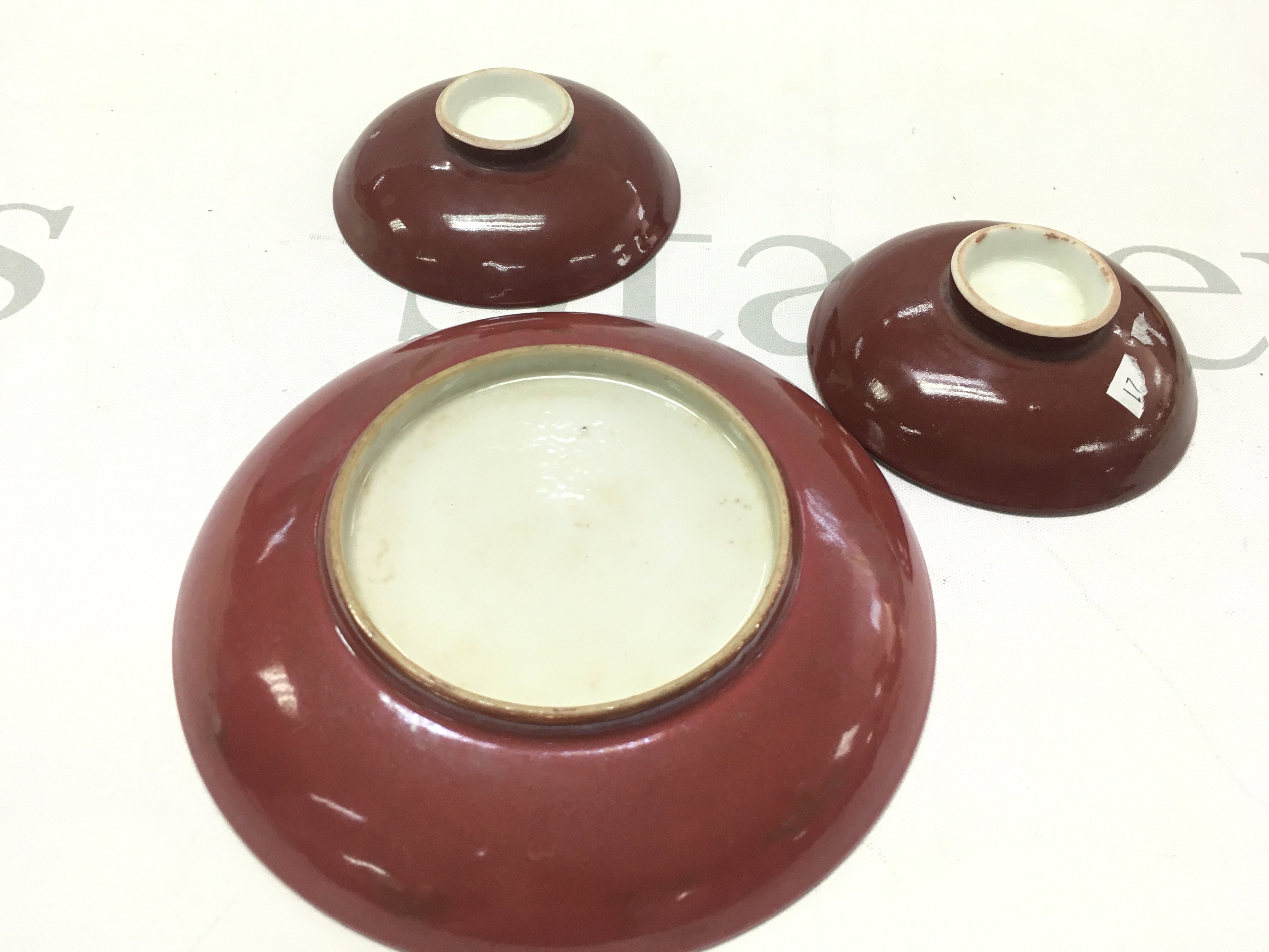 Chinese red glazed bowls and dishes including a butterfly and flower decorated dish. Some chips. This lot cannot be posted