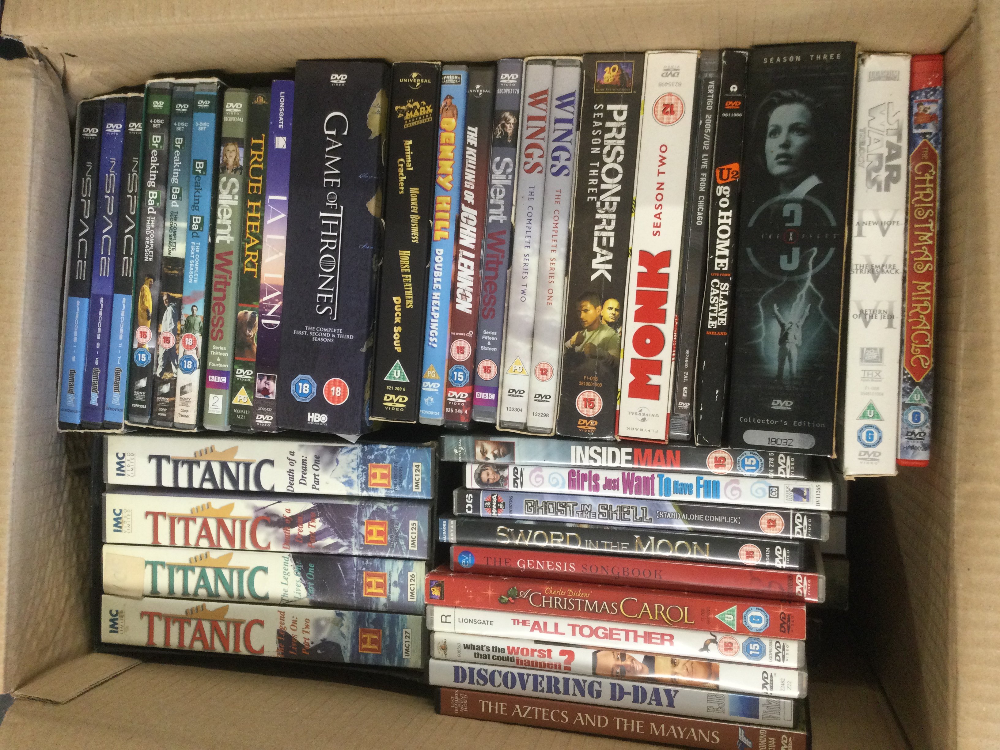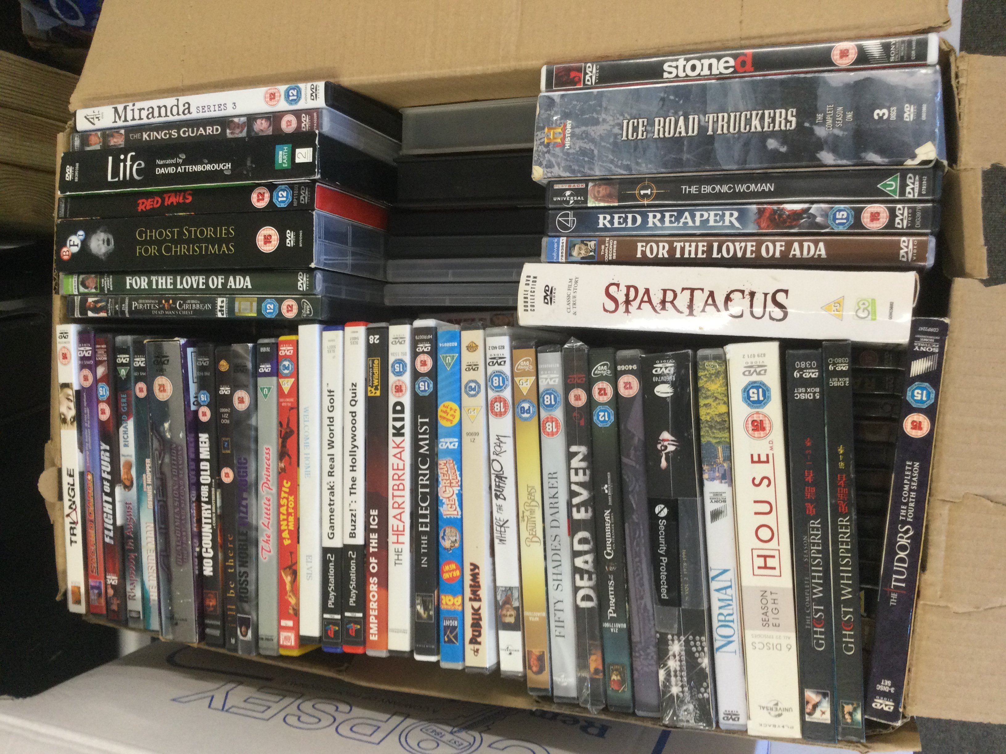 Four boxes of DVDs and VHS tapes comprising various films and TV series including some box sets. Shipping category D.