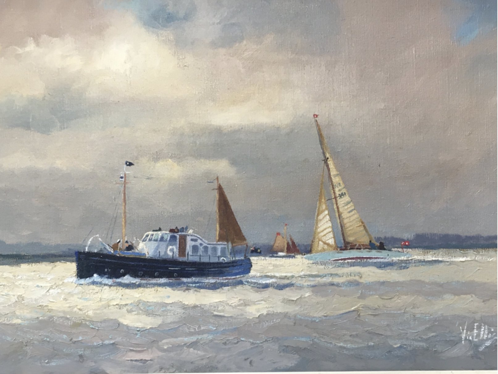 A framed Vic Ellis oil on canvas painting of ships at sea. 72x47cm