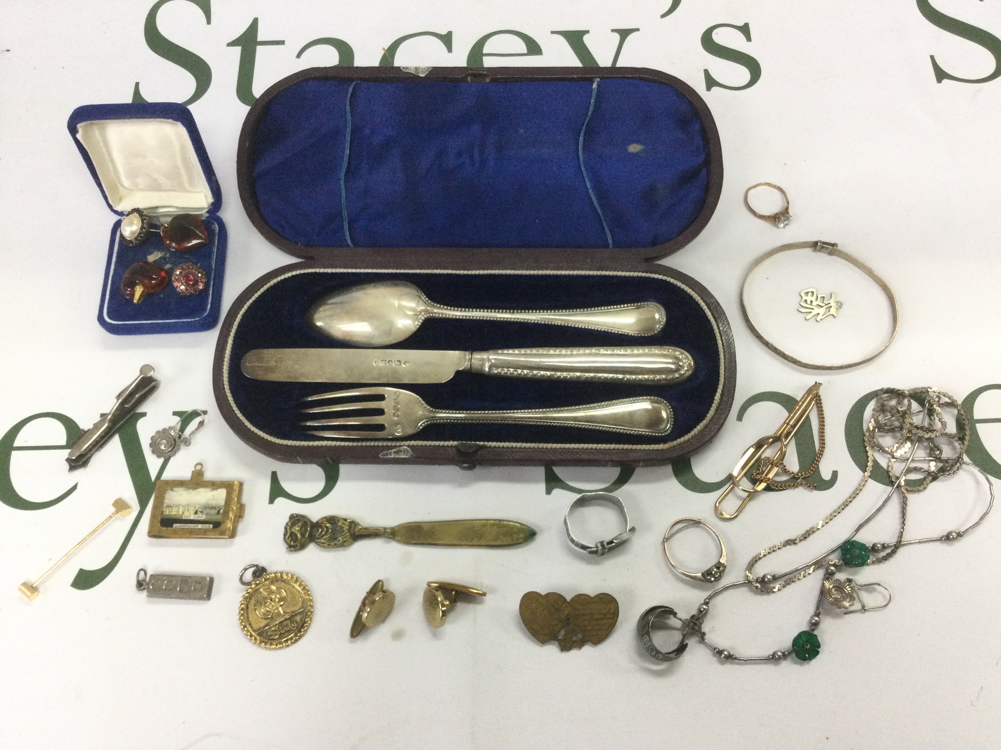 A small collection of jewellery and silver items including a 9ct gold ring. Shipping category A.