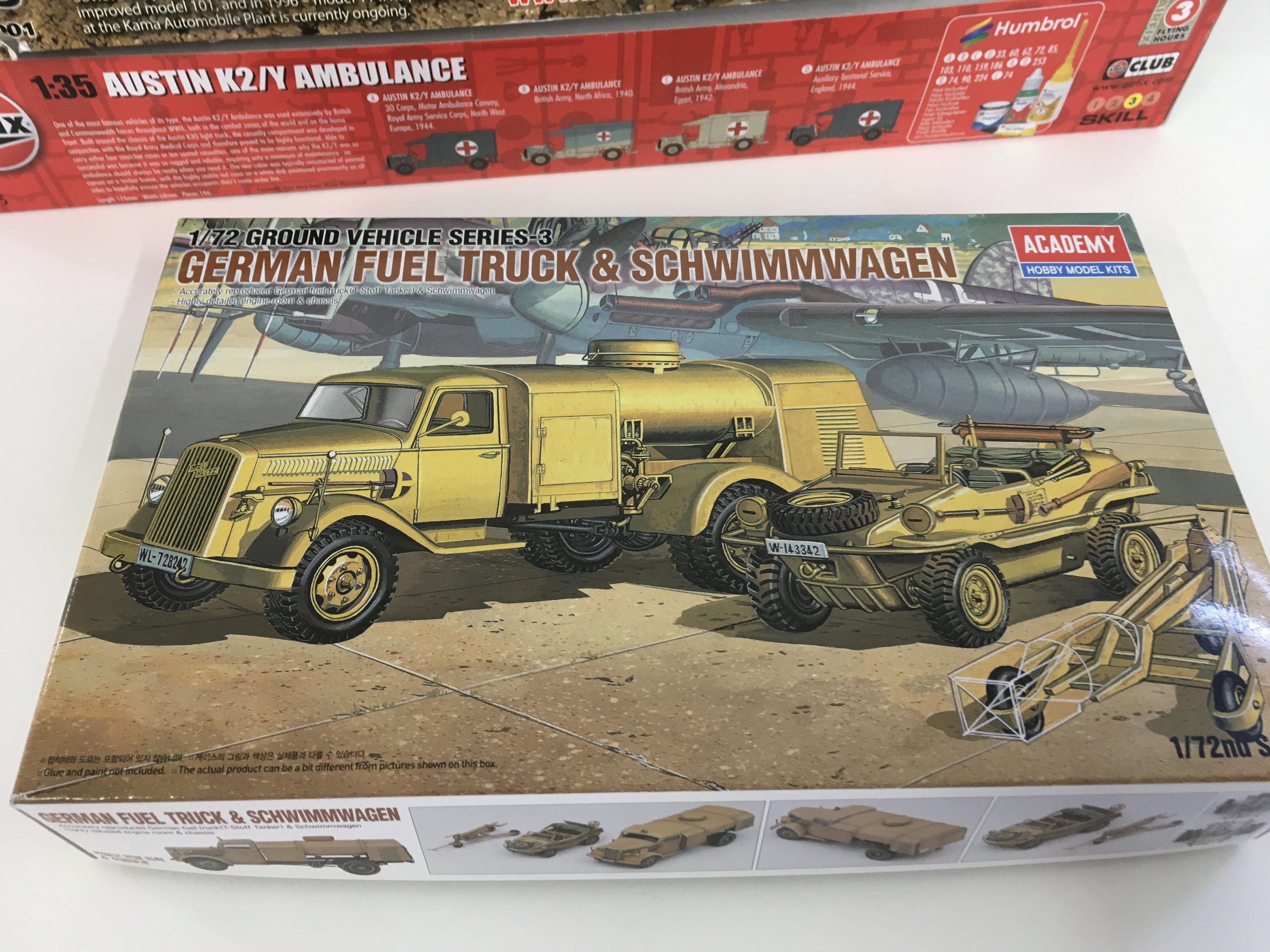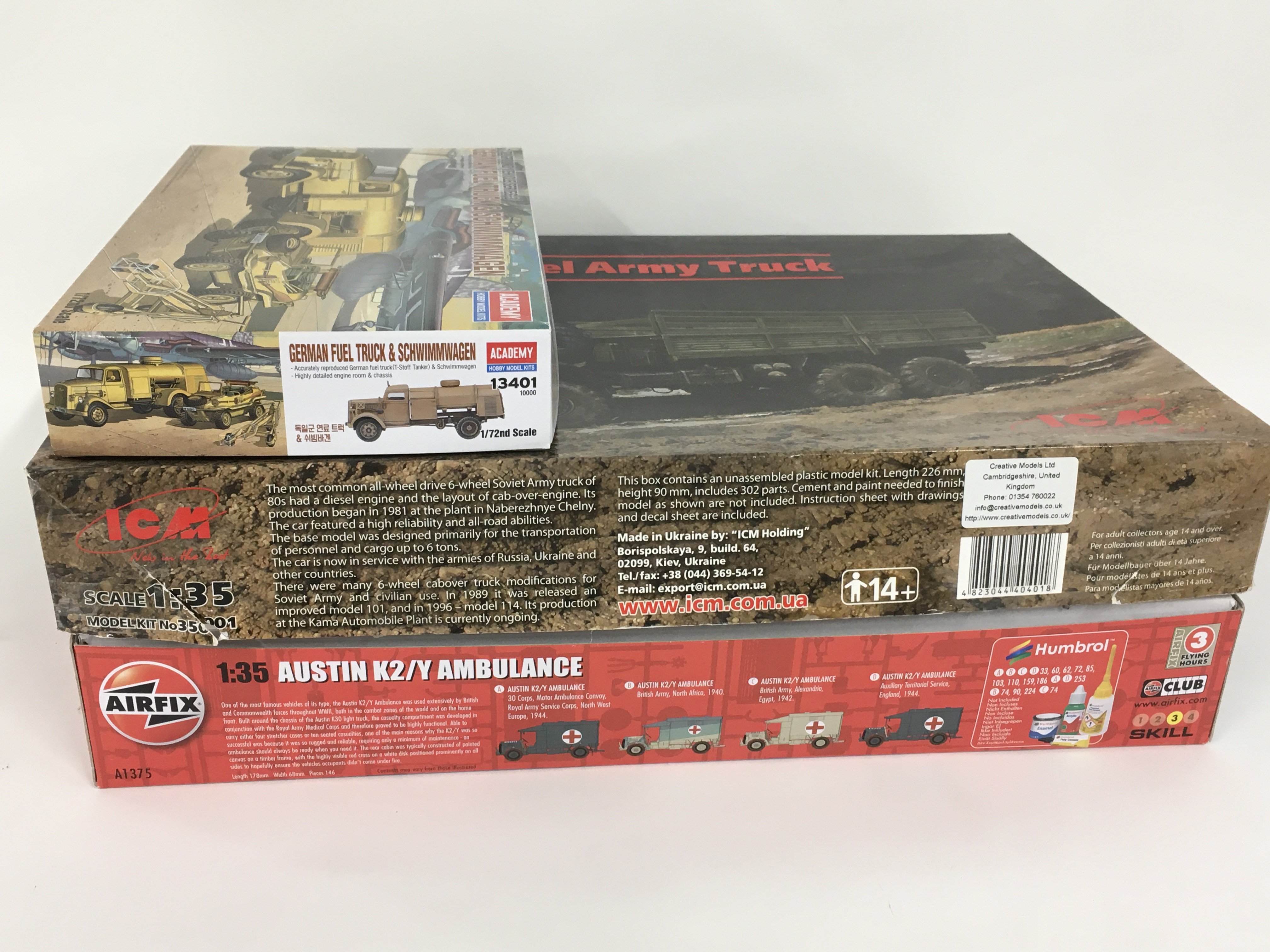 A group of 3 boxed unstarted model kits including Academy No. 13401 German Fuel Truck. ICM No35001 Soviet six wheel army truck Airfix A1375 Austin K2Y Ambulance. No Reserve