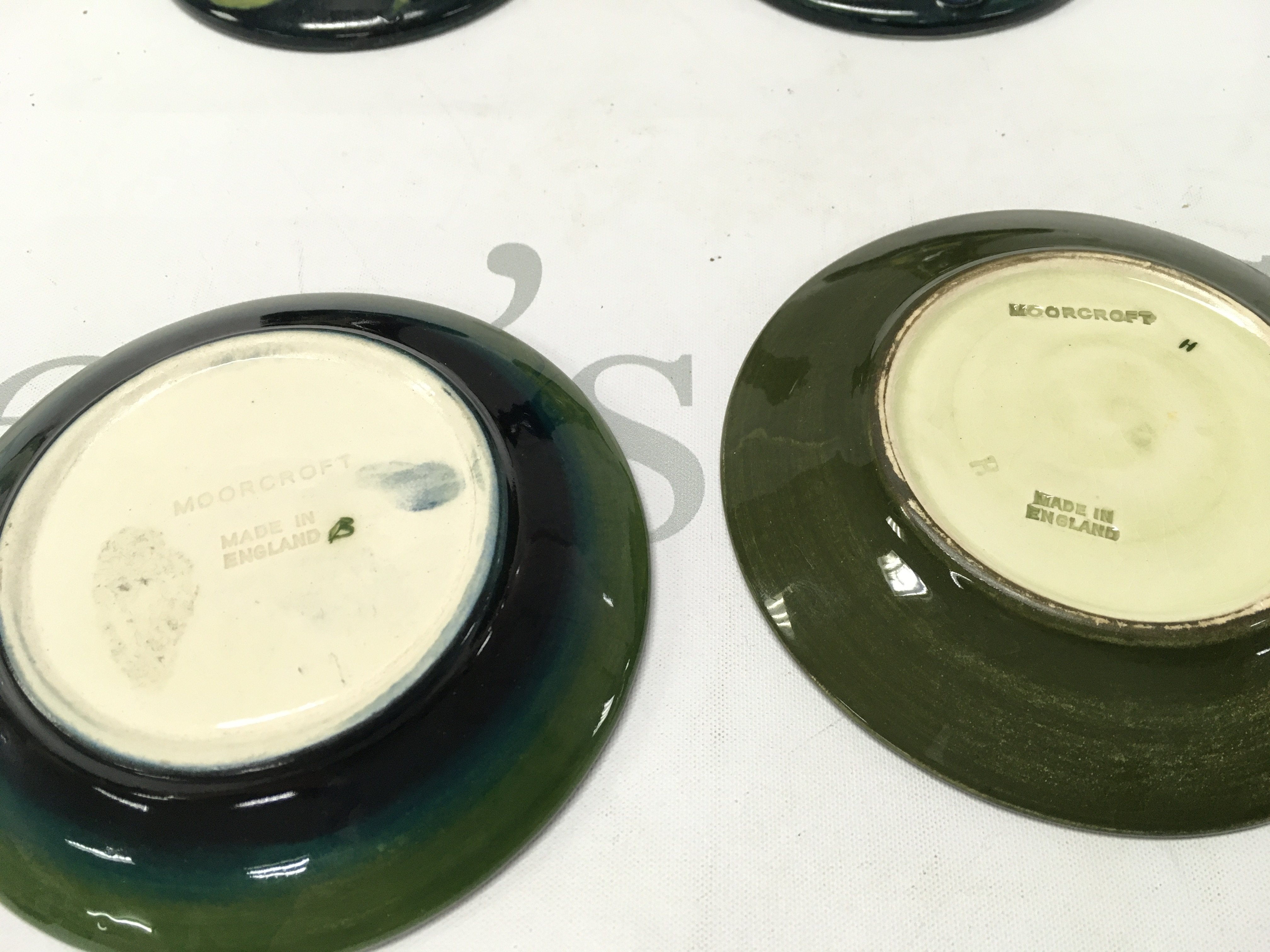 A pair of Moorcroft Queen Mary candle sticks with two smaller dishes . Sticks 9cm tall and 12cm wide. This lot cannot be posted