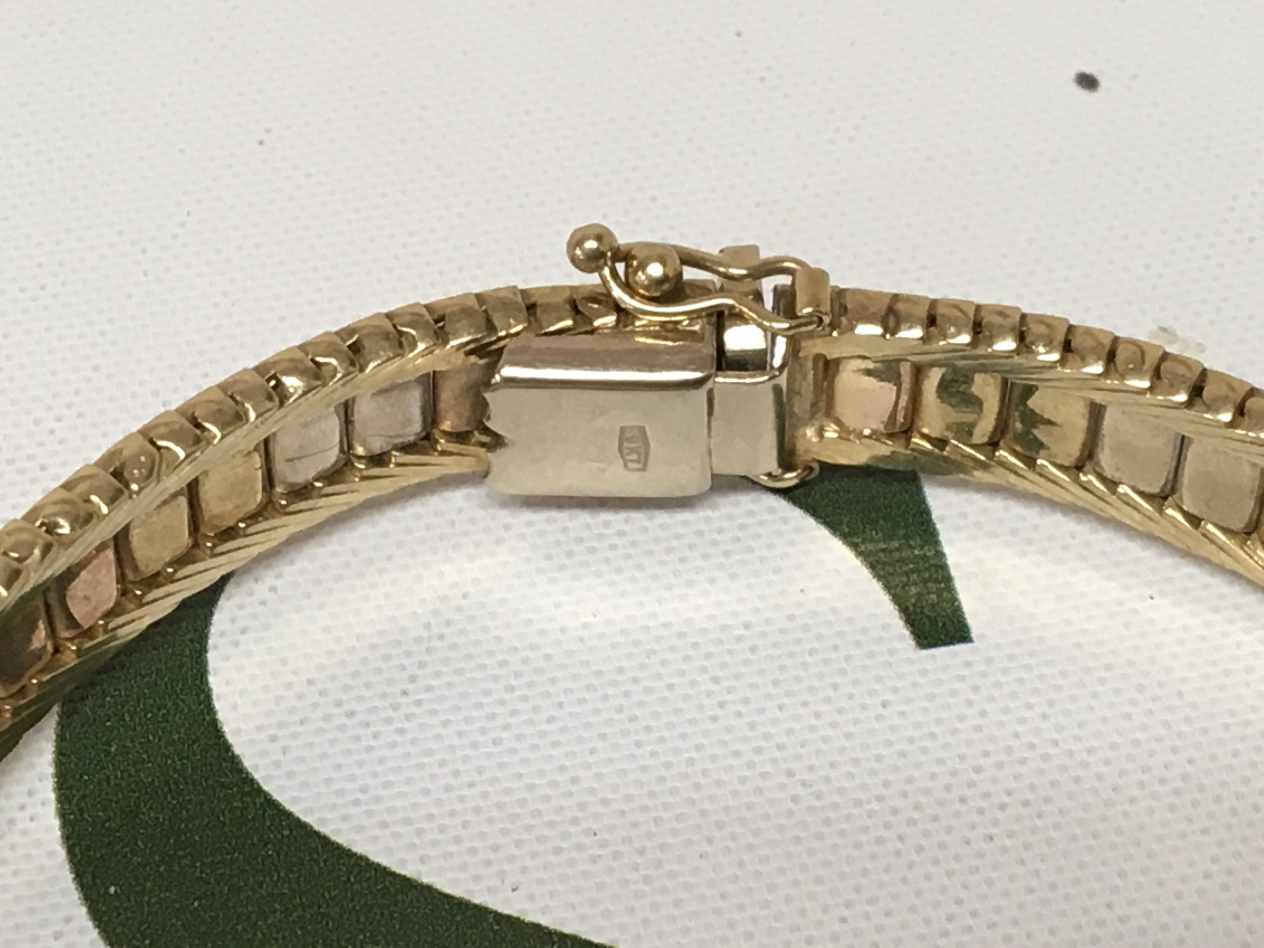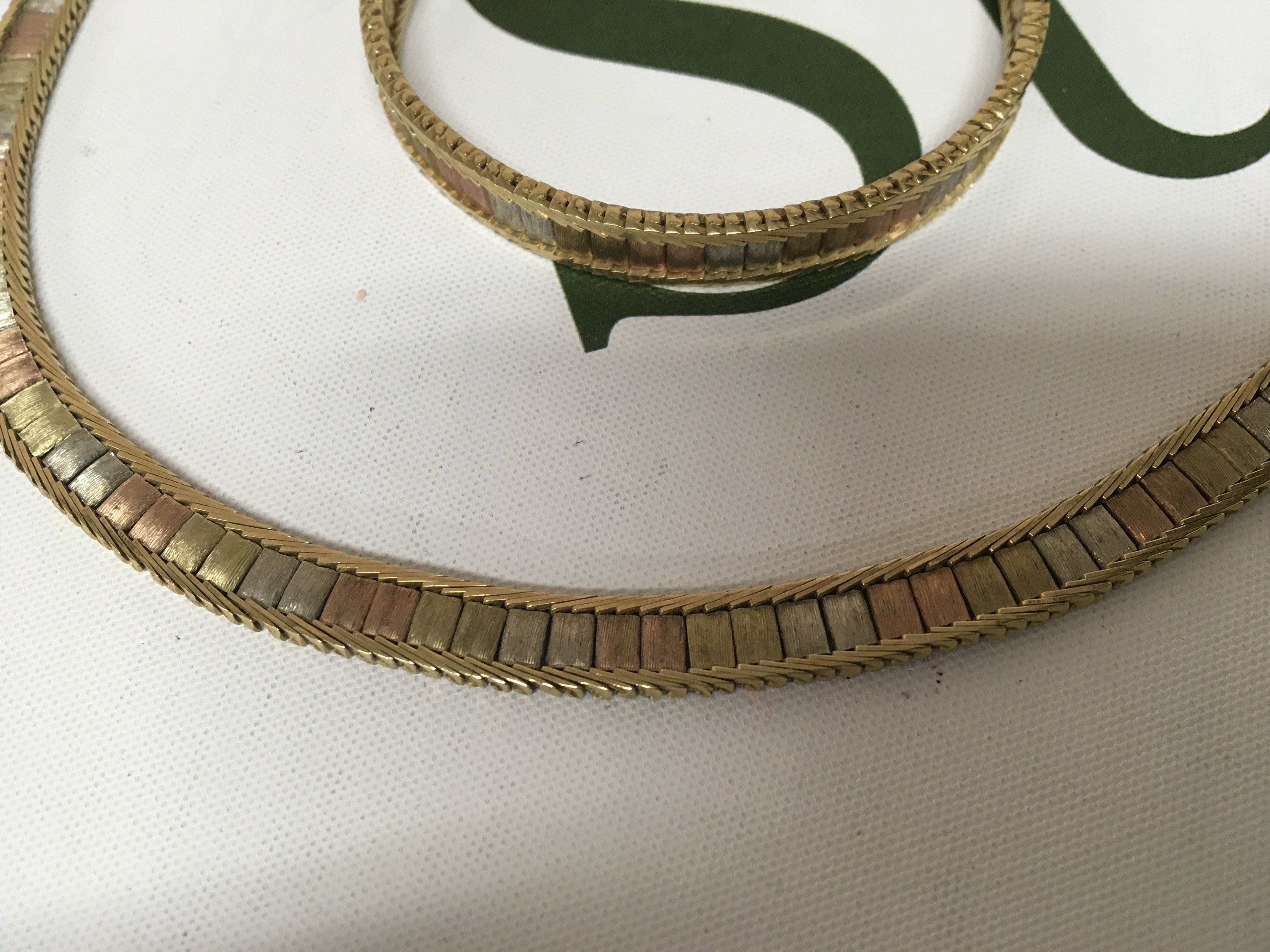 A gold necklace and matching bracelet the centre enclosed links with alternating three tone colour links both bracelet and necklace marked 9carat. Total weight 57g approximately.
