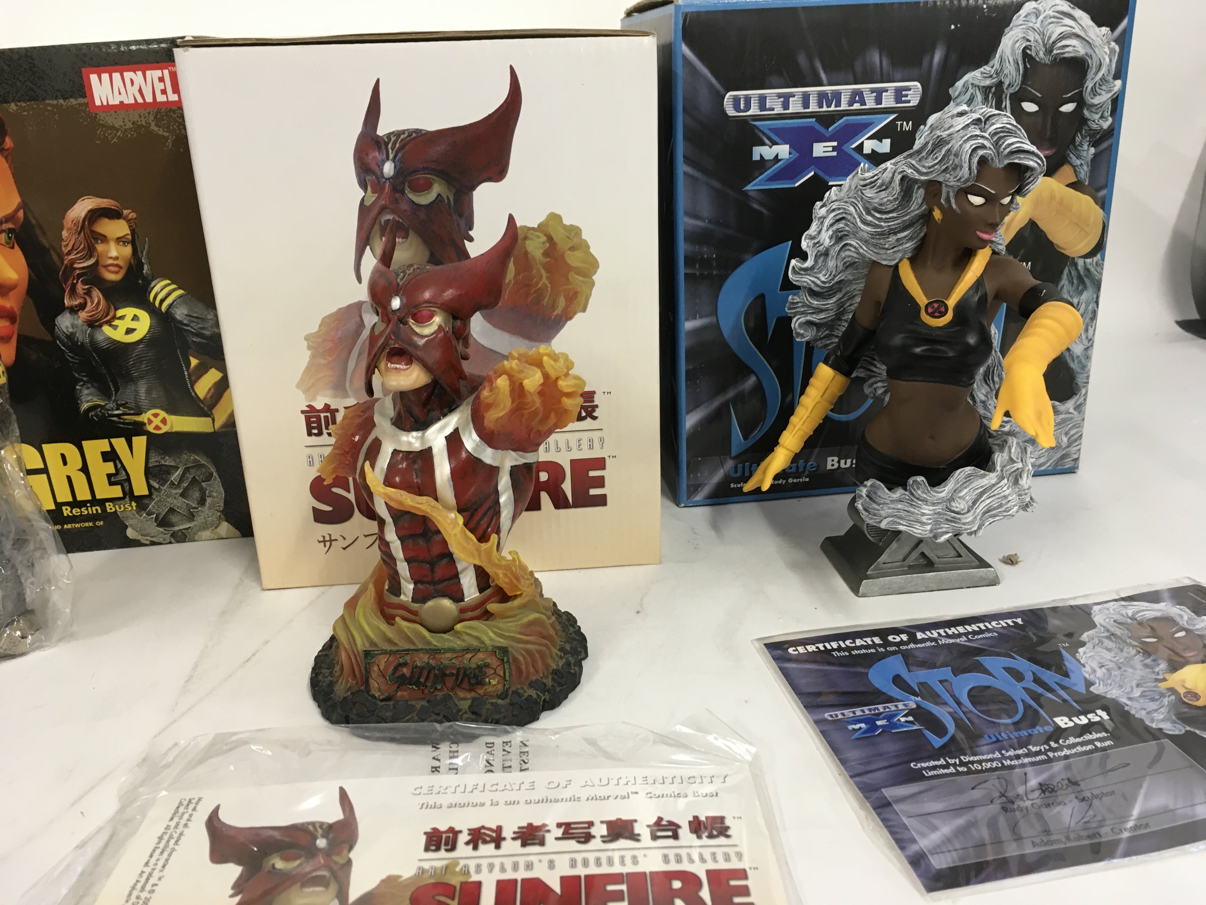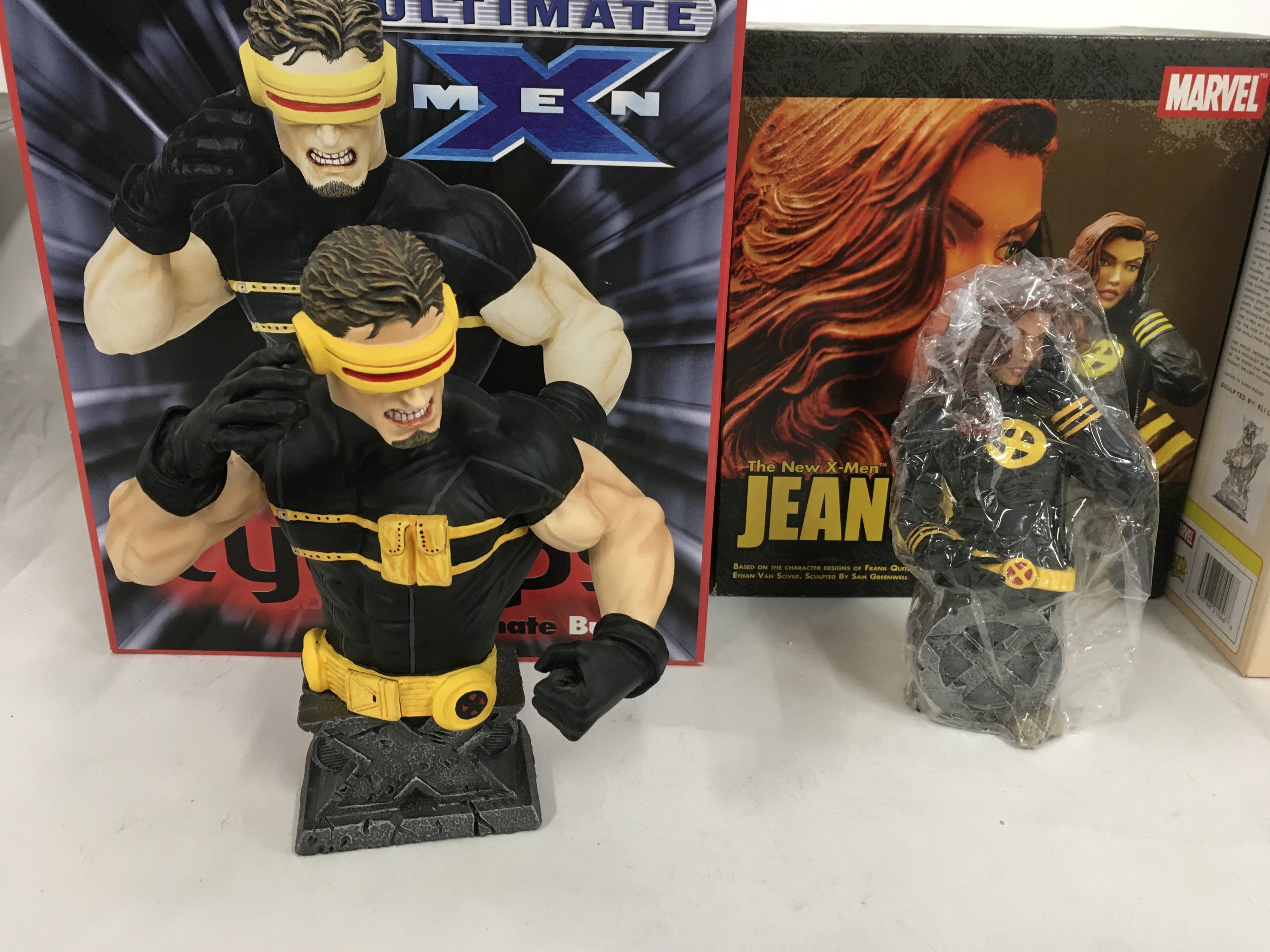 A collection of 4 boxed Marvel superhero sculptures featuring Cyclops..Jean Grey..Sunfire..Storm. No reserve