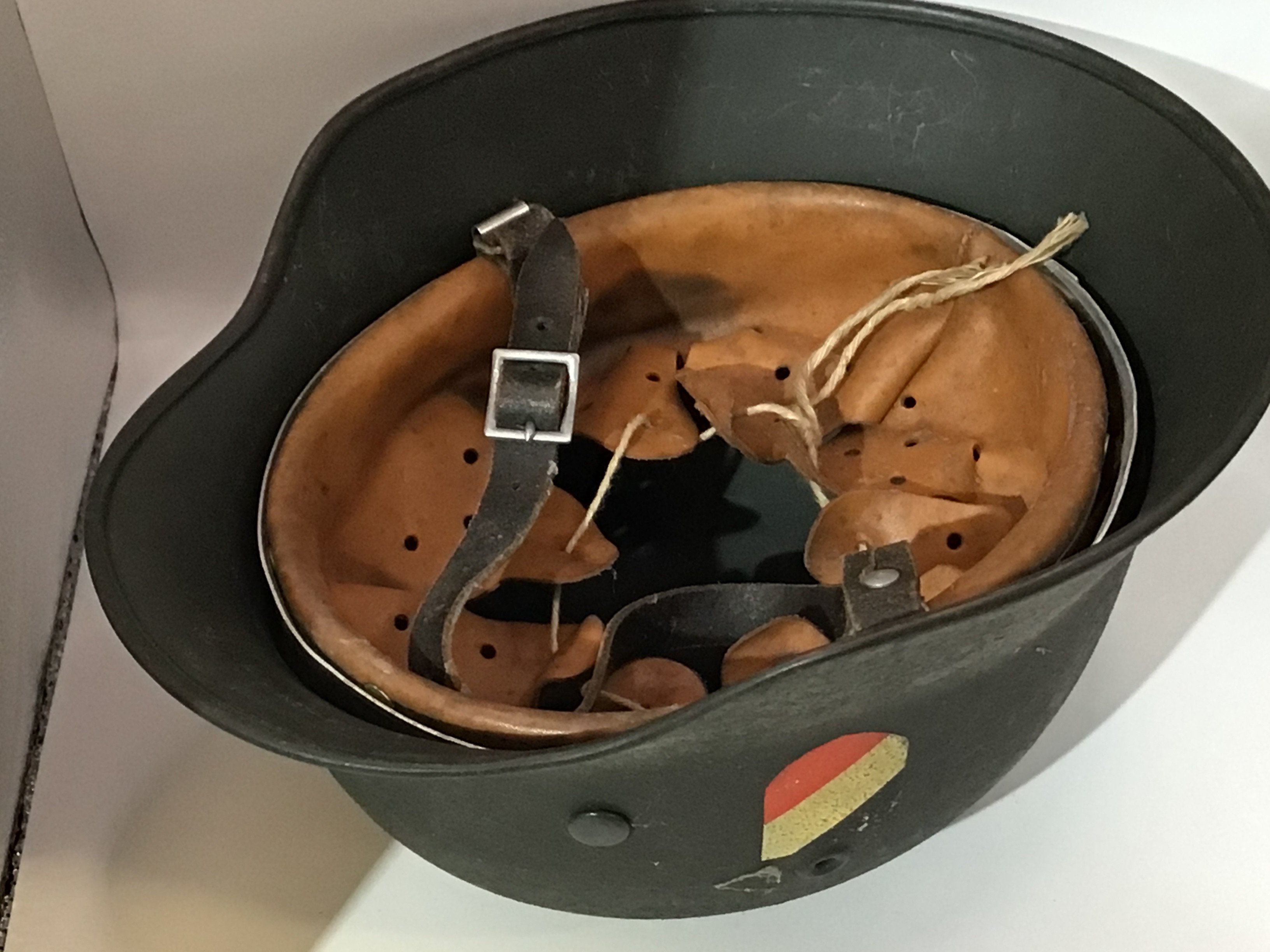 WW2 German Army (Heer) M35 Double Decal Steel Combat Helmet, fine example retaining much of the original apple green paint finish to the shell. Complete with original German army (heer) eagle decal and national tri-colour With leather liner and interior stamp mark FT64 and 440.