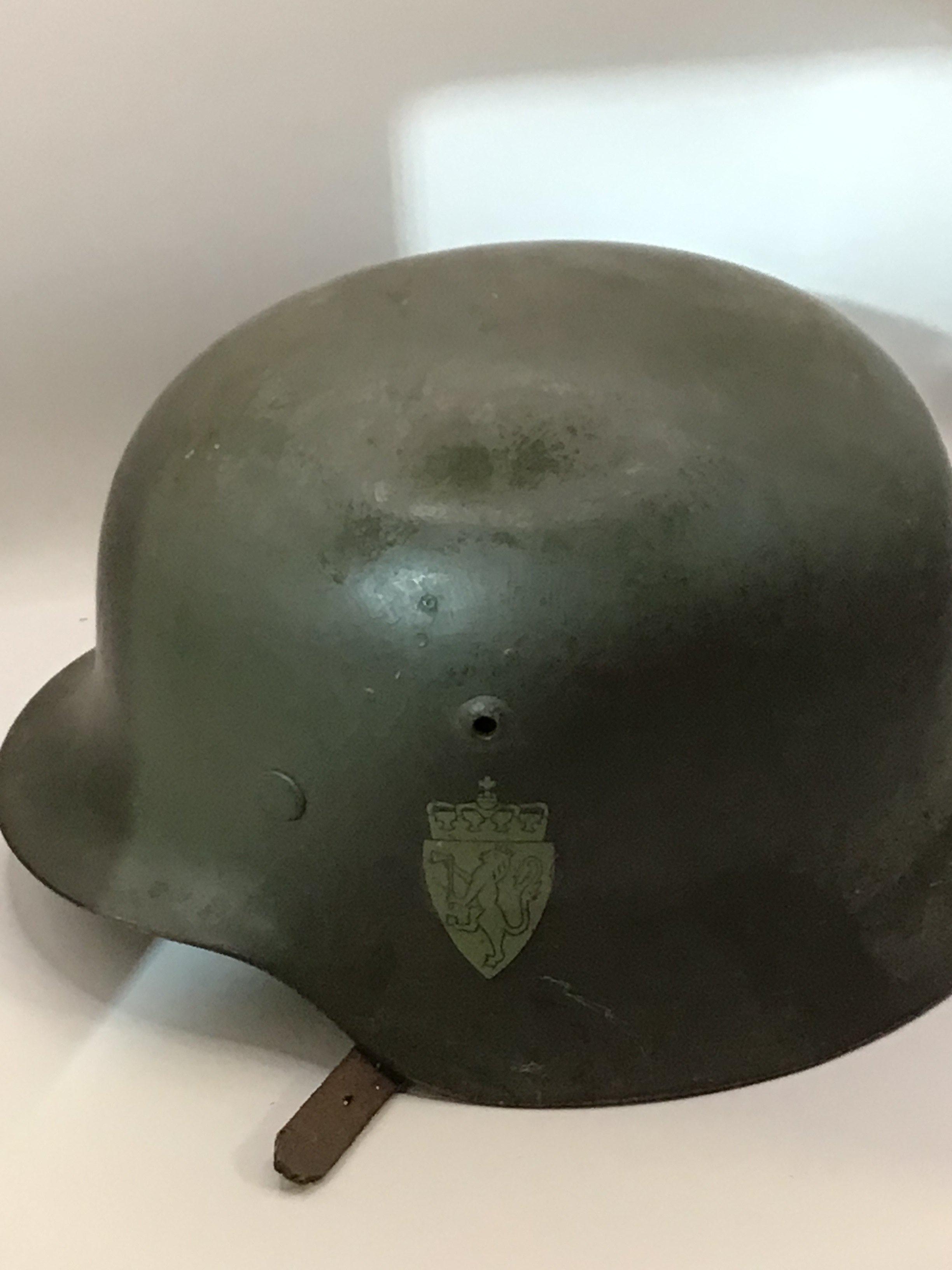 A very good example of a Norwegian II world war M38 pattern helmet with double Norwegian crest decal with leather liner.