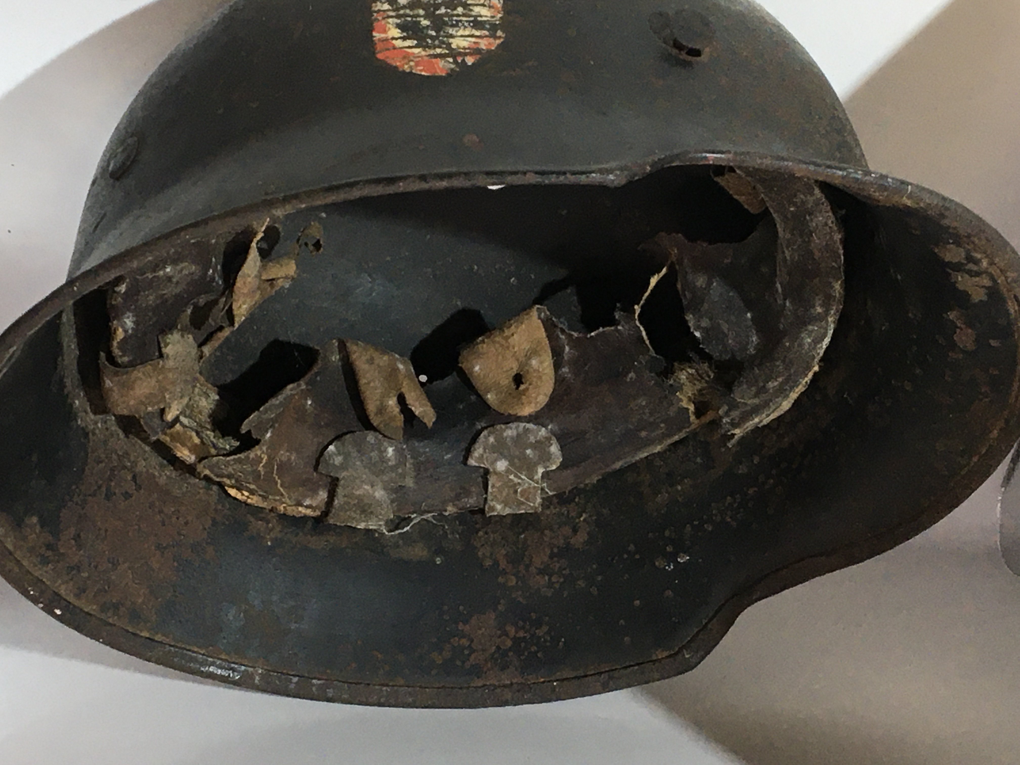 A German Third Reich II world war military helmet original condition with double side decals has a worn but original liner. The helmet with air breather holes and inner edge stamp mark