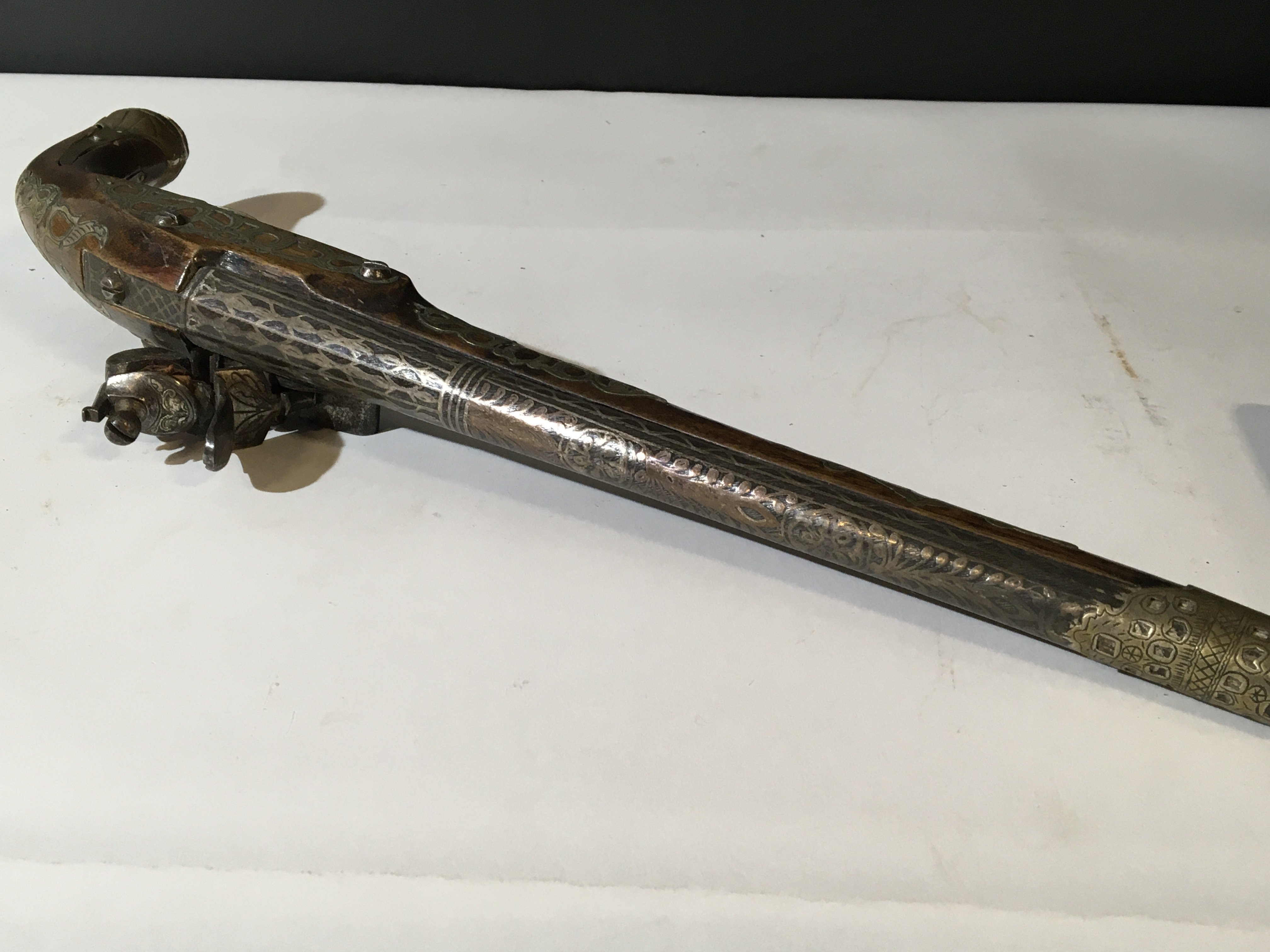 A Spanish late 18th century flintlock pistol with a brass inlaid walnut stock the barrel and action with further ornamentation action functions