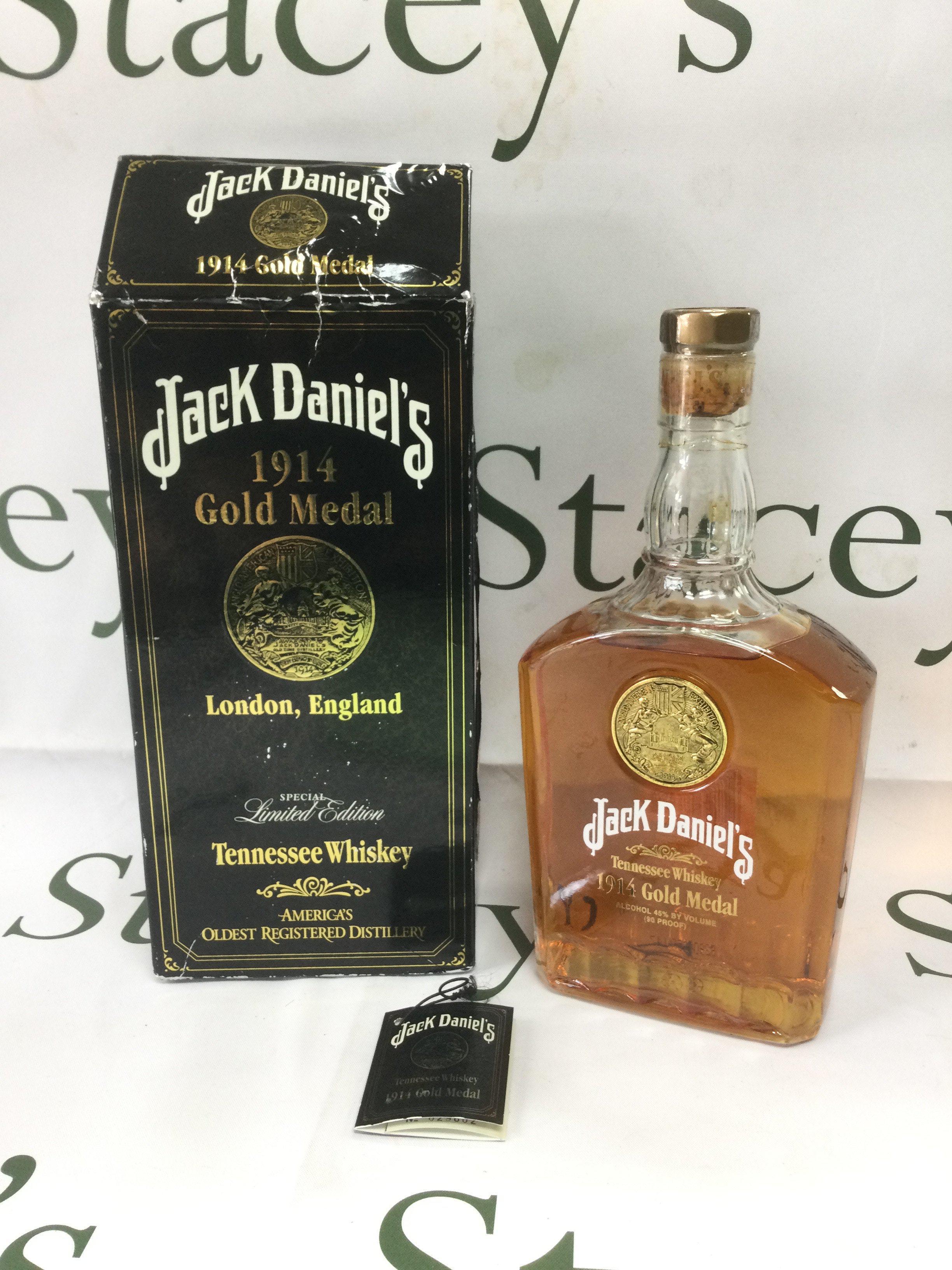 A boxed 750ml bottle of Jack Daniel's 1914 Gold Medal issued Whiskey including original tag. Shipping category D.