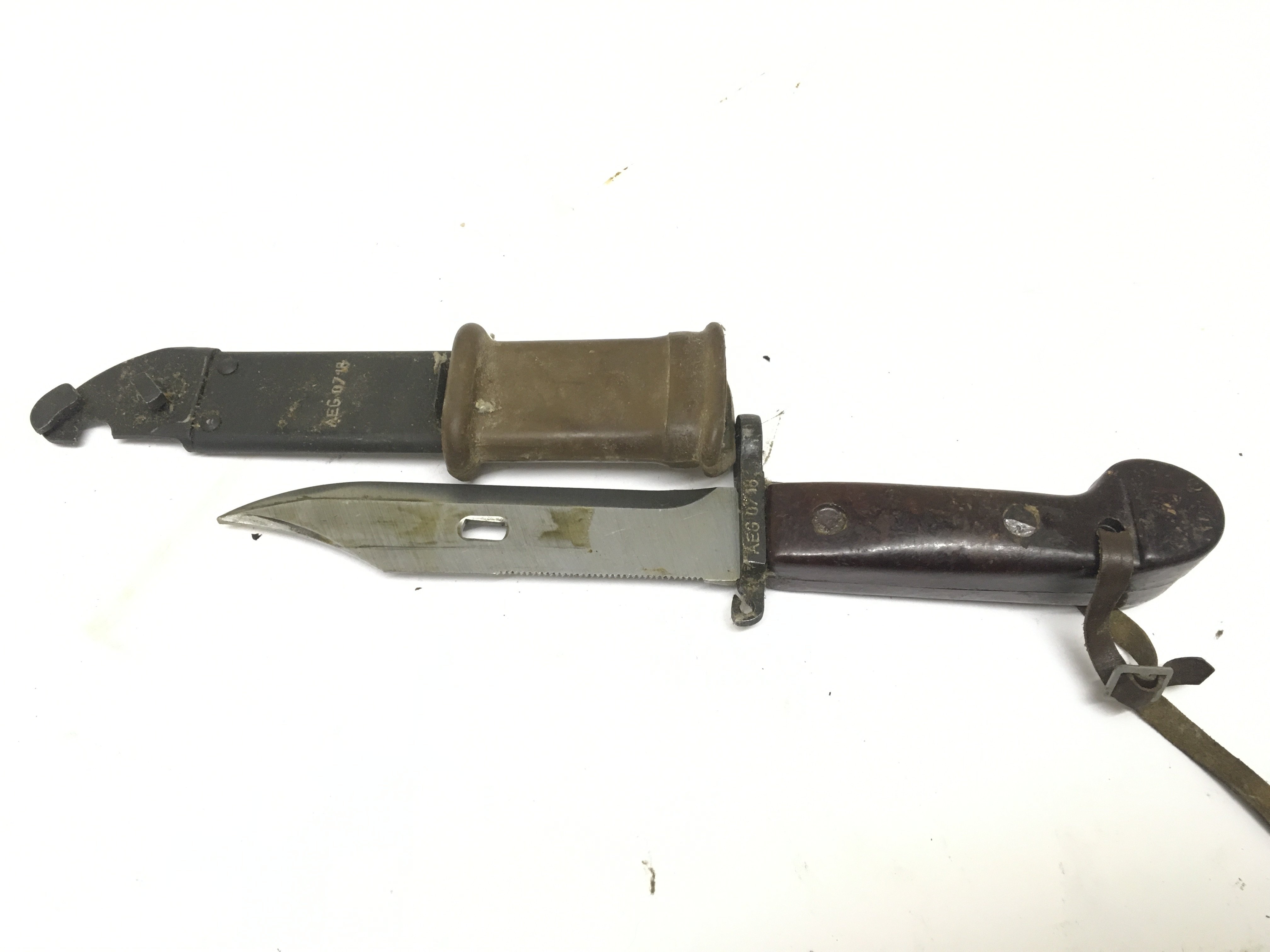 An early example Military AK67 bayonet with Bowie type blade with saw edge stamped AEG 0718.NO RESERVE