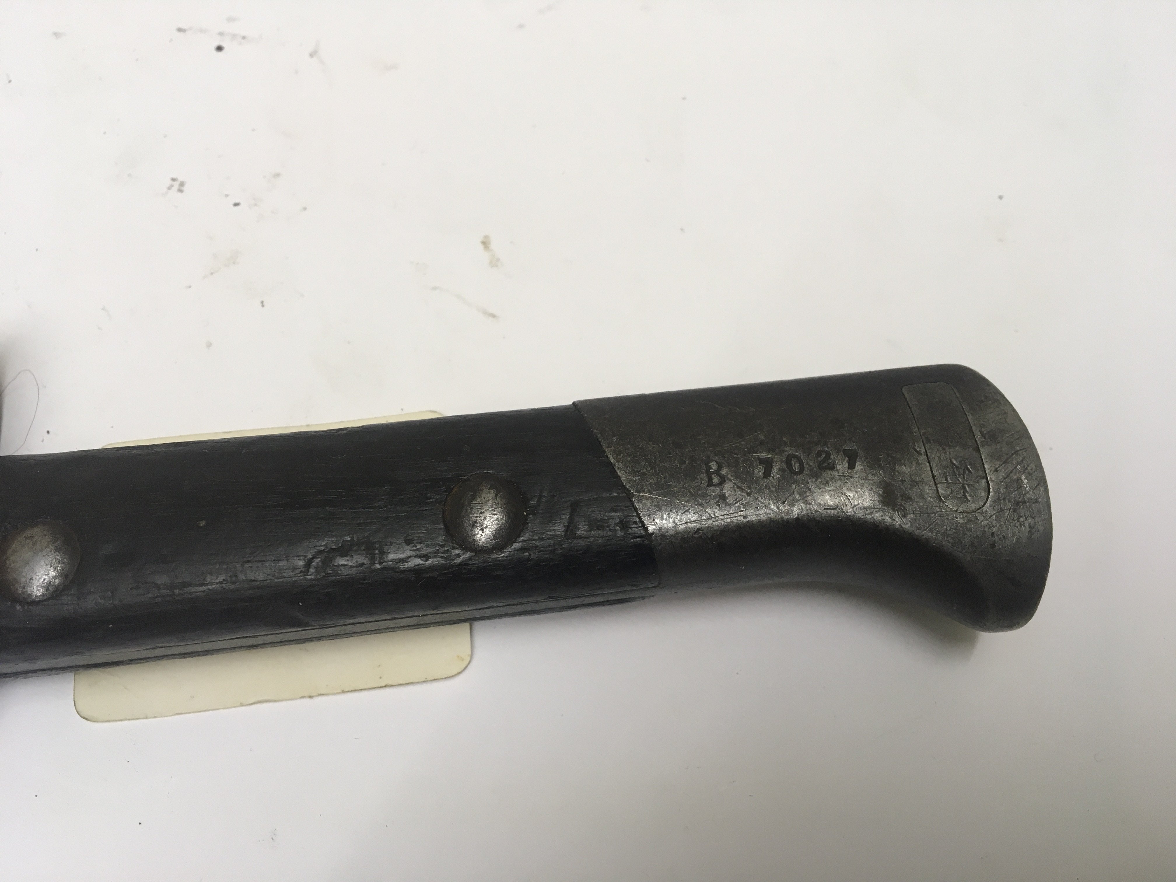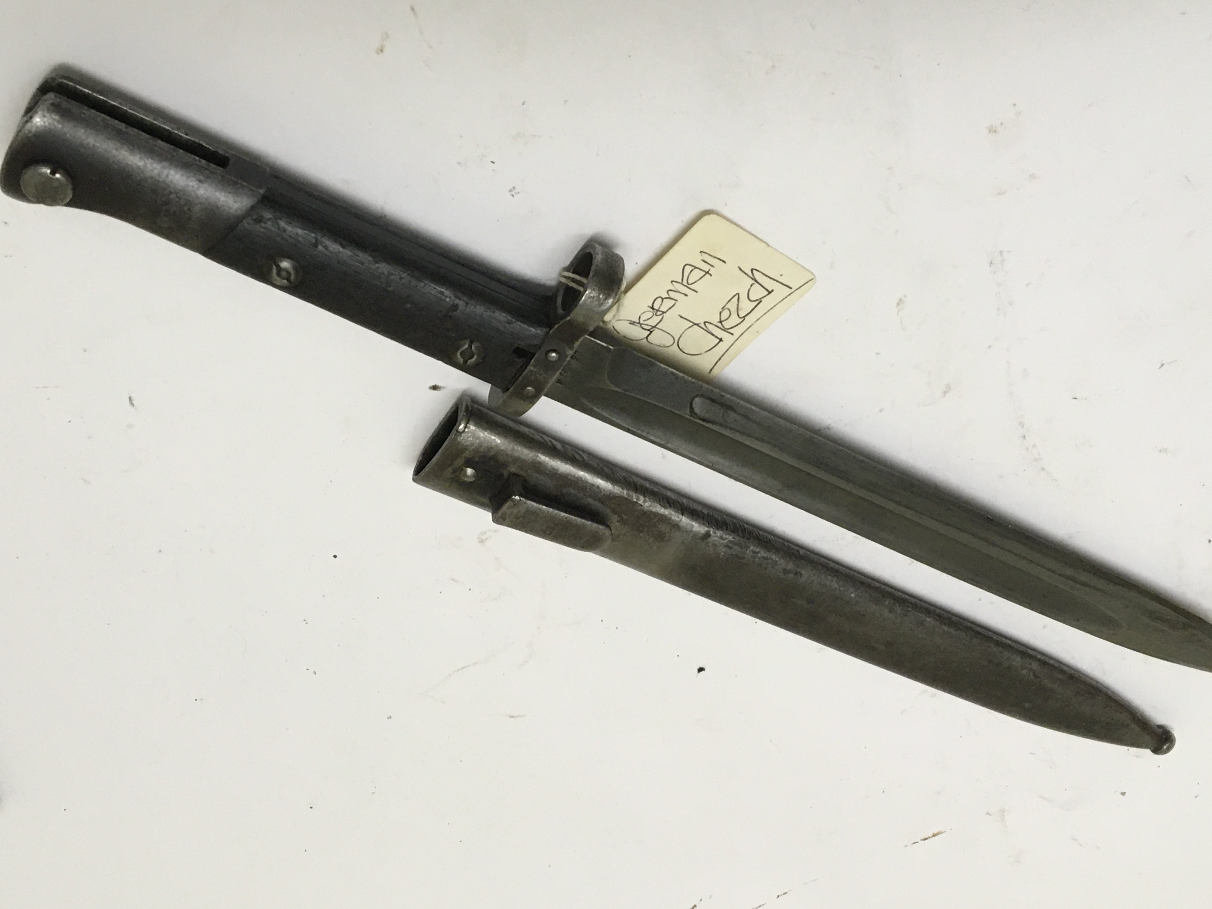 A II world war bayonet the M95 pattern Czechoslovakia bayonet with steel scabbard makers marks to the blade CSZ the bayonet also numbered B 7027. NO RESERVE