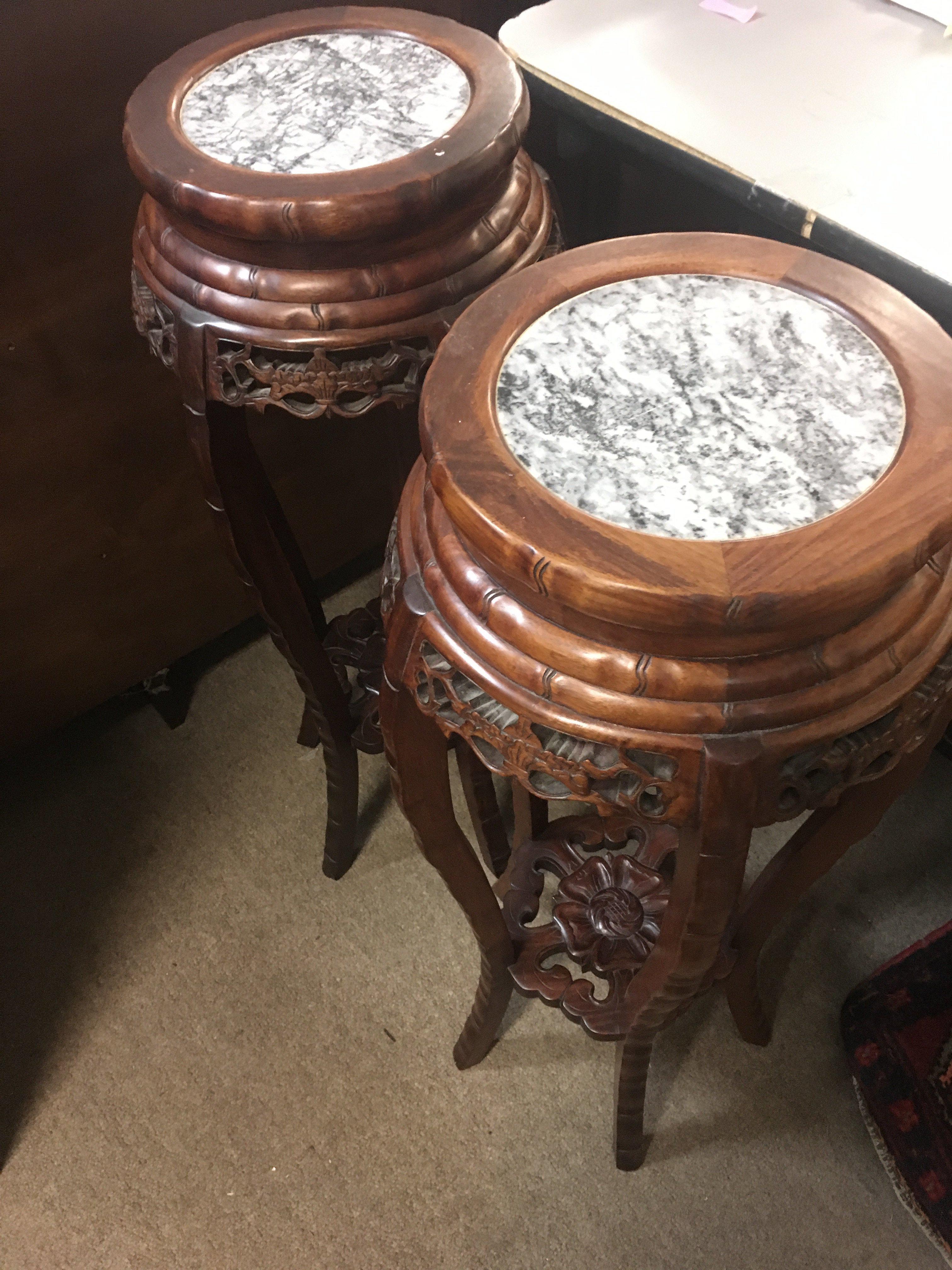A pair of oriental wooden pedestals with marble tops, 82cm tall