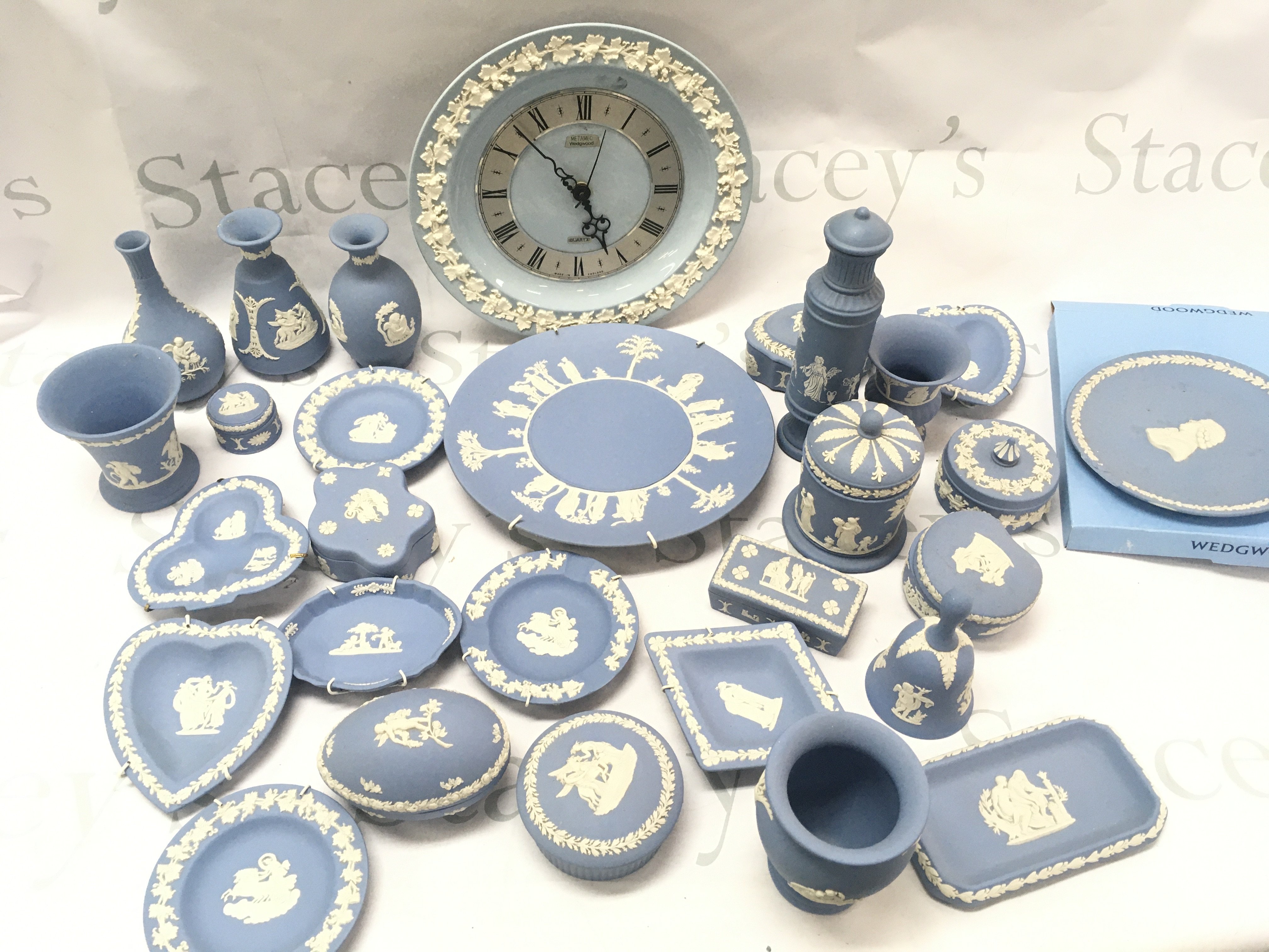 A collection of Wedgewood Jasperware including plates, dishes , clock etc . This lot cannot be posted