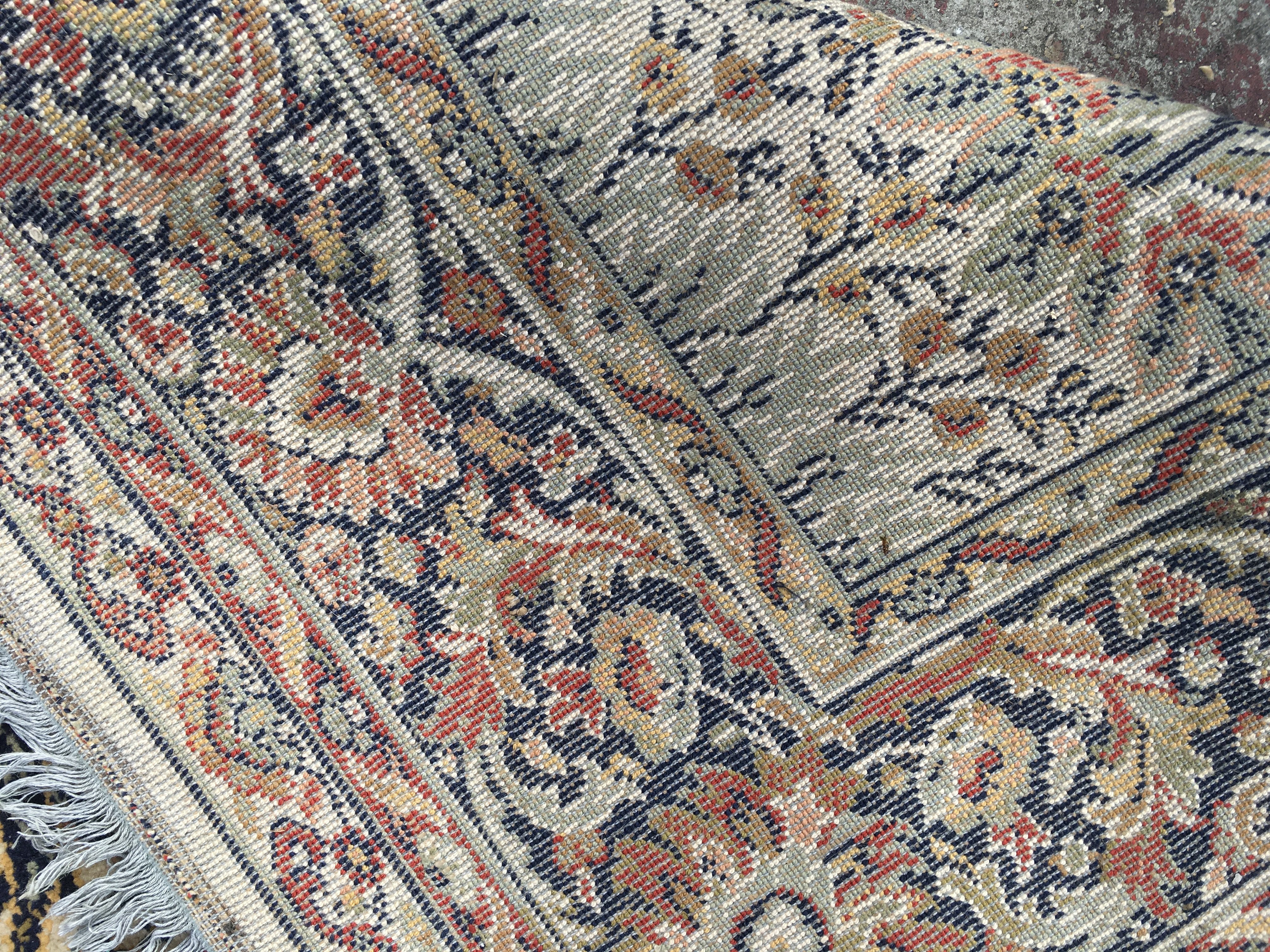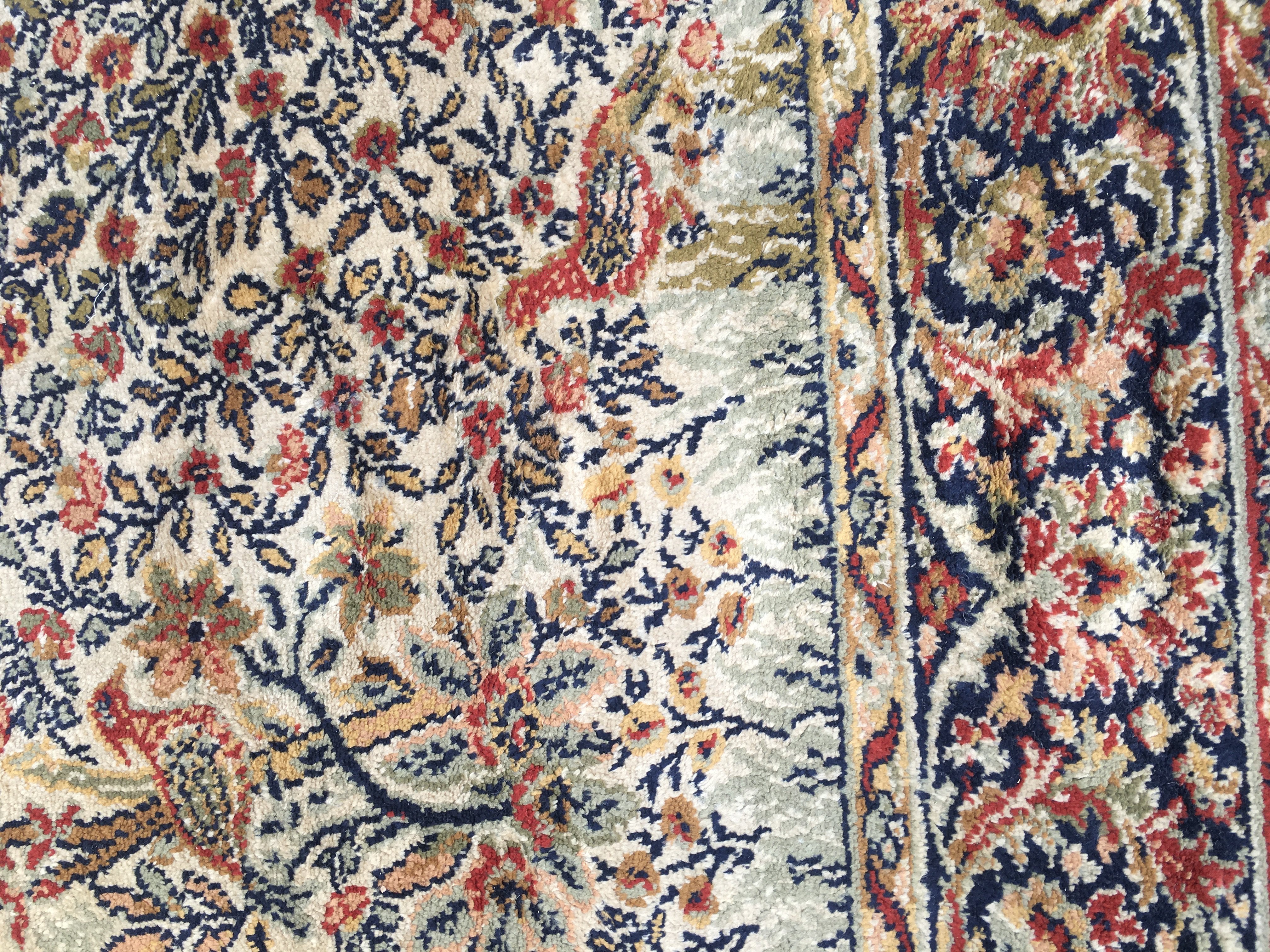 A pair of Persian style carpets the centre field with birds and trees with floral borders and a matching rug .
