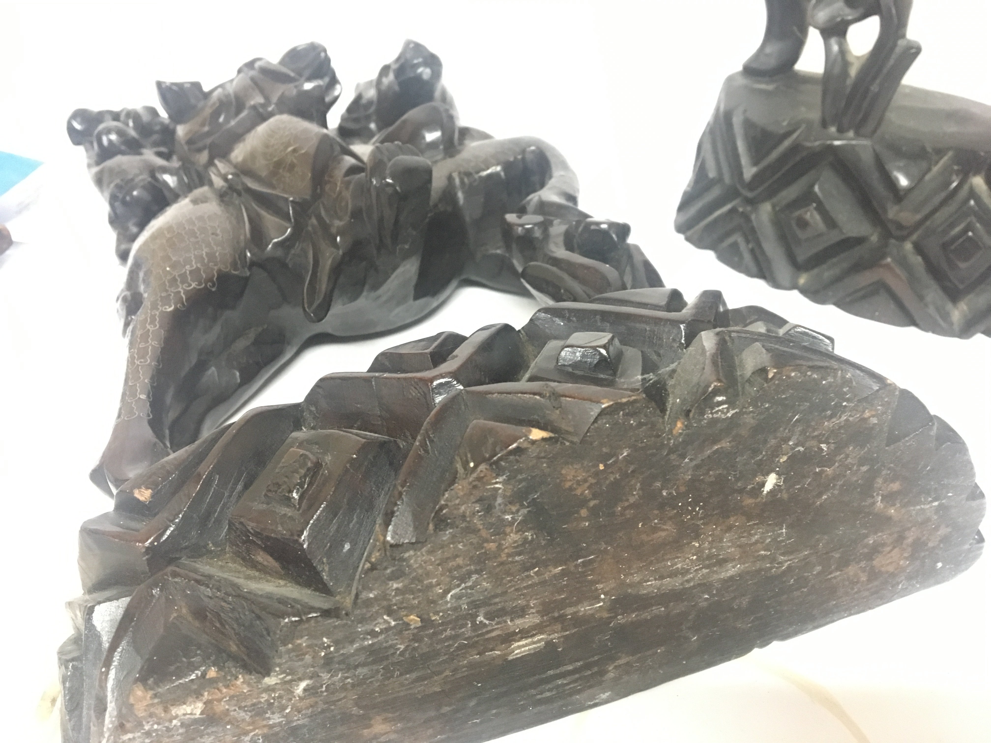 A pair of quality Chinese late 19th century carved hardwood figures in the form of elders seated on deer with hanging monkeys and delicately decorated with fine silver inlay Hight 46cm. Slight damage see illustrations.