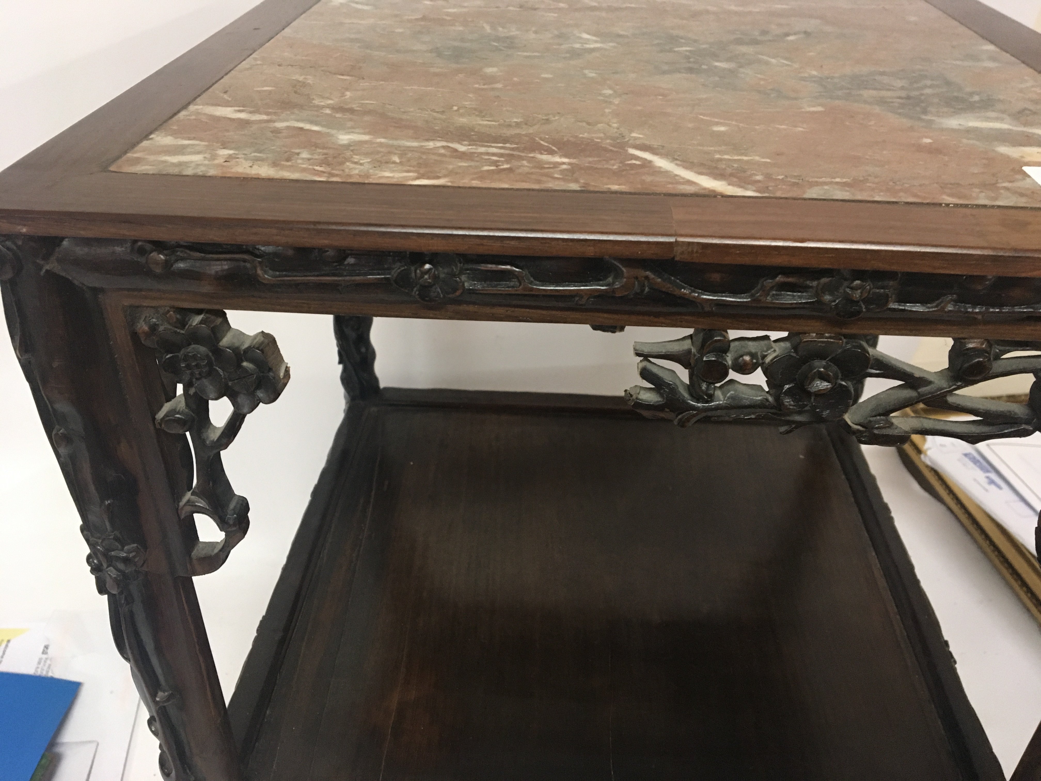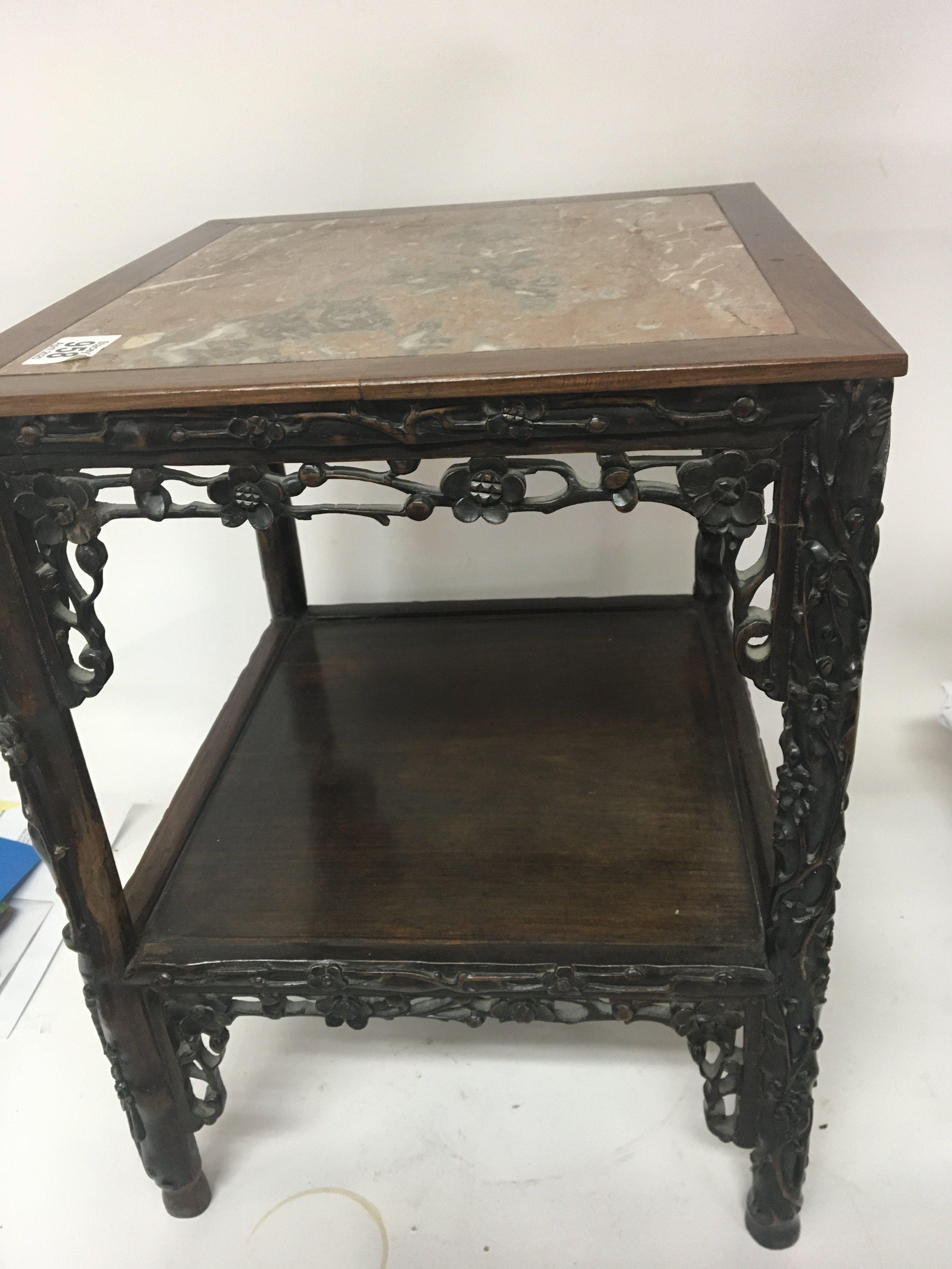 A Chinese late 19th century carved hardwood two tier stand inset with a marble top the tier edges with open naturalistic floral carving. Small piece of moulding missing see image Hight 47cm