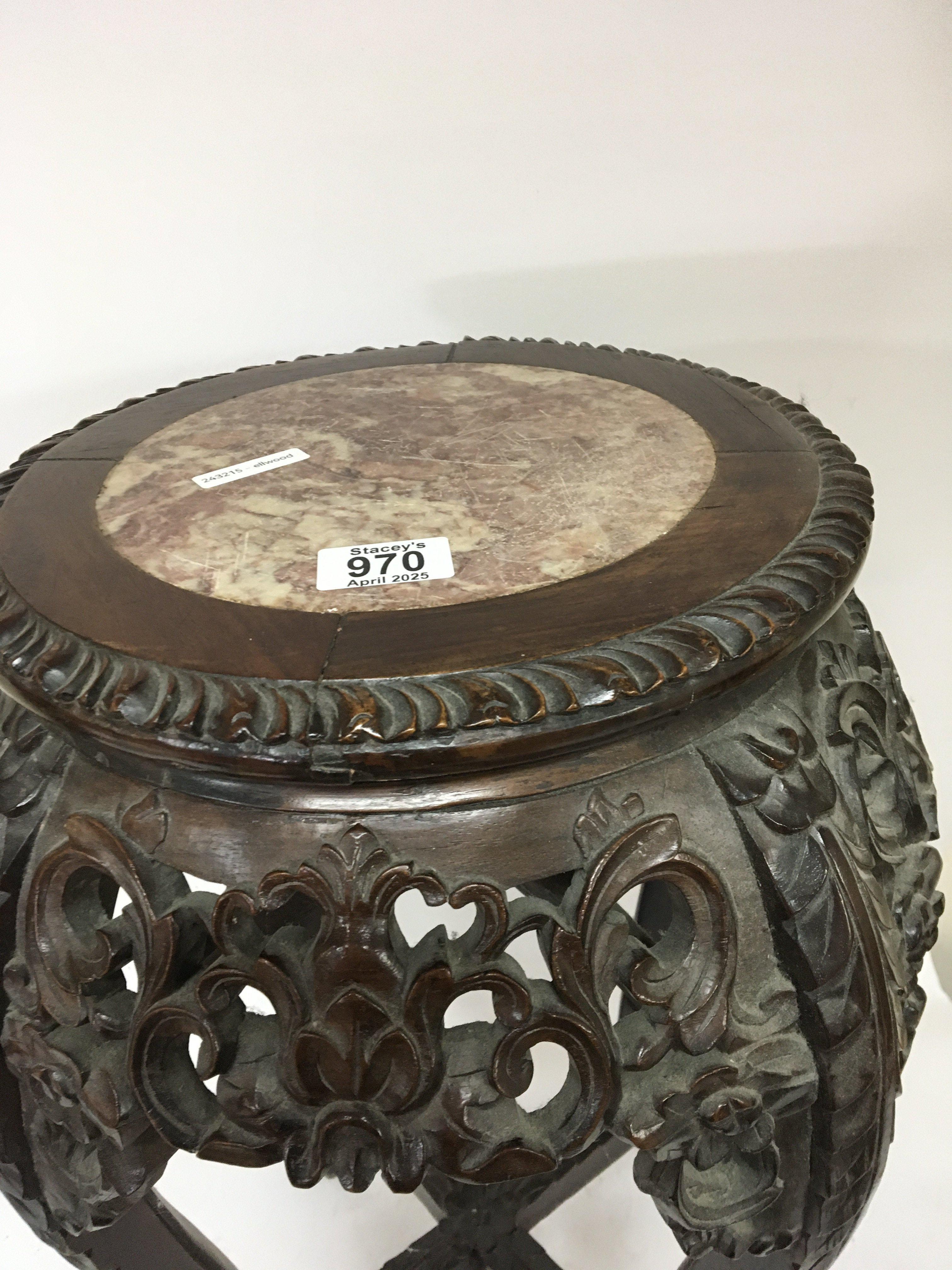 A Chinese carved hardwood jardiniere stand the round top inset with marble with a carved apron and legs United by stretchers. Height 61cm