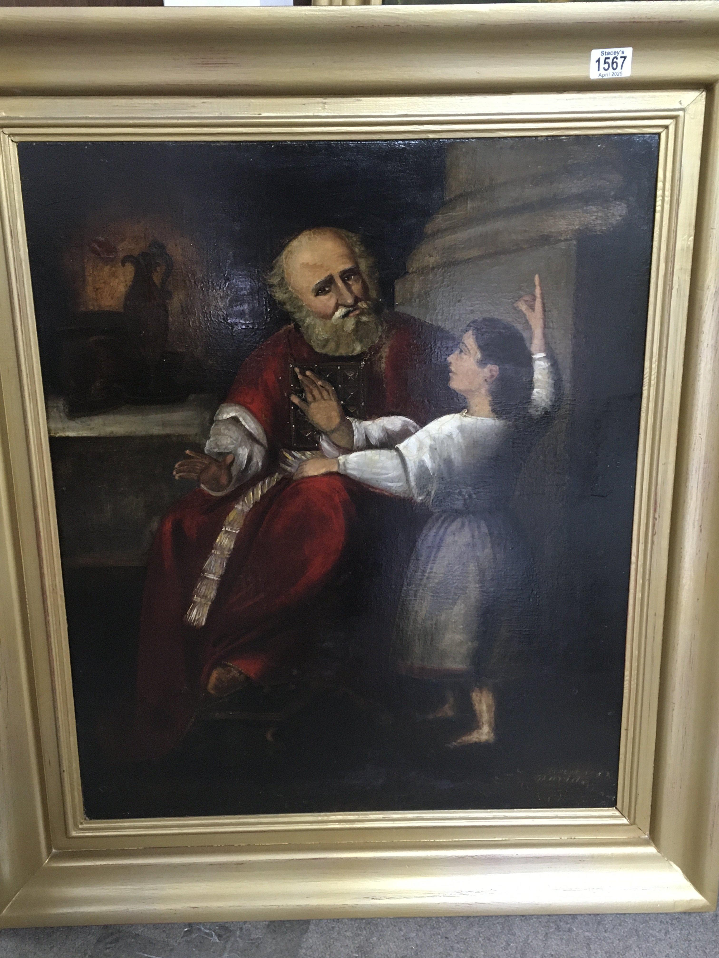 A framed oil painting figures in an interior of an ecclesiastical subject with inscription possible 18th Century relined and restored.