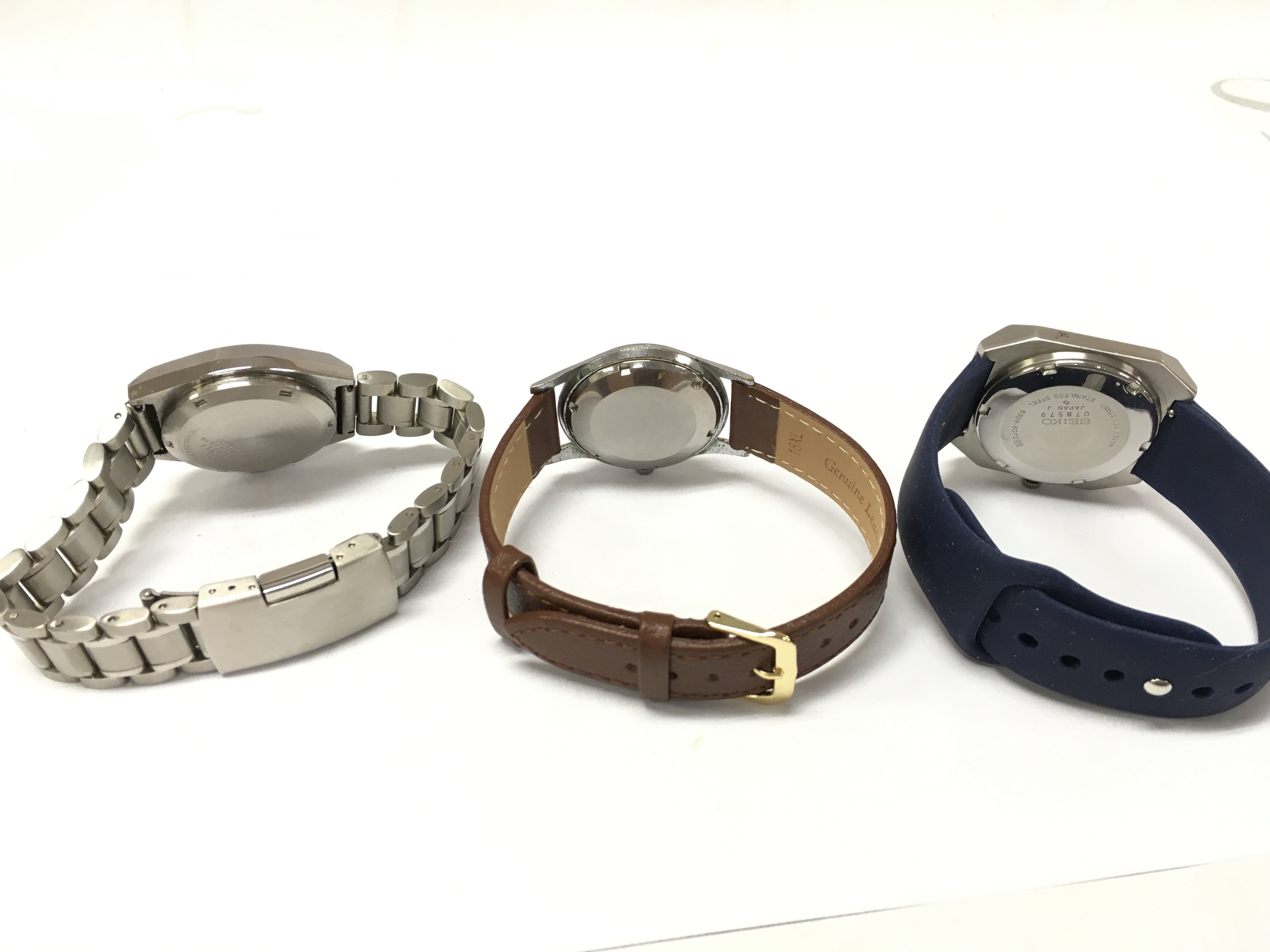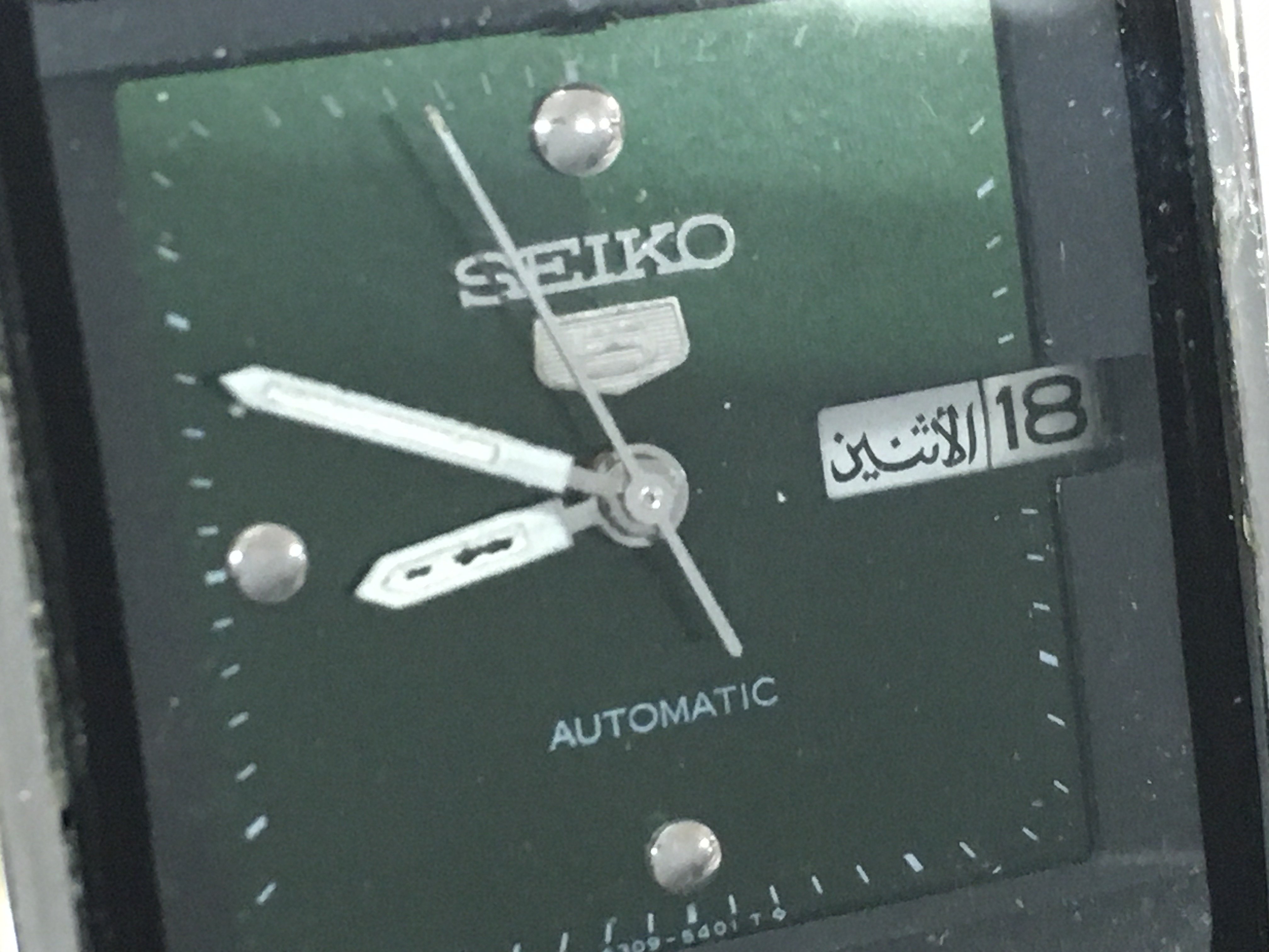 Watches including Seiko 5 automatic Arabic day/date, vintage Seiko 5 green face, Rone Gents wrist watch, Vintage Seiko Emerald green TV dial and a Seiko Automatic Mikey Mouse face Japan made watch. Stored in a watch case. Postage category B