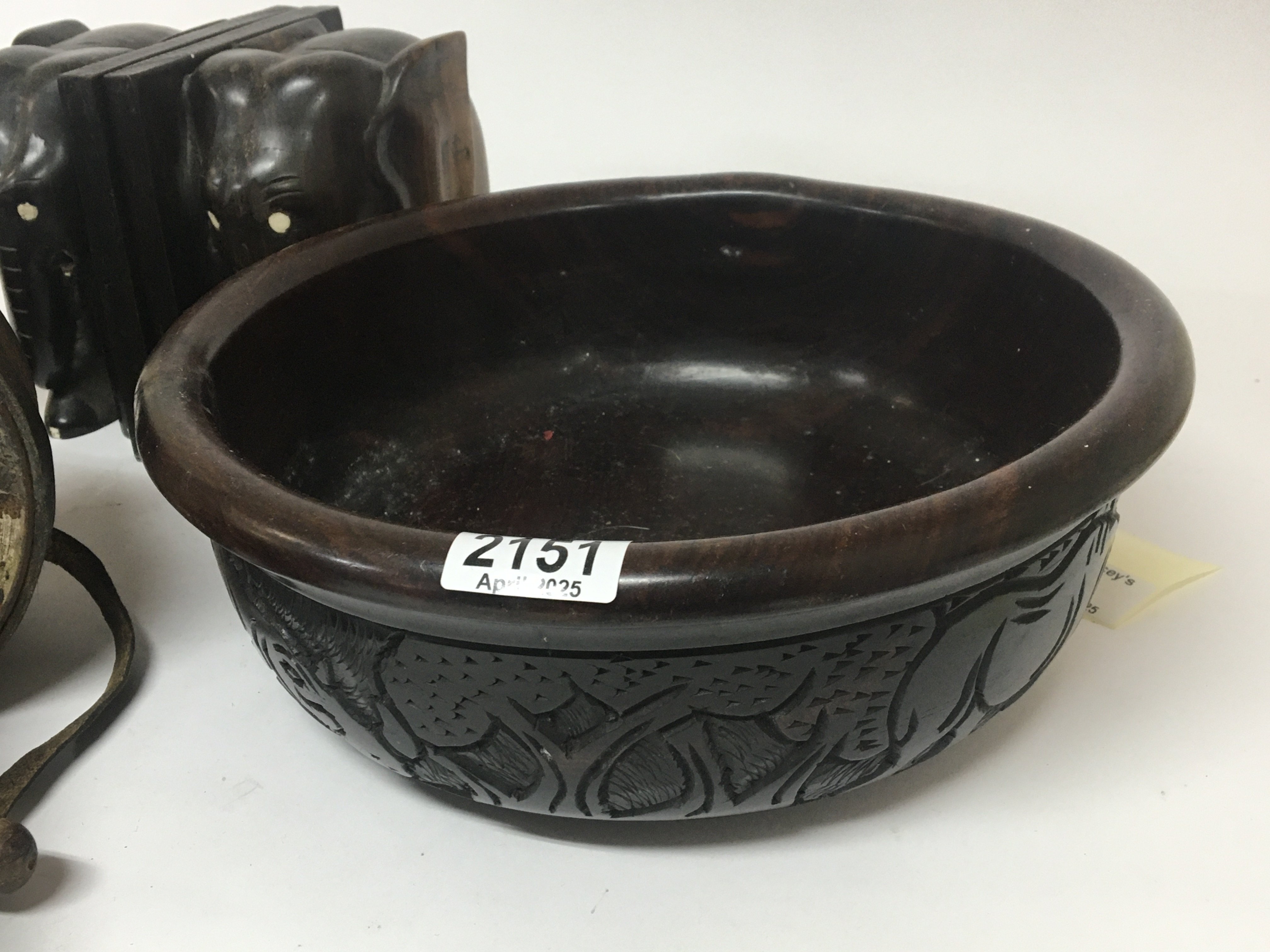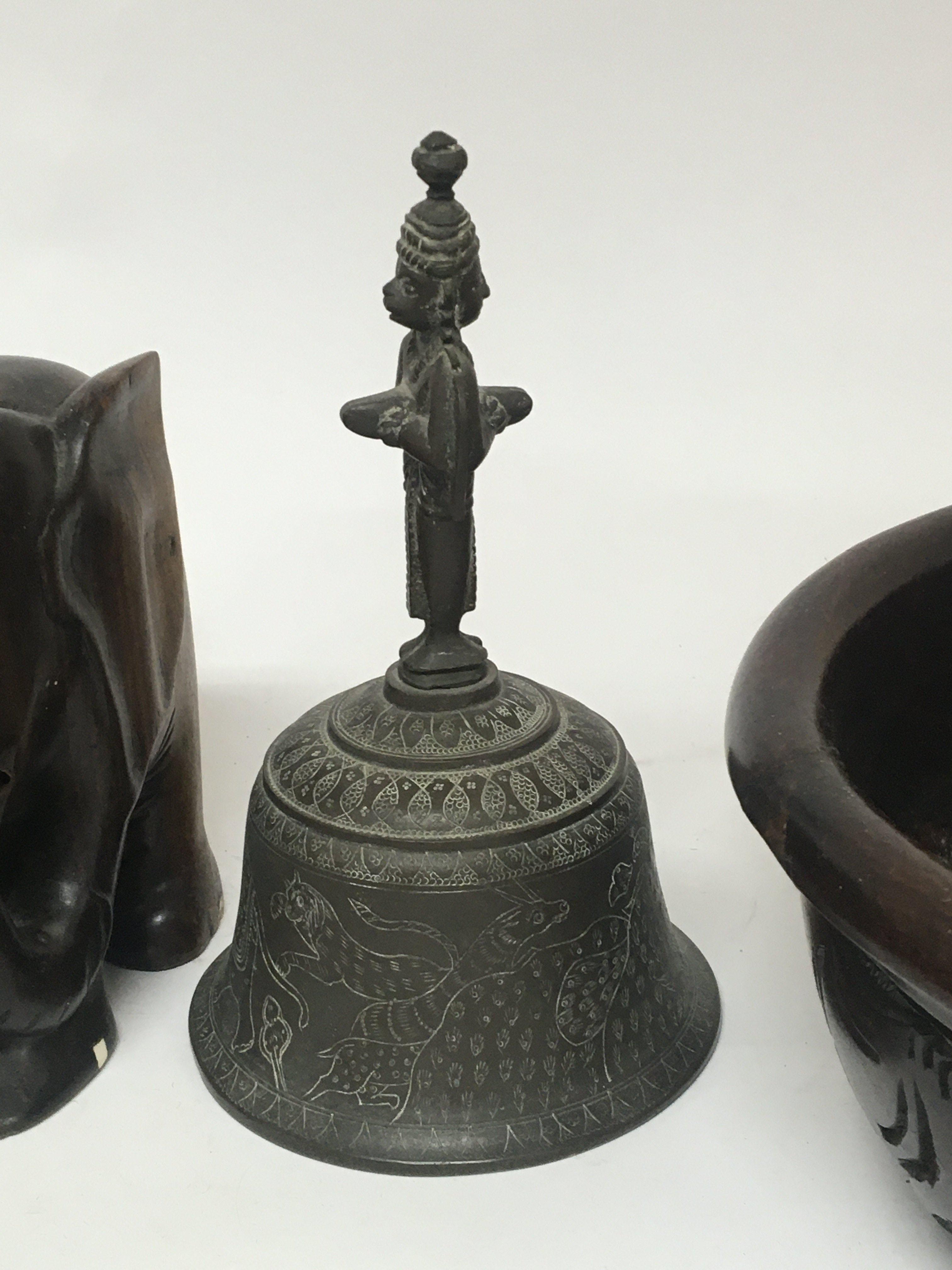 Two old Tibetan prayer wheels a carved treen bowl elephant bookends a Tibetan hand bell and other oddments. NO RESERVE