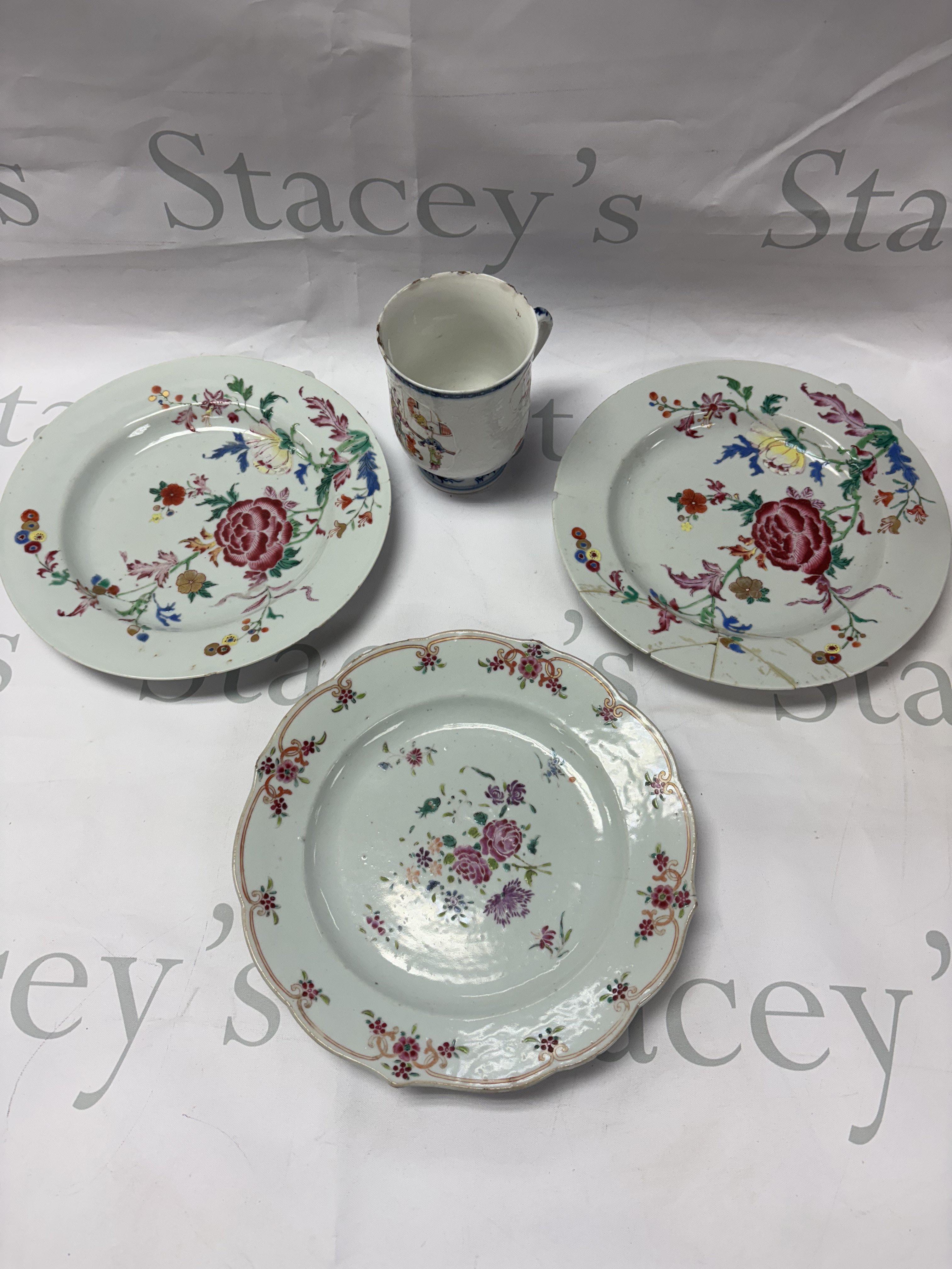 Three famille Chinese rose plates approx diameter 23cm and a mug decorated with figure. NO RESERVE
