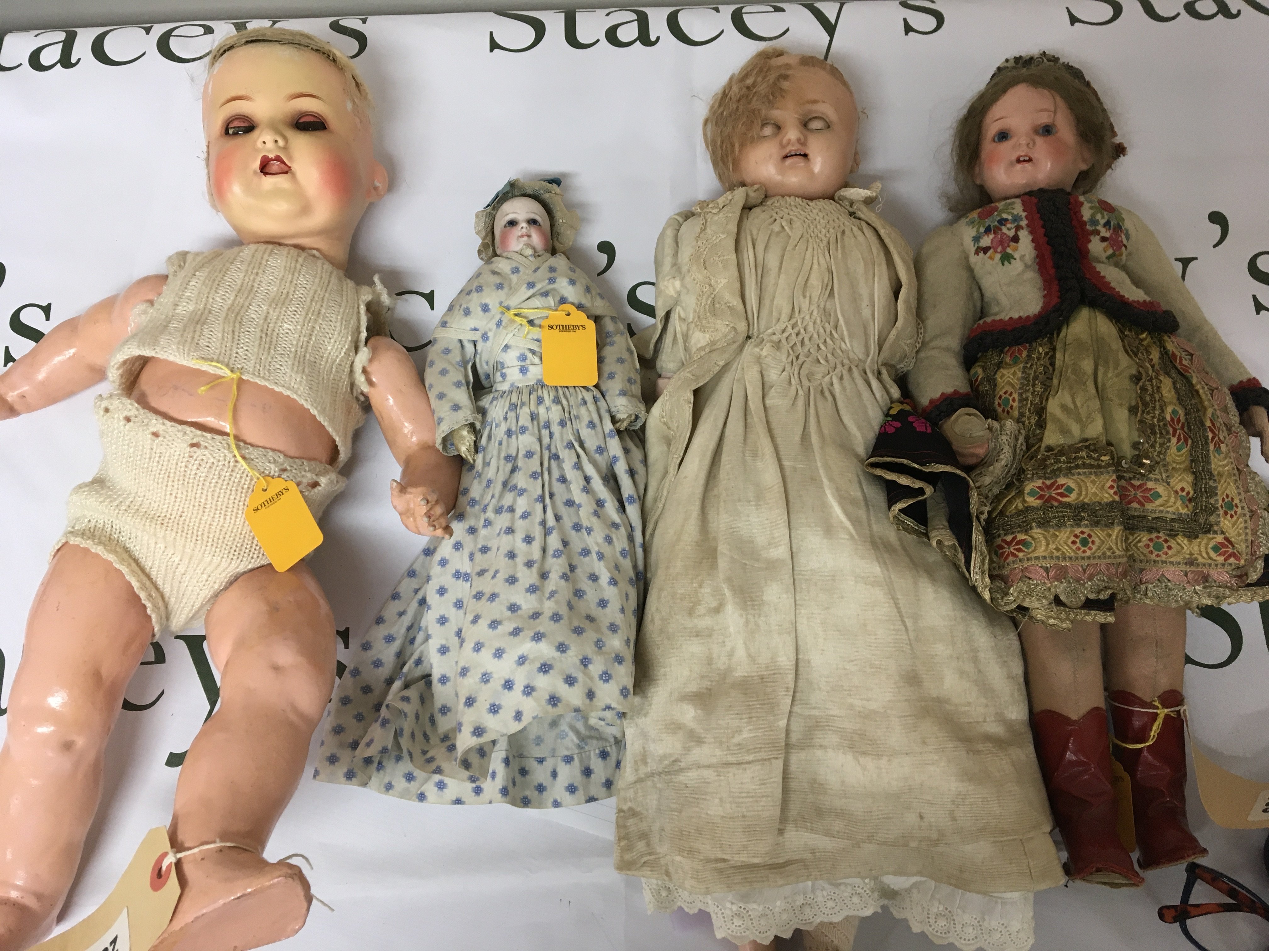 A collection of composition bisque head and wax head antique dolls including Amand Marseille 996 one other smaller German doll in Victorian dress a wax head doll and one other in traditional Continental dress (4)