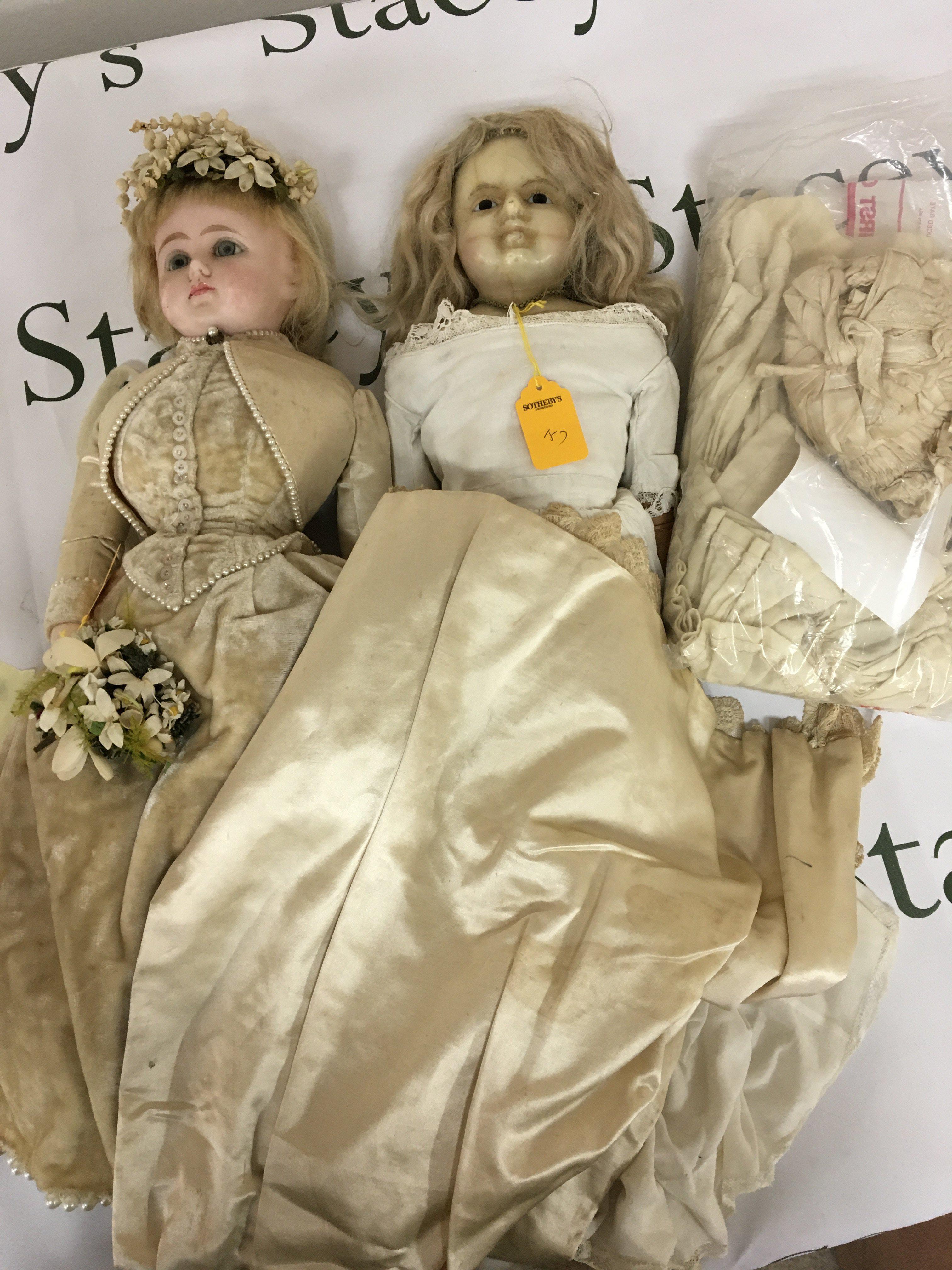Two Victorian wax head dolls one in a traditional silk and velvet wedding dress with a quantity of other dolls clothes (2)