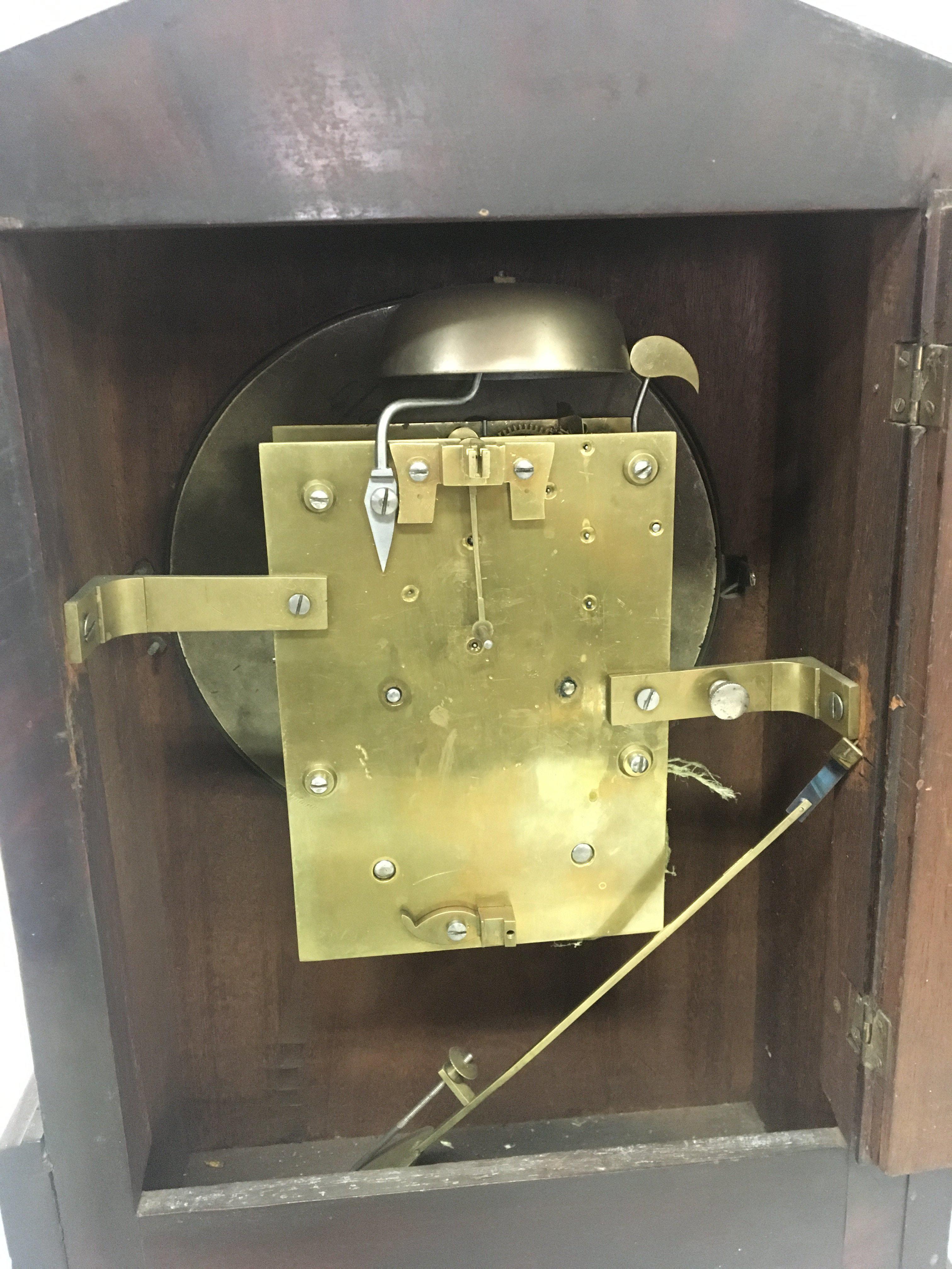 An Early Victorian mahogany mantel or bracket clock with a double fusee brass movement striking on a bell 43cm heigh. With pendulum.