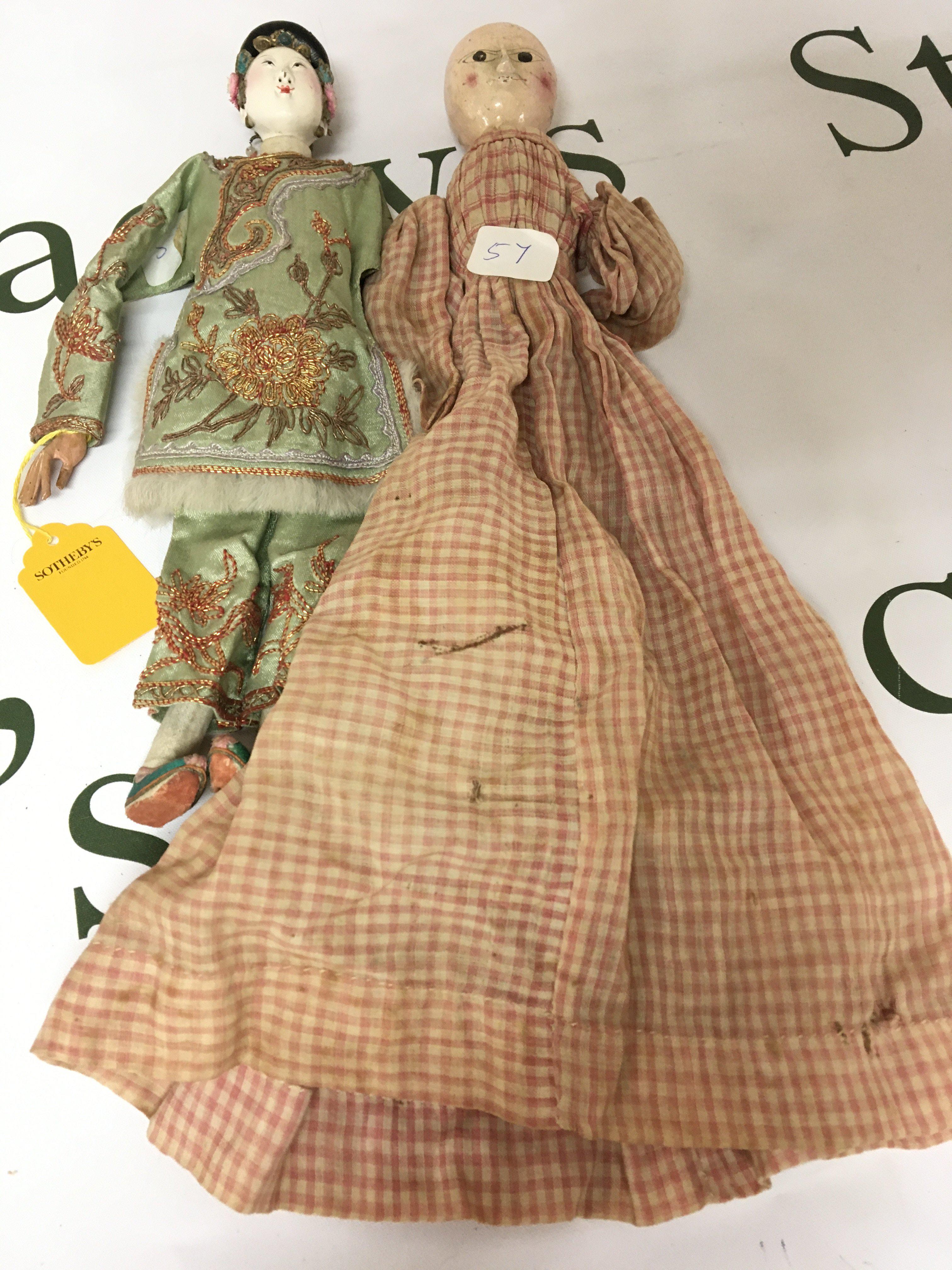 A mid Victorian or earlier painted wood peg type doll and an oriental doll in traditional dress (2)