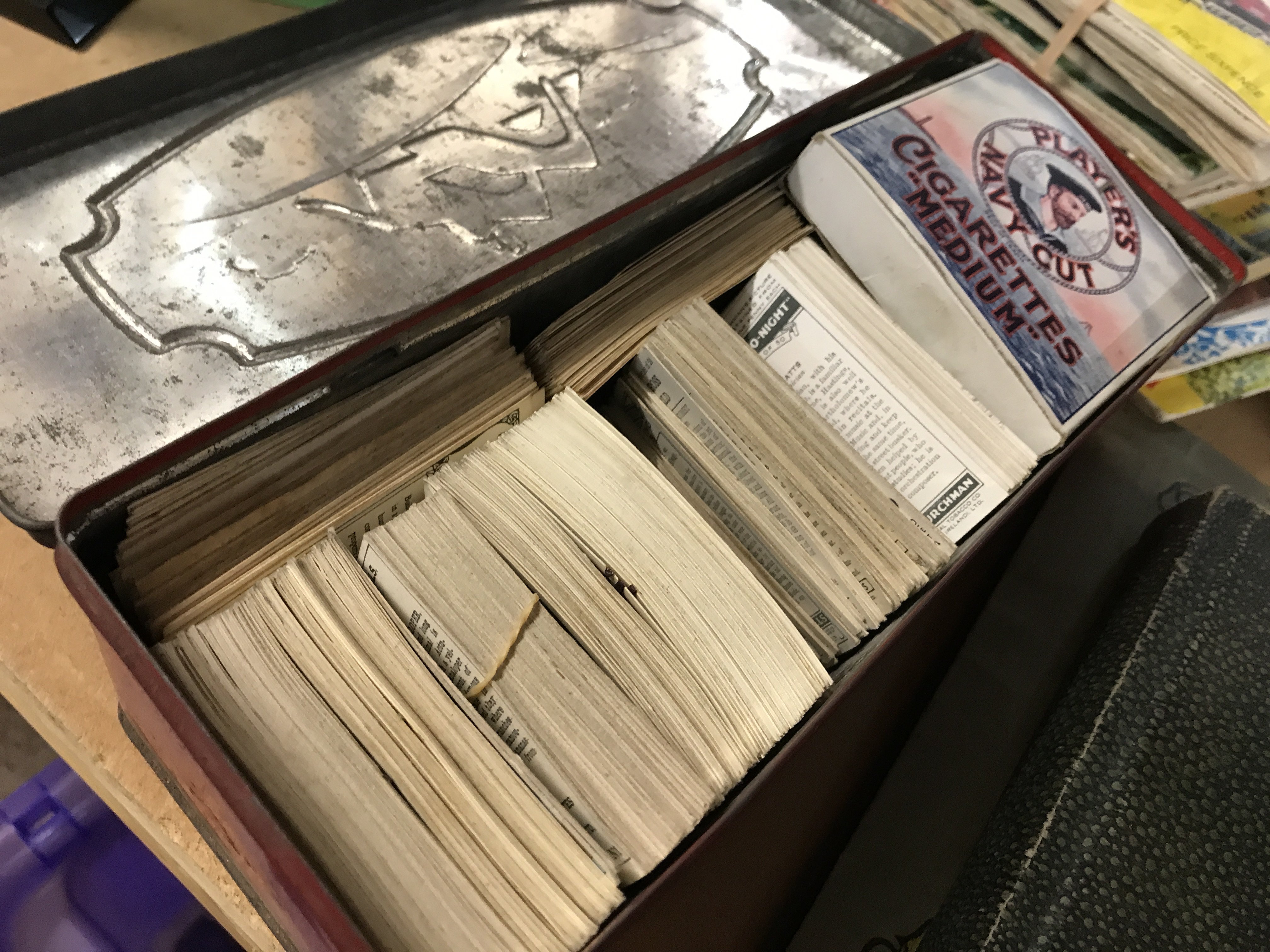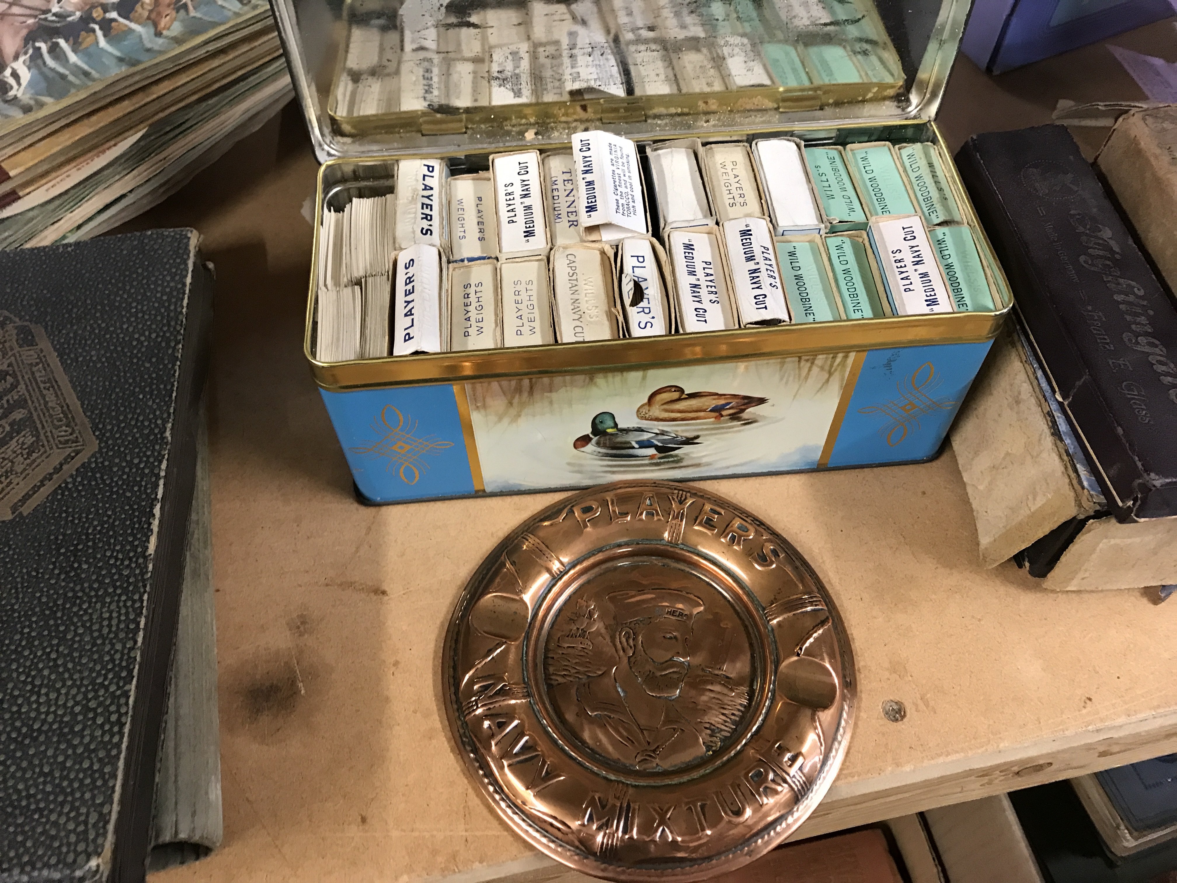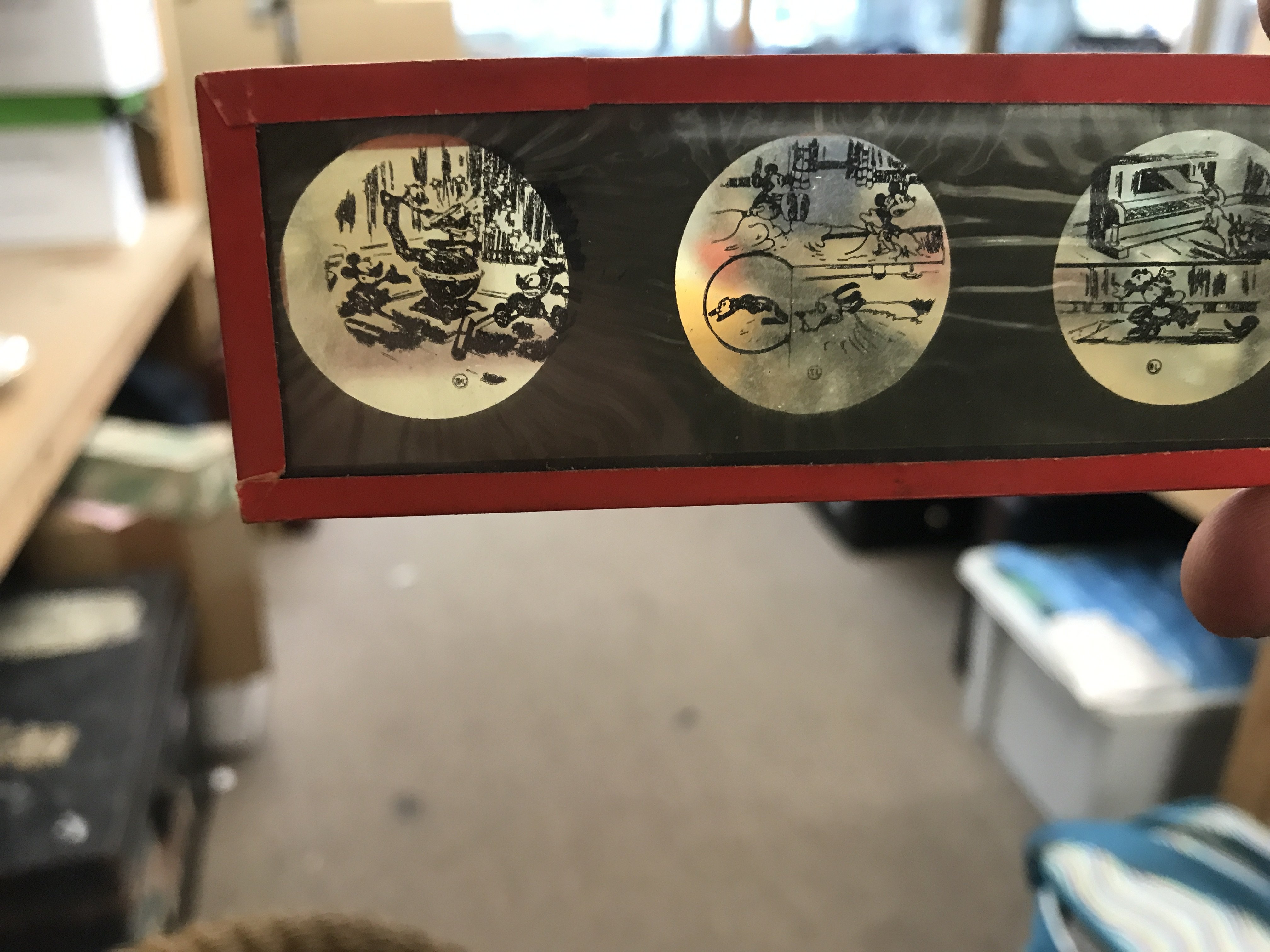 An early 20th century set of Mickey Mouse coloured slides and other vintage slides, large quantity of cigarette cards including players, copper players ashtray etc. postage category C. NO RESERVE