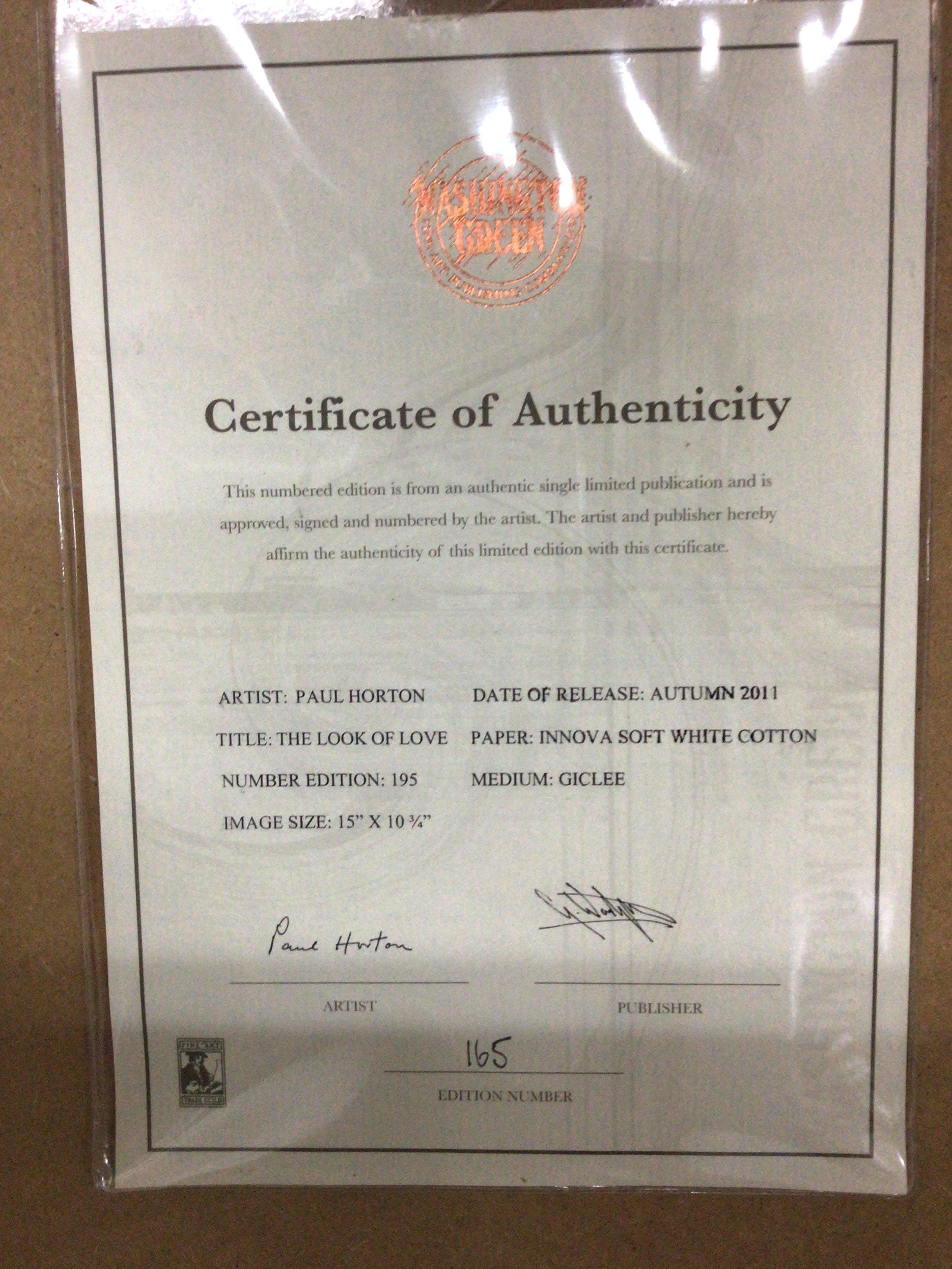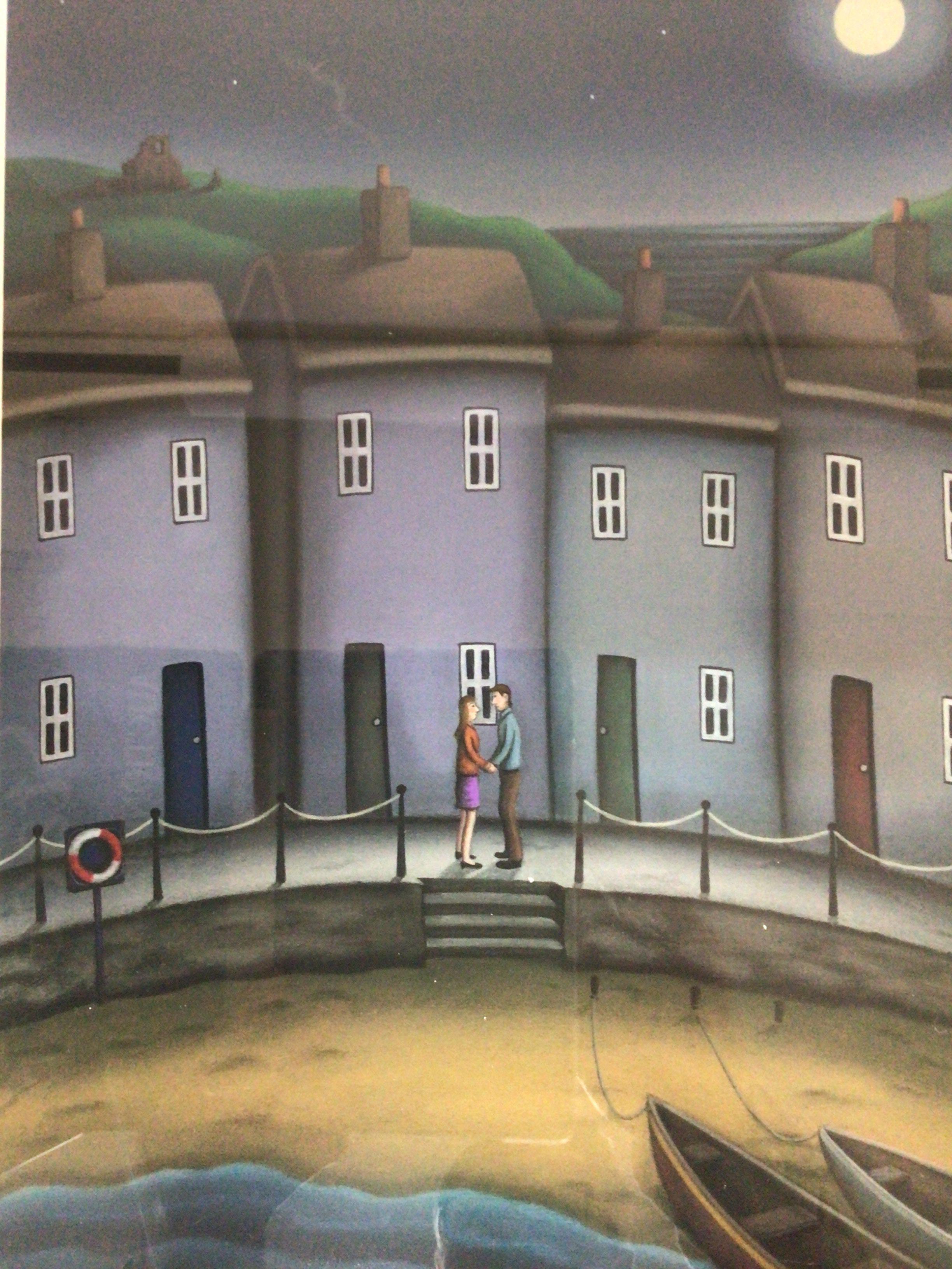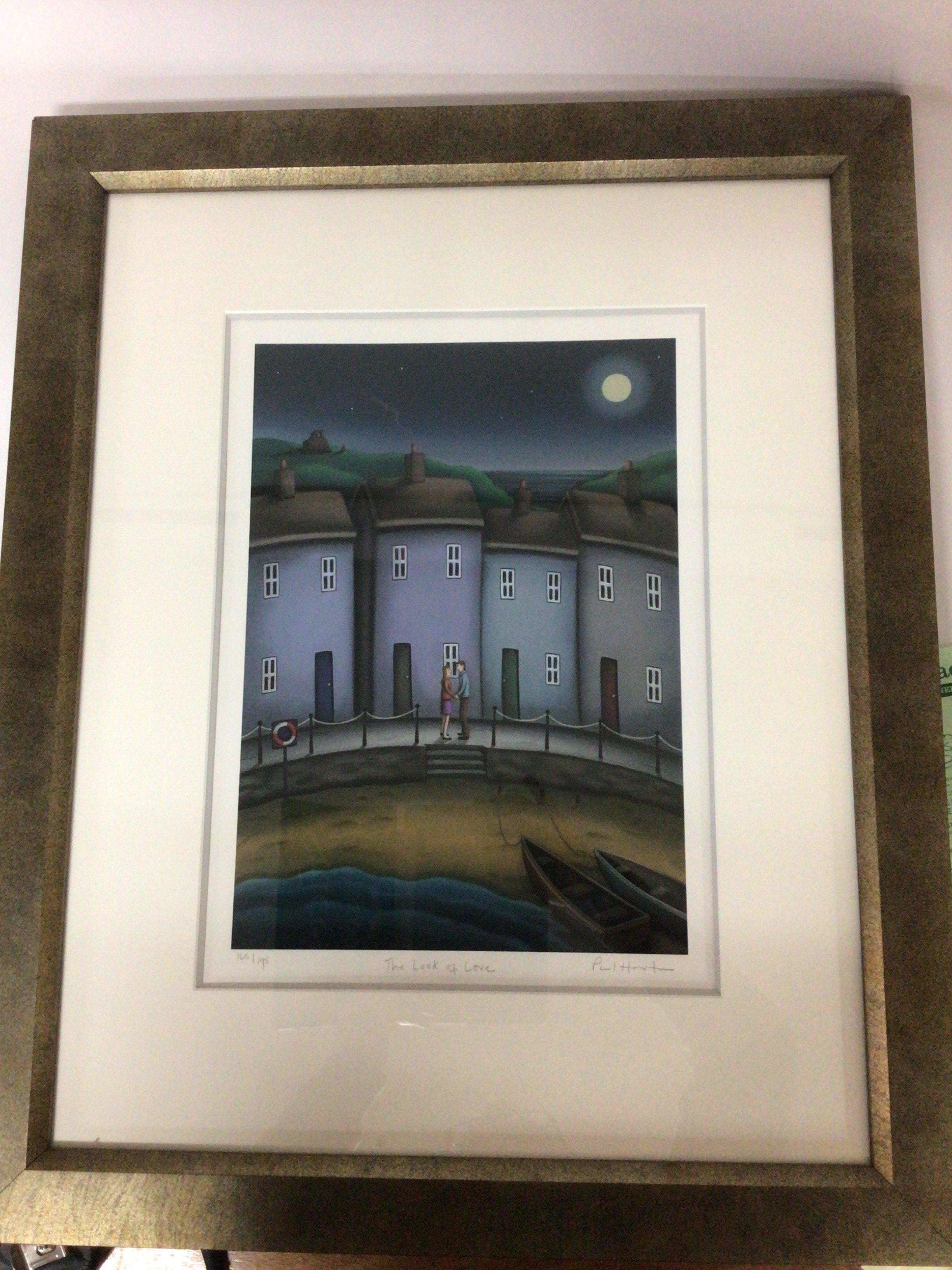 A limited edition modern art 20th century British coloured lithograph print by Paul Horton (b1958) the picture entitled The look of love with figures by a key side with buildings 165/195 signed in pencil in very good condition 57x70cm the reverse with certificate of authenticity. NO RESERVE