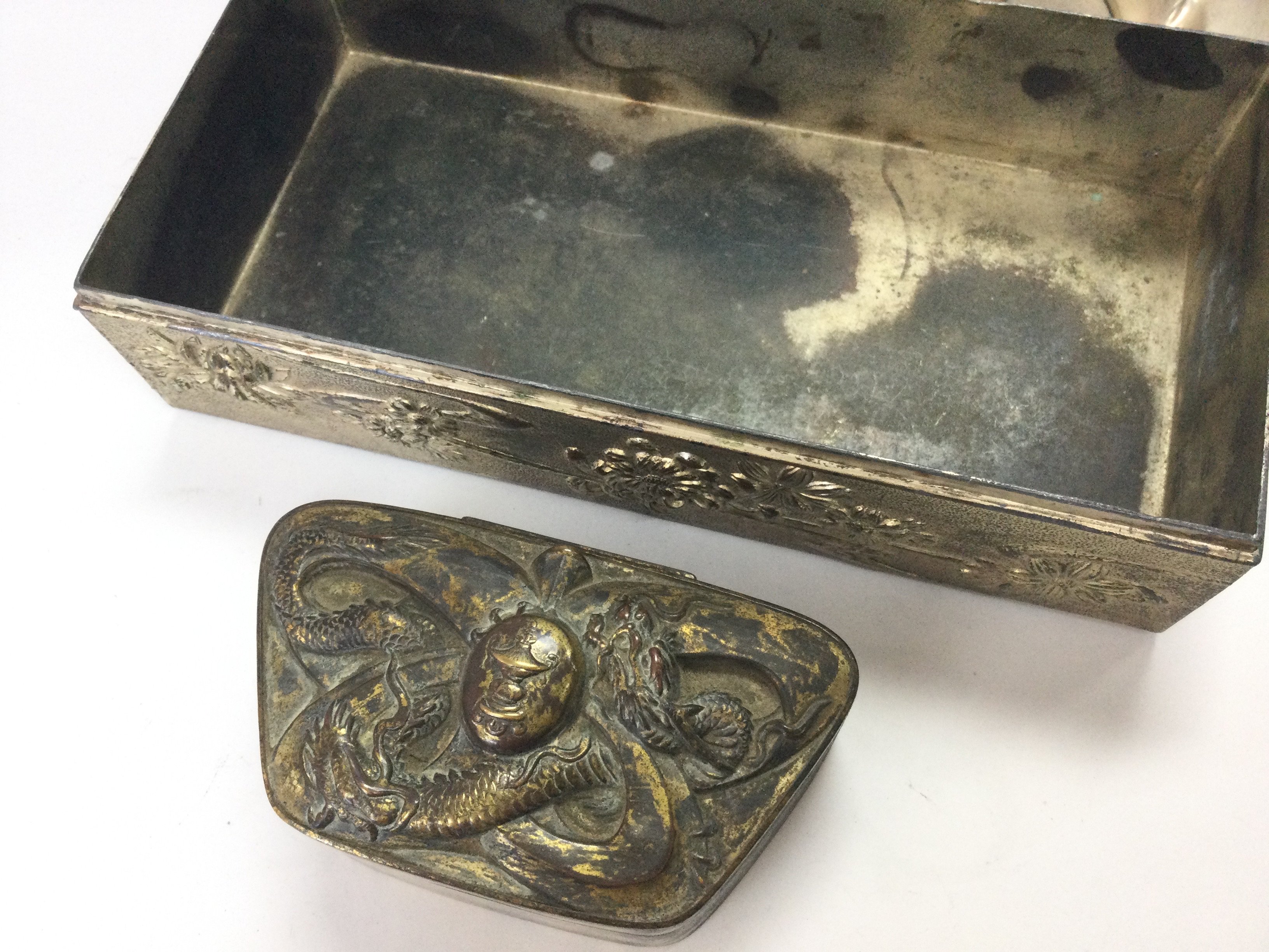 Chinese trinket box featuring Monkey and dog design (length 9cm width 18cm height 6cm) with a Chinese character and a smaller Chinese brass dragon trinket box . Postage category B. NO RESERVE