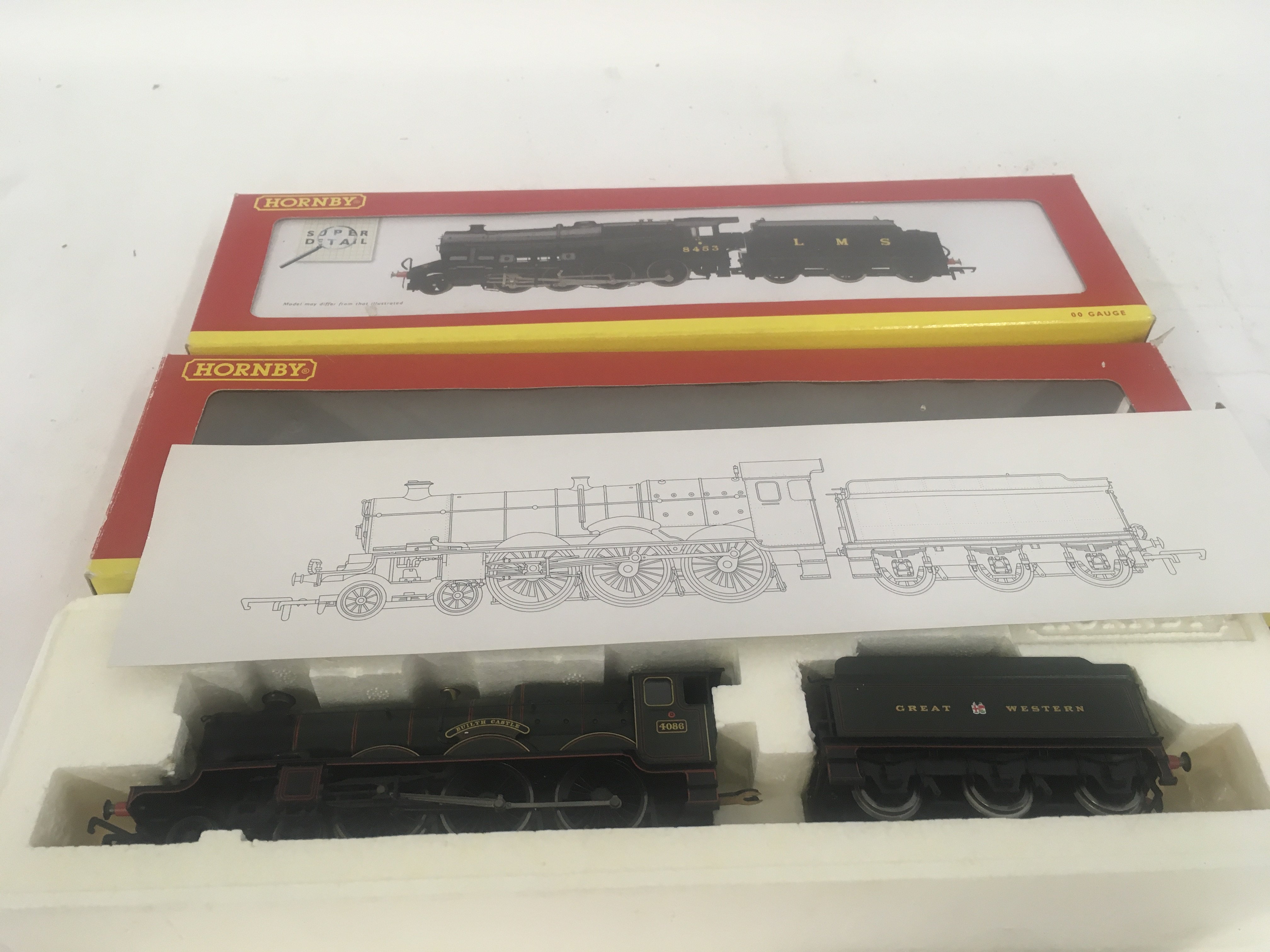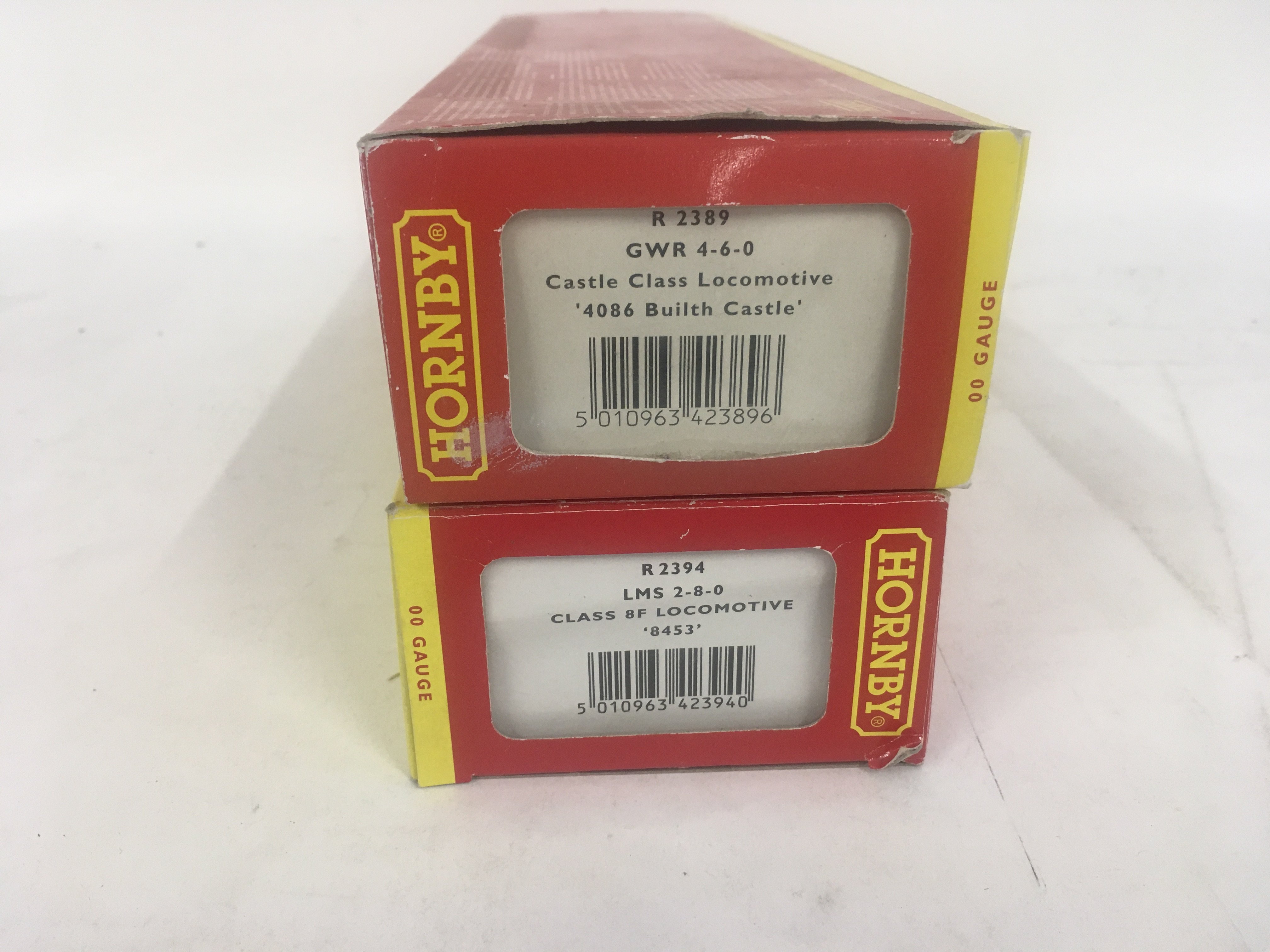 2 x boxed 00 gauge model railway locomotives by Hornby including R2389 Builth Castle and R2394 class 8F. No reserve