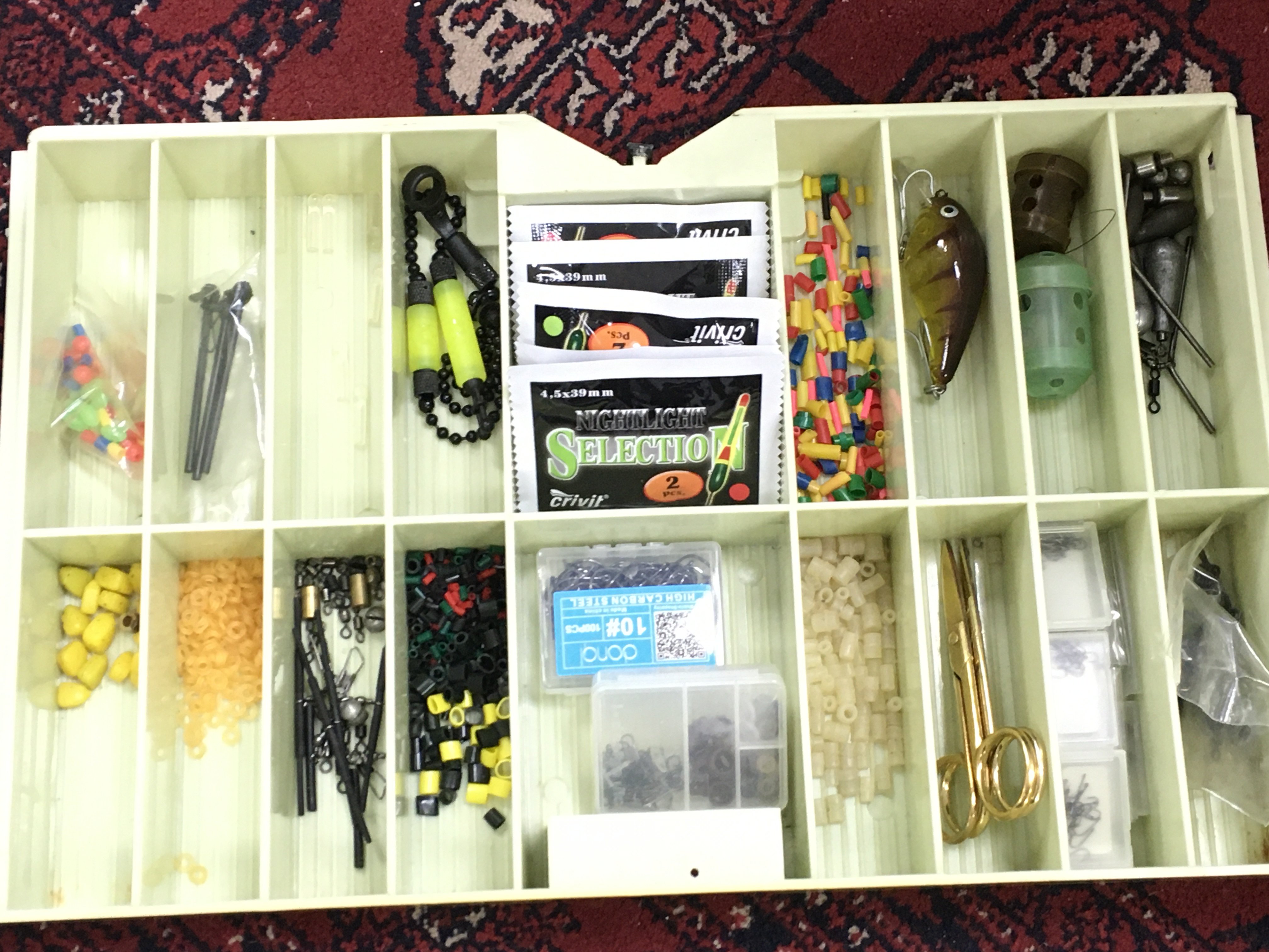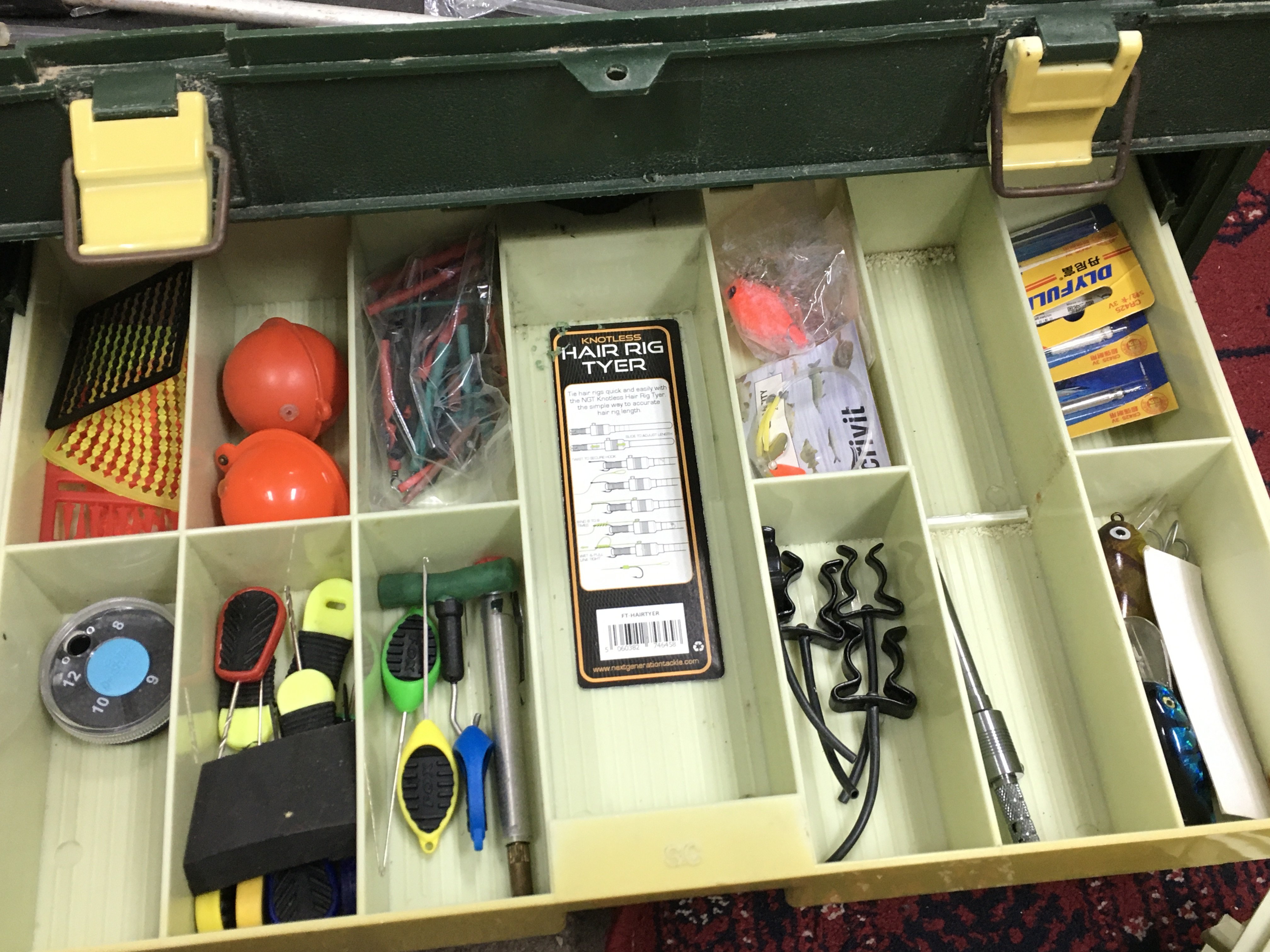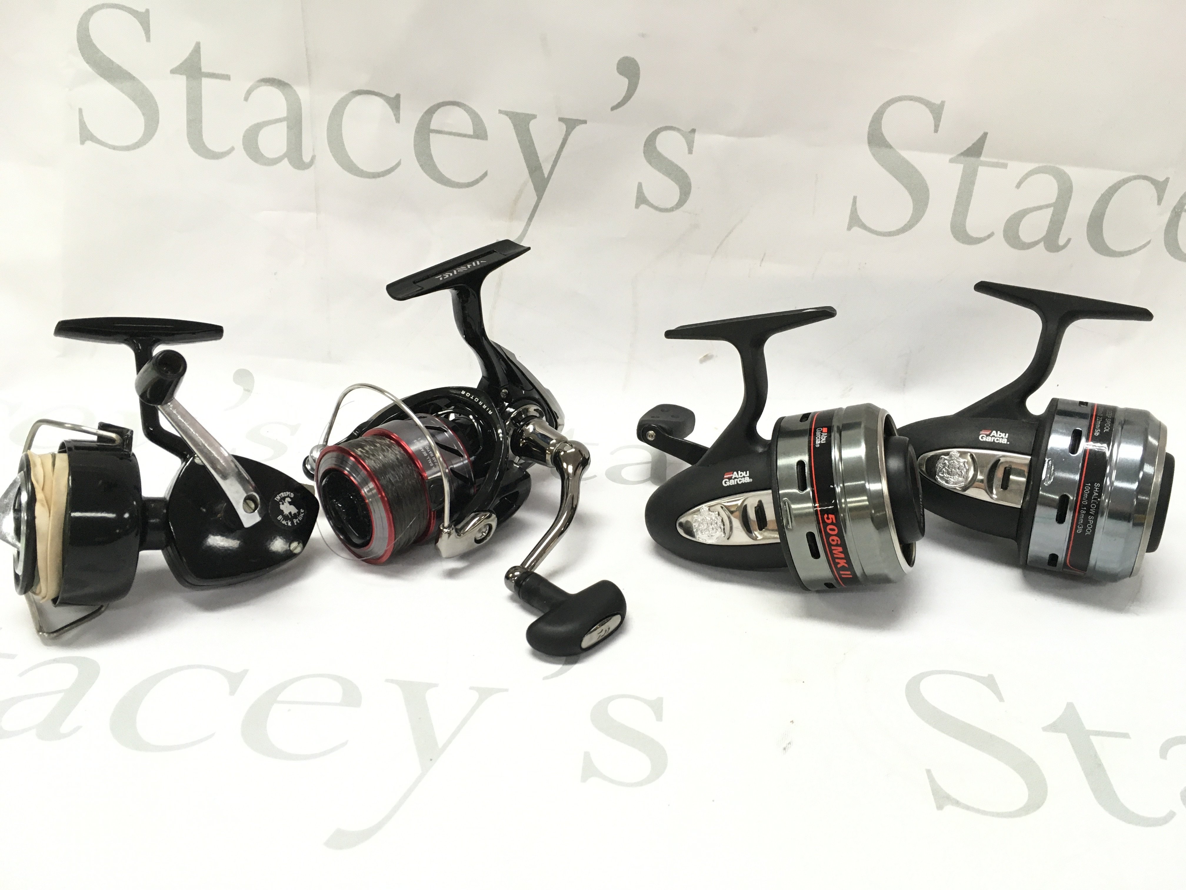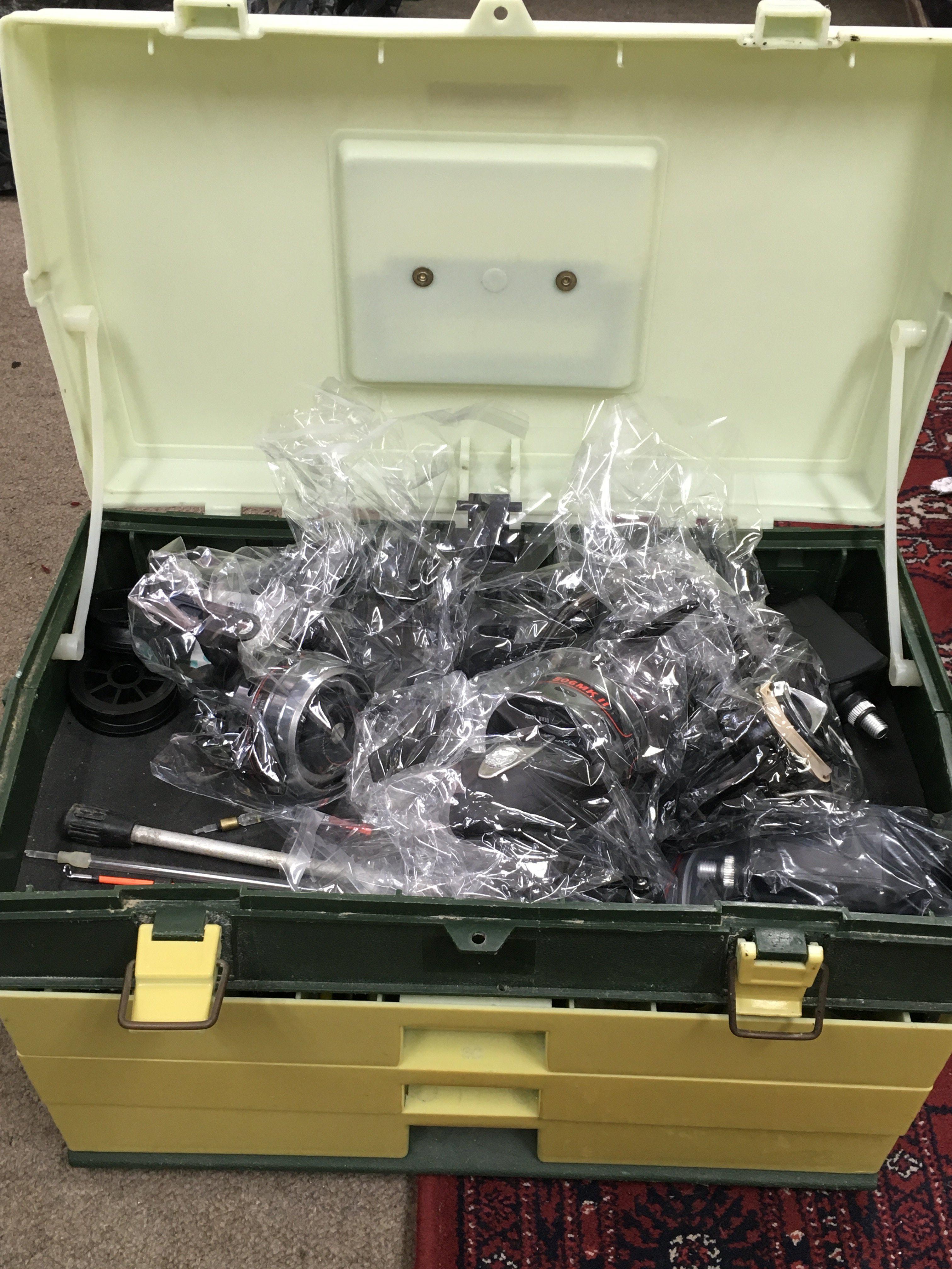A Shakespeare tackle box including fishing reels Abu Garcia 506MK II, Intrepid Black prince, Daiwa Ninja Match 2508a and a collection of floats other equipment. Postage category C