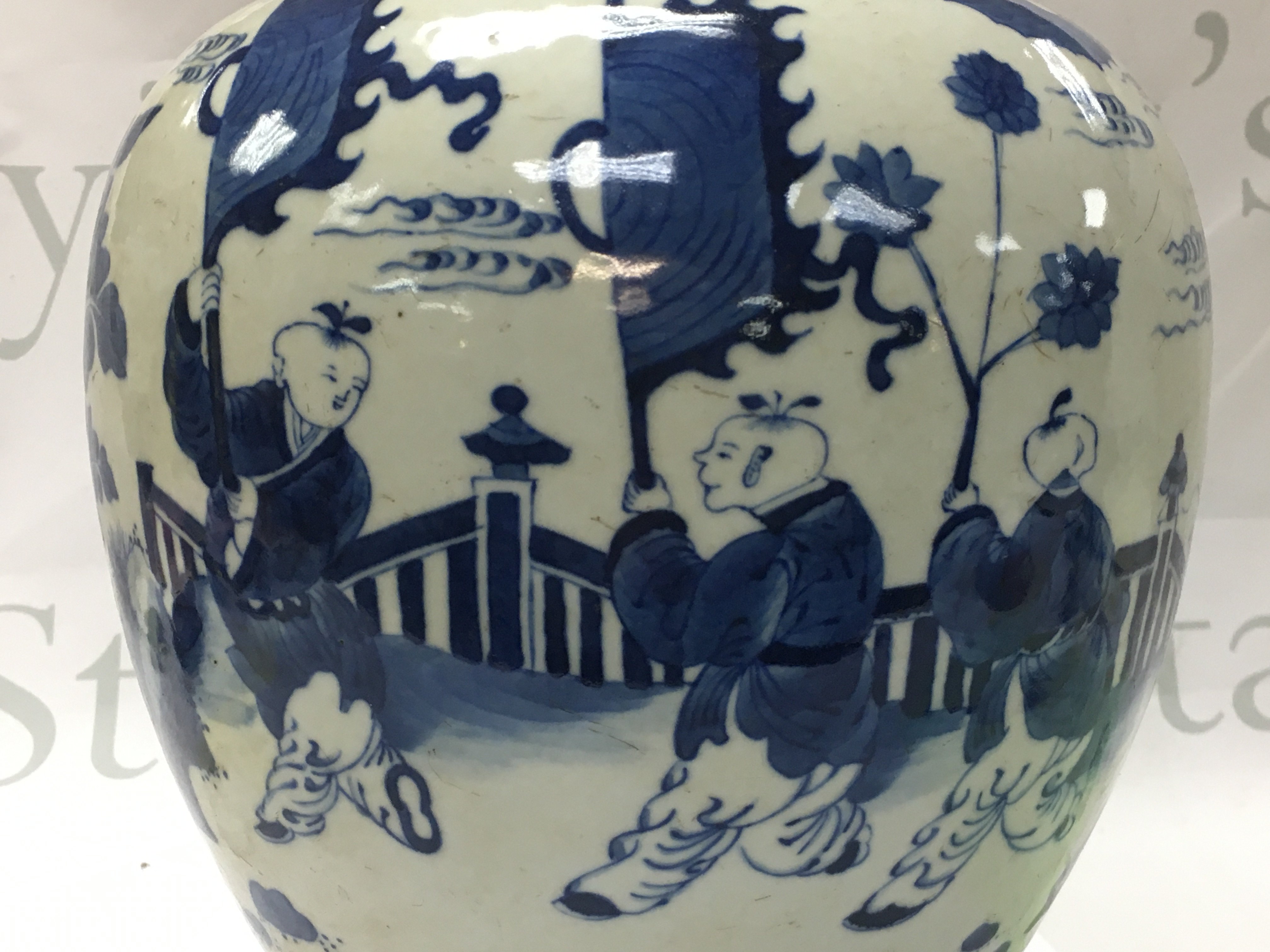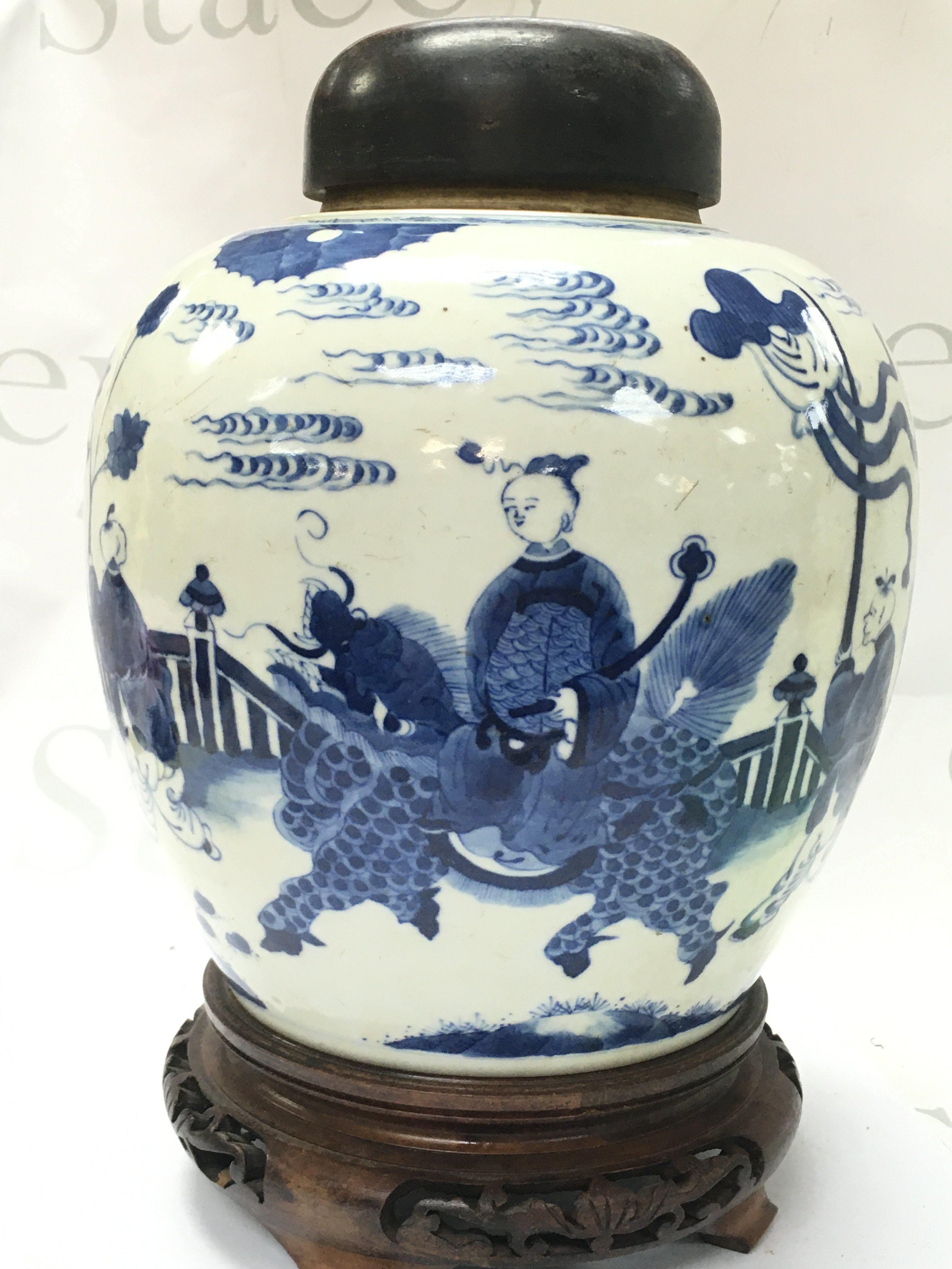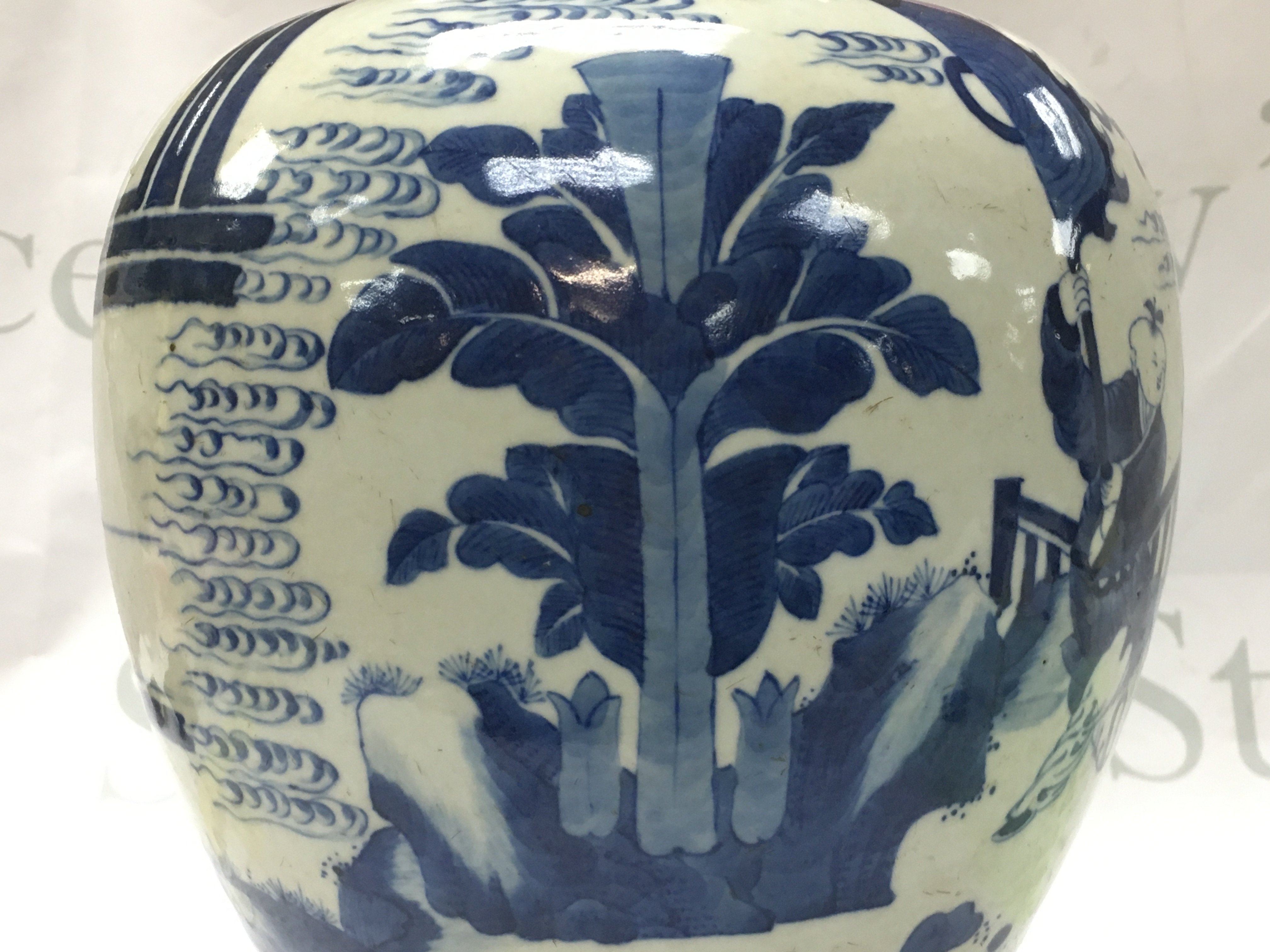 WITHDRAWN - a Export Chinese blue and white ginger jar with ceremonial scene design. This lot cannot be posted